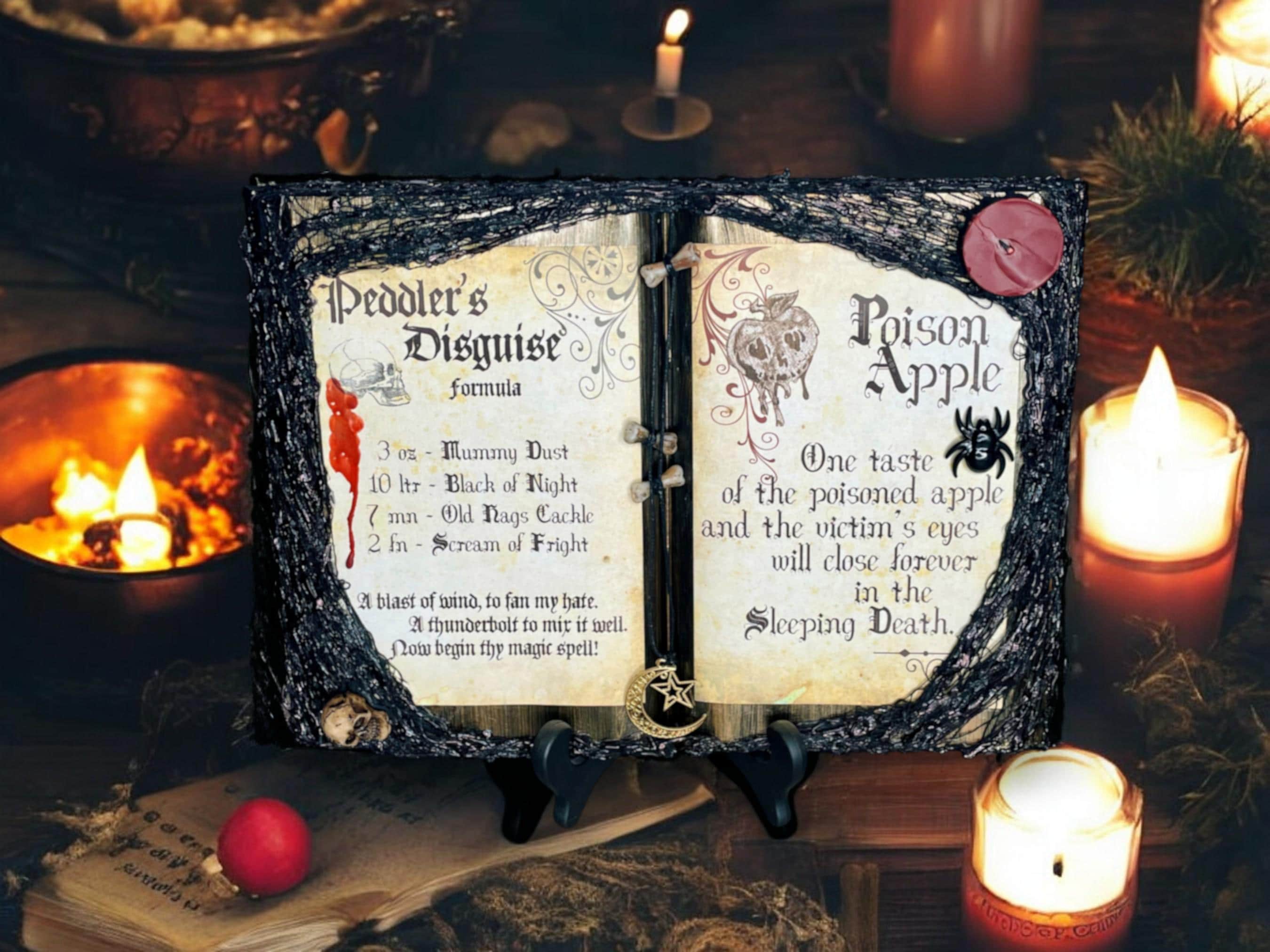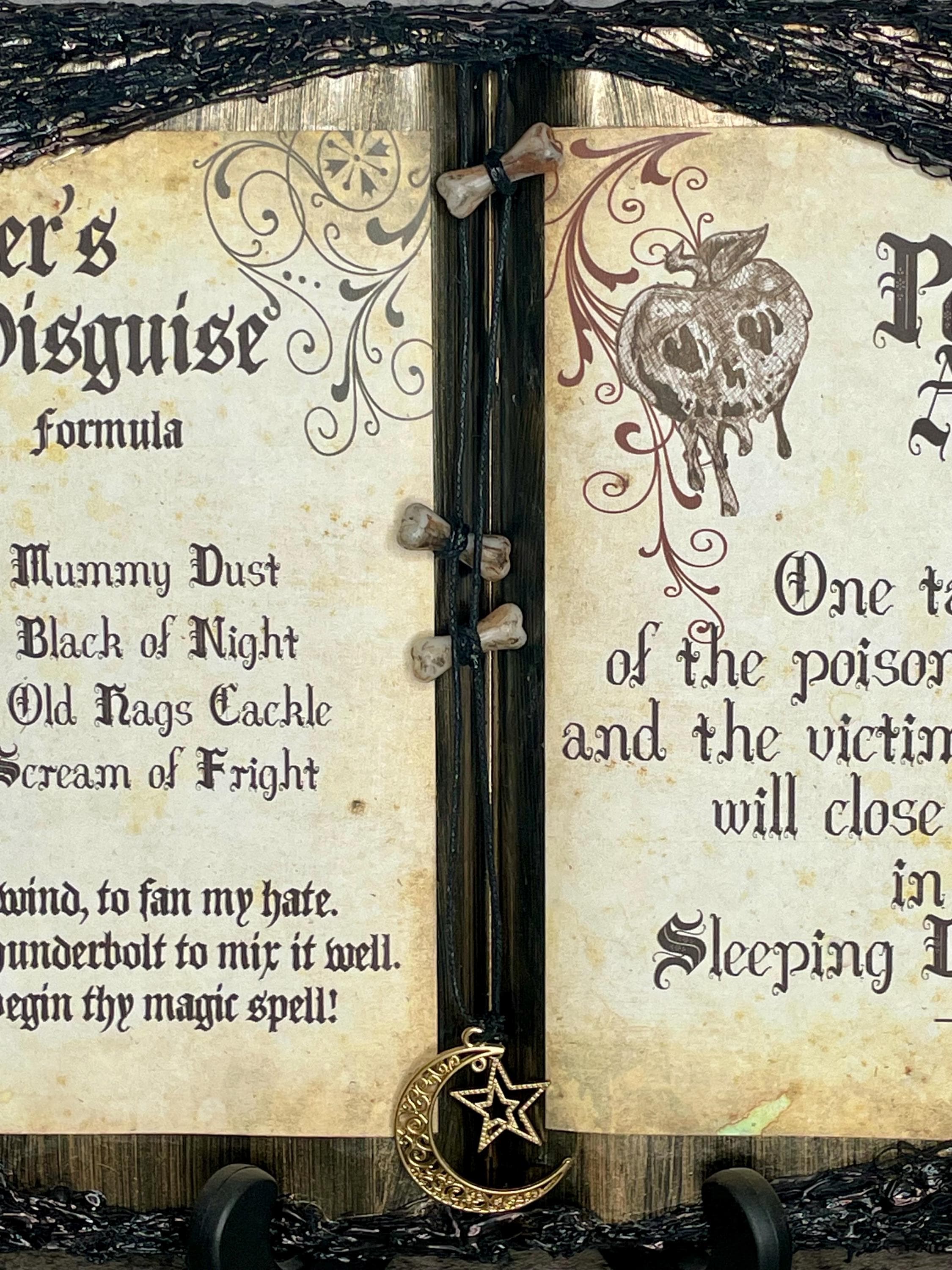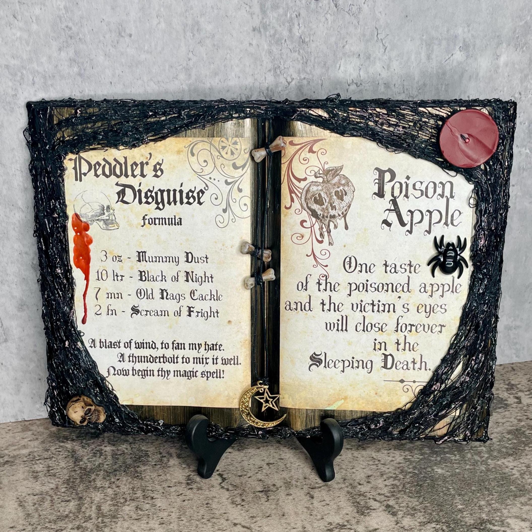 Snow-White themed spell book features the peddler's disguise and poison apple spells with bone, moon, star, spider, and candle embellishments. Whether looking to add a little fairy tale to your party or everyday décor, this item is sure make a unique addition to any home.