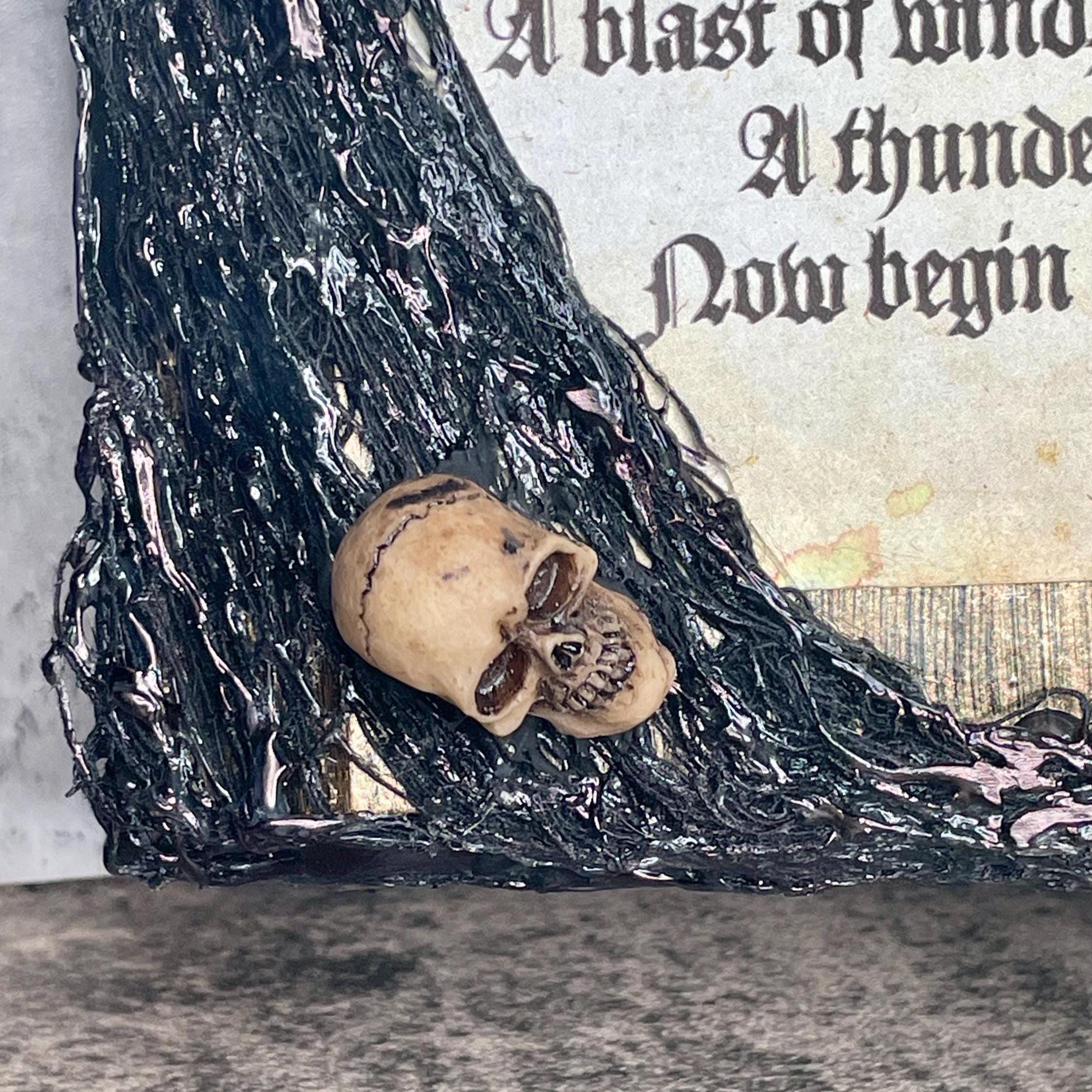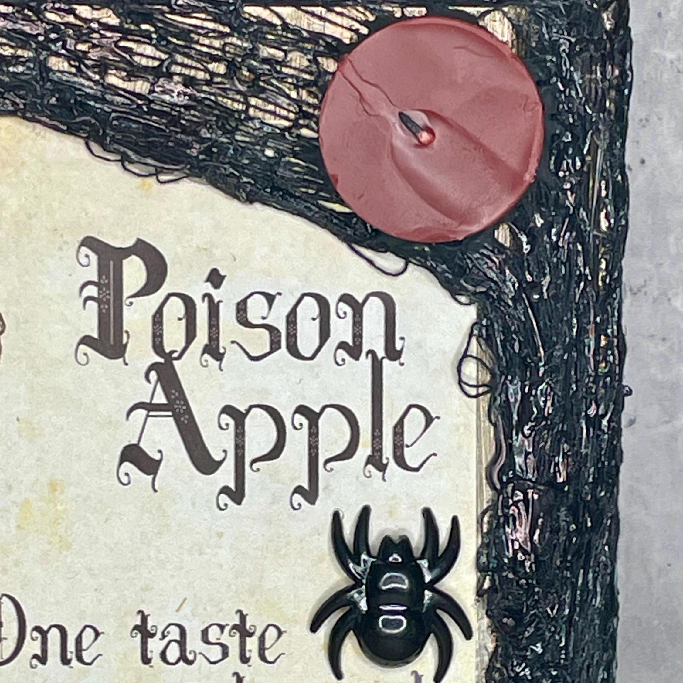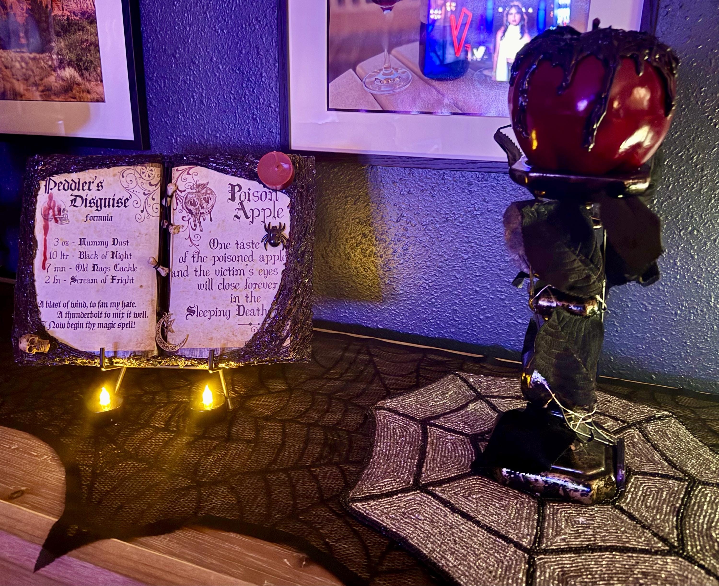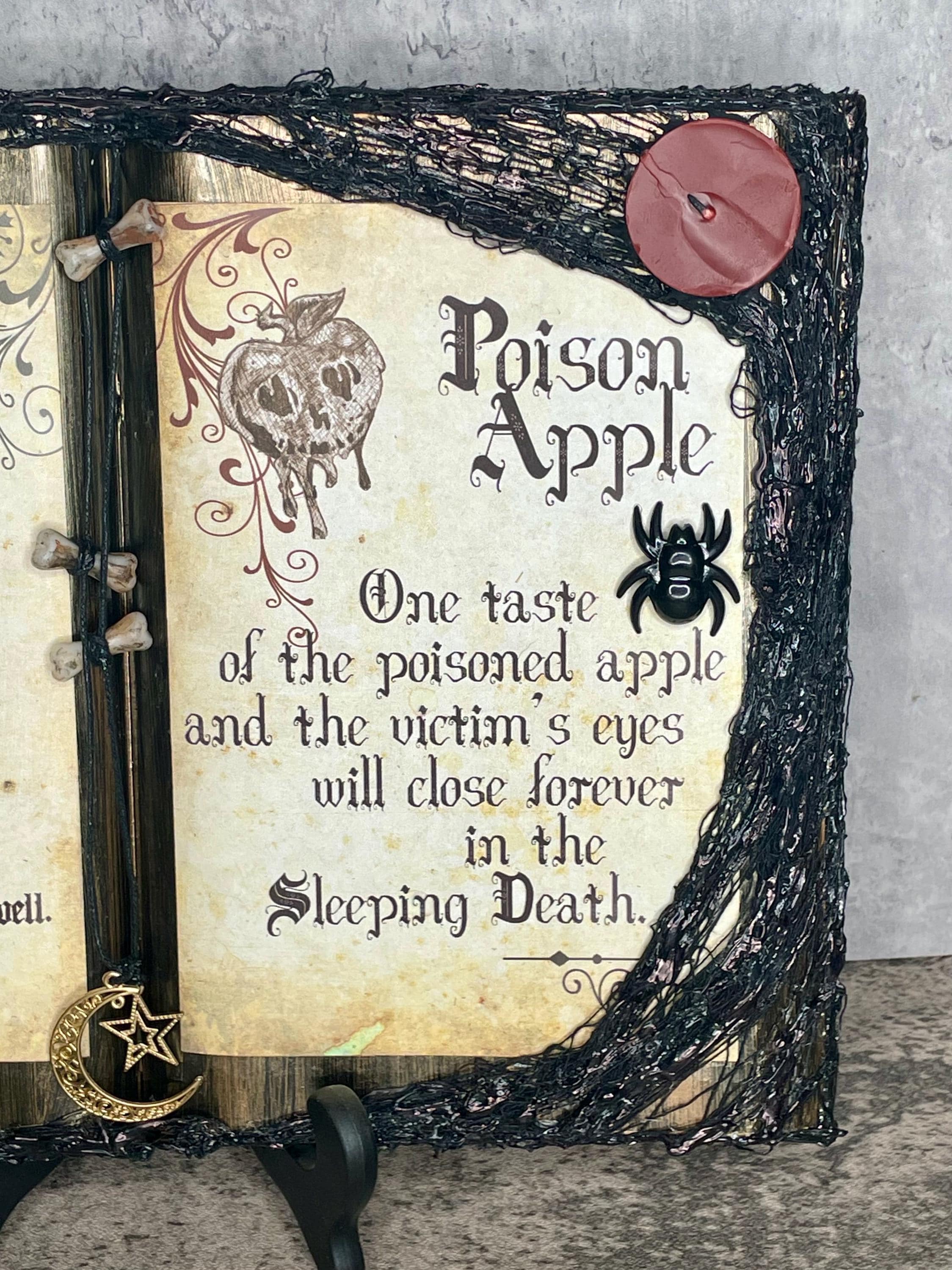 Snow-White themed spell book features the peddler's disguise and poison apple spells with bone, moon, star, spider, and candle embellishments. Whether looking to add a little fairy tale to your party or everyday décor, this item is sure make a unique addition to any home.