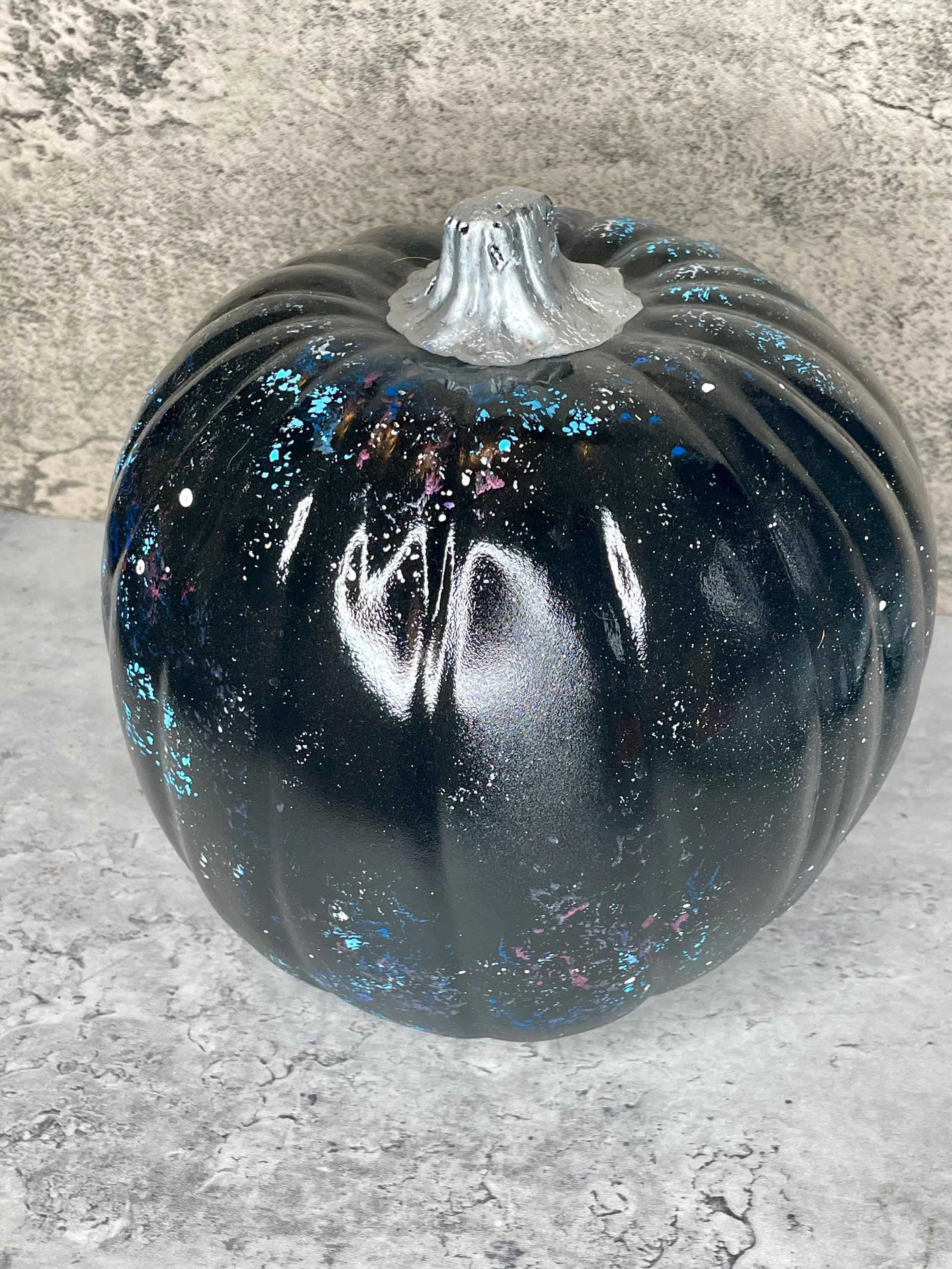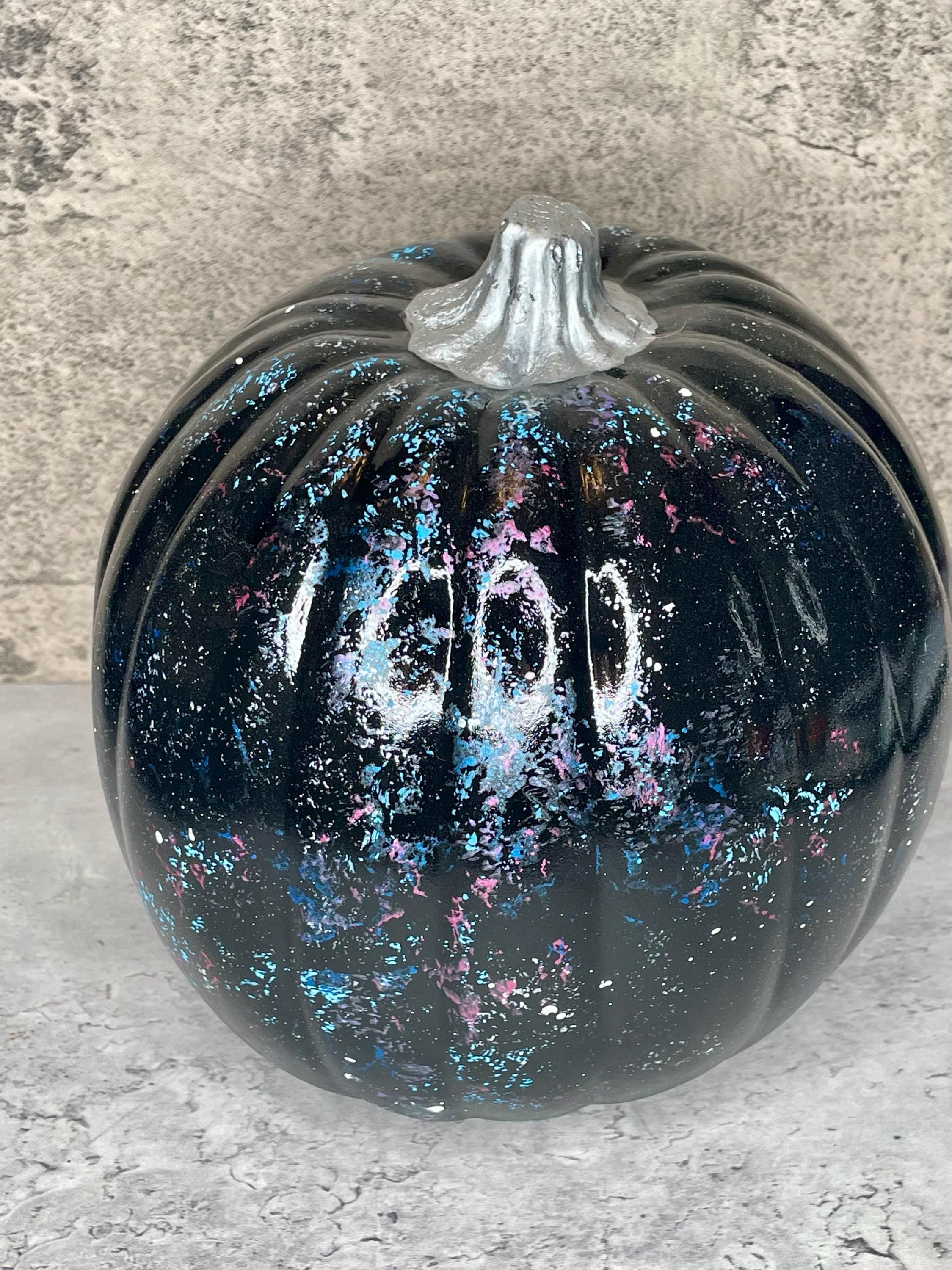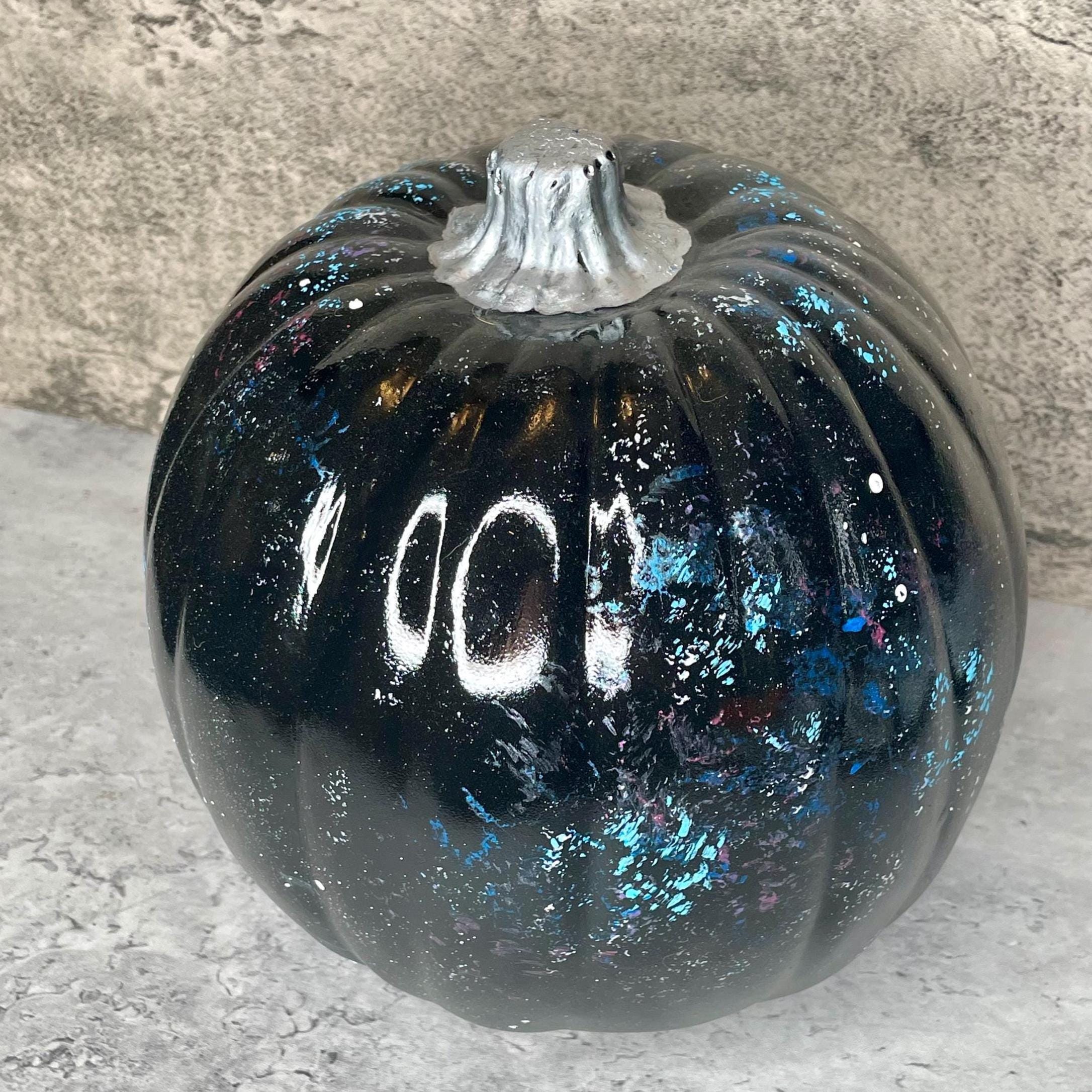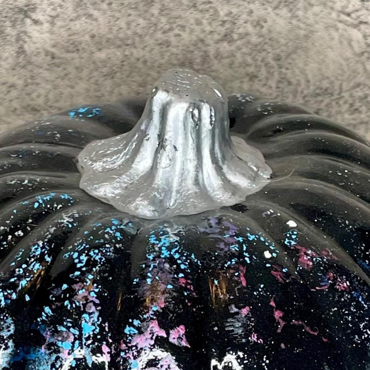 Galaxy inspired pumpkin centerpiece features a silver stem and hand-painted details. Supernovas include shades of blue, pink, and purple with white stars stippling to complete the look. A beautifully spooky accent, perfect for experiencing Halloween every day!