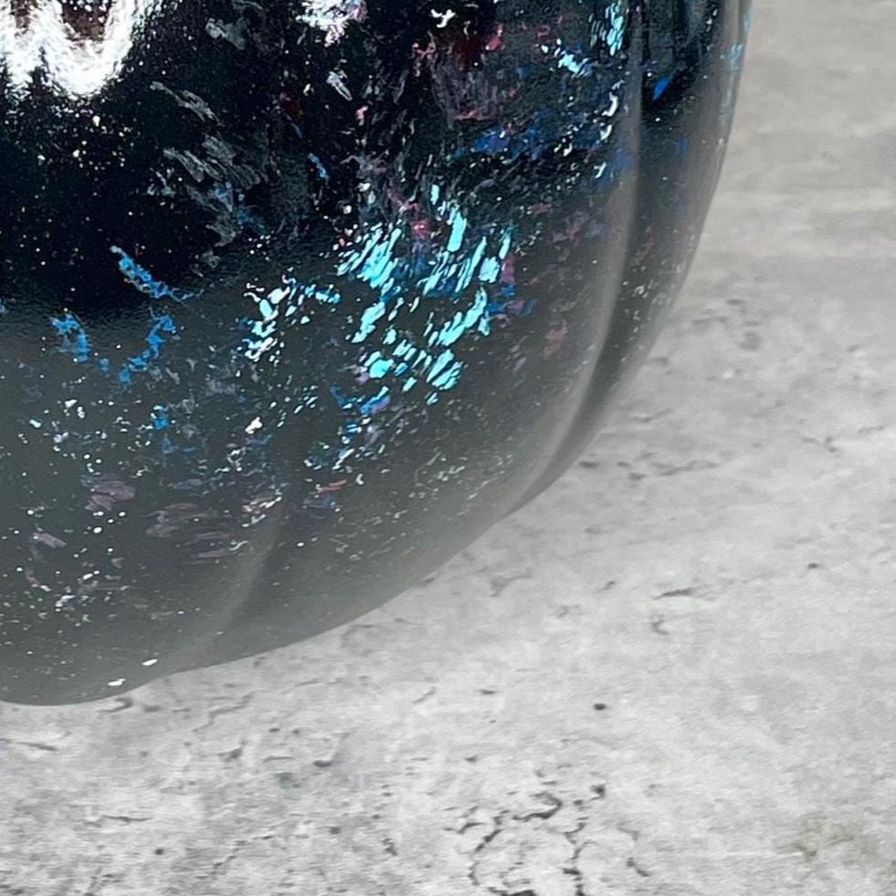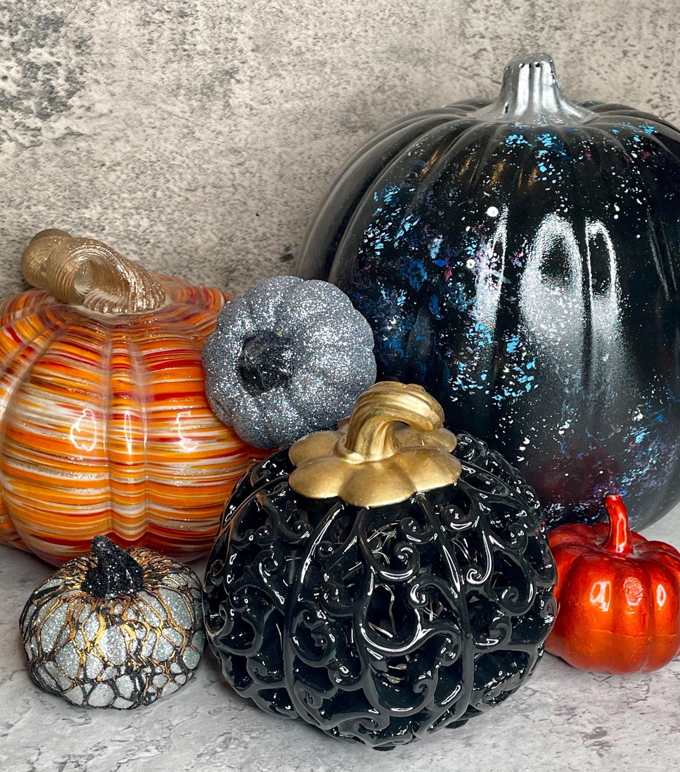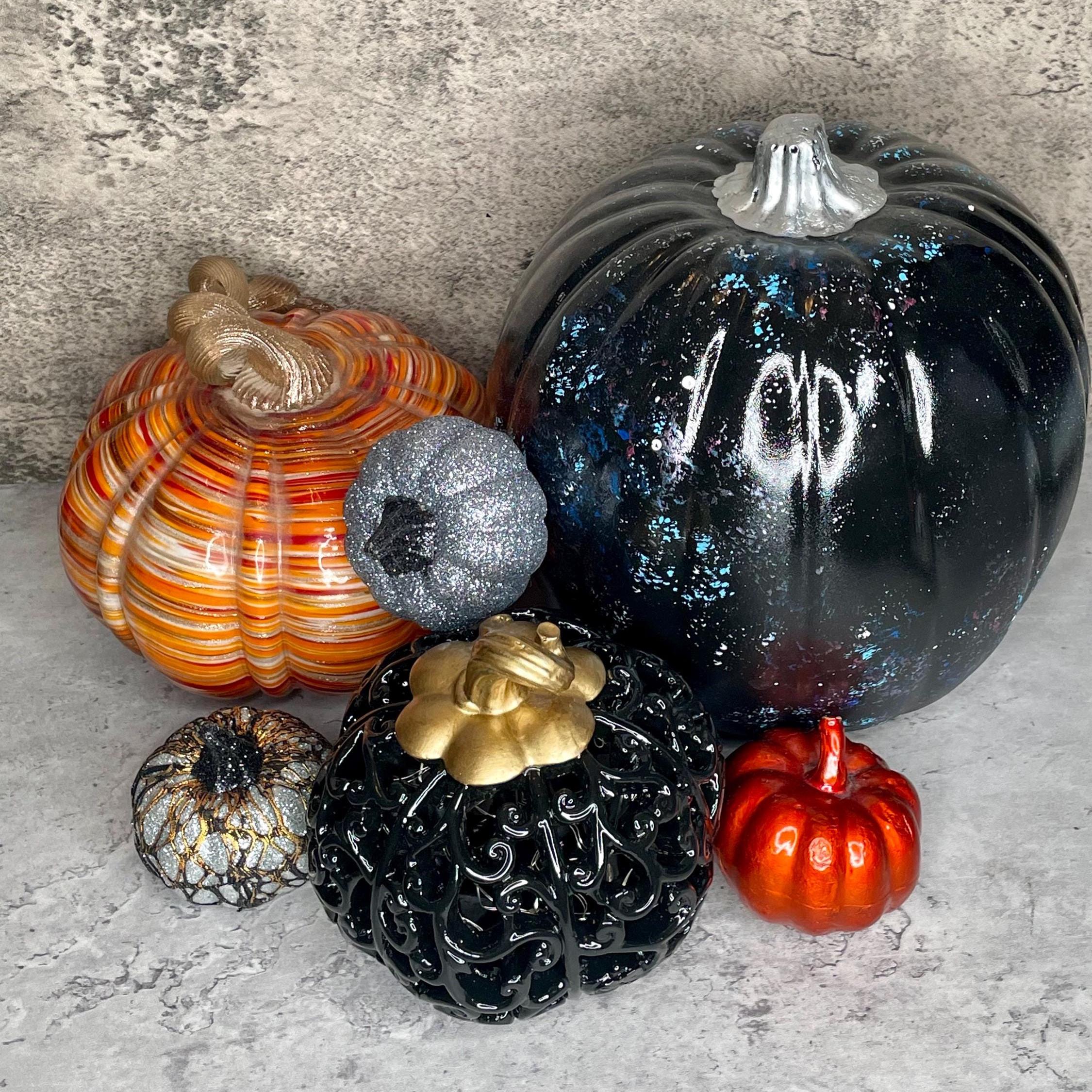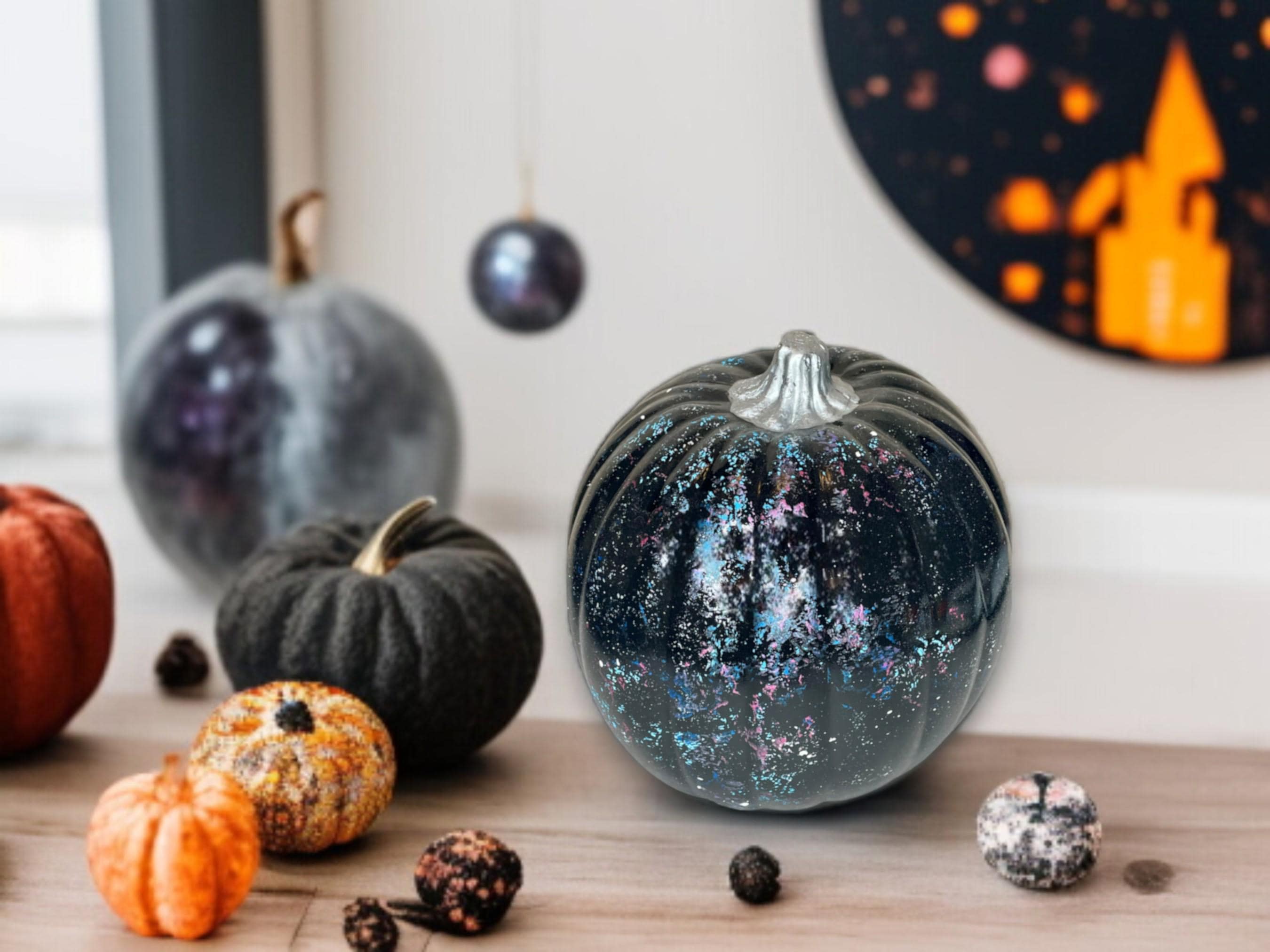 Galaxy inspired pumpkin centerpiece features a silver stem and hand-painted details. Supernovas include shades of blue, pink, and purple with white stars stippling to complete the look. A beautifully spooky accent, perfect for experiencing Halloween every day!
