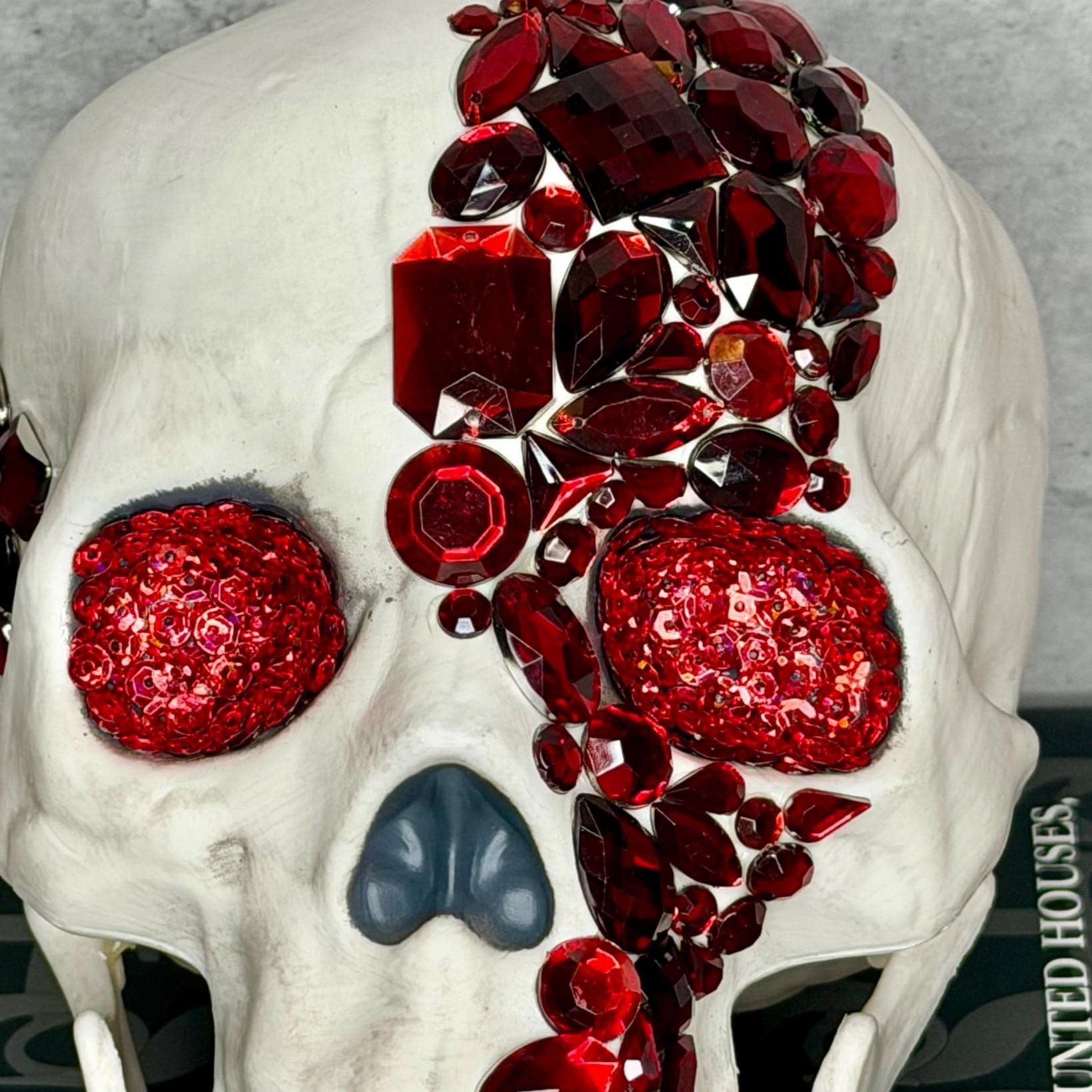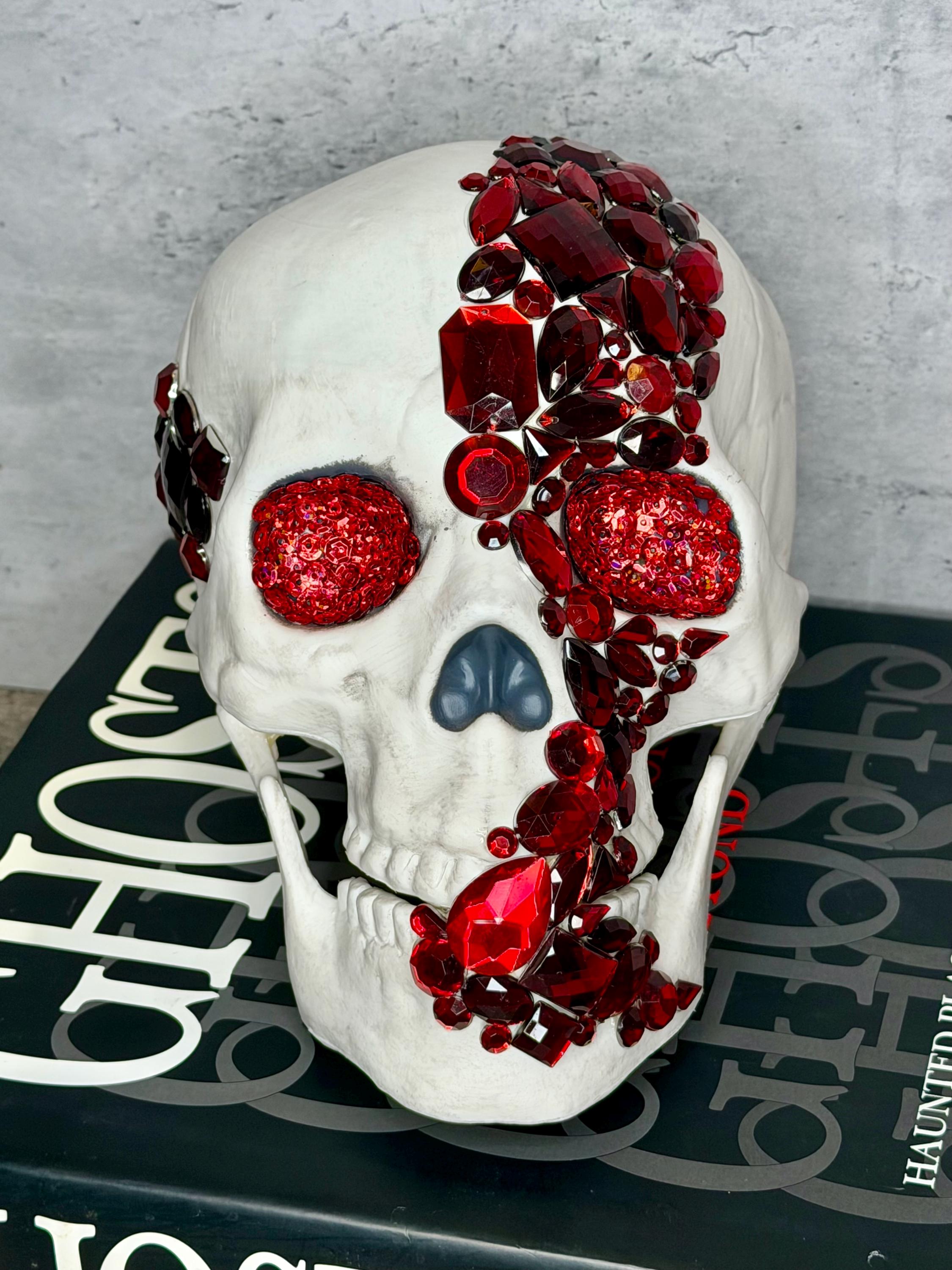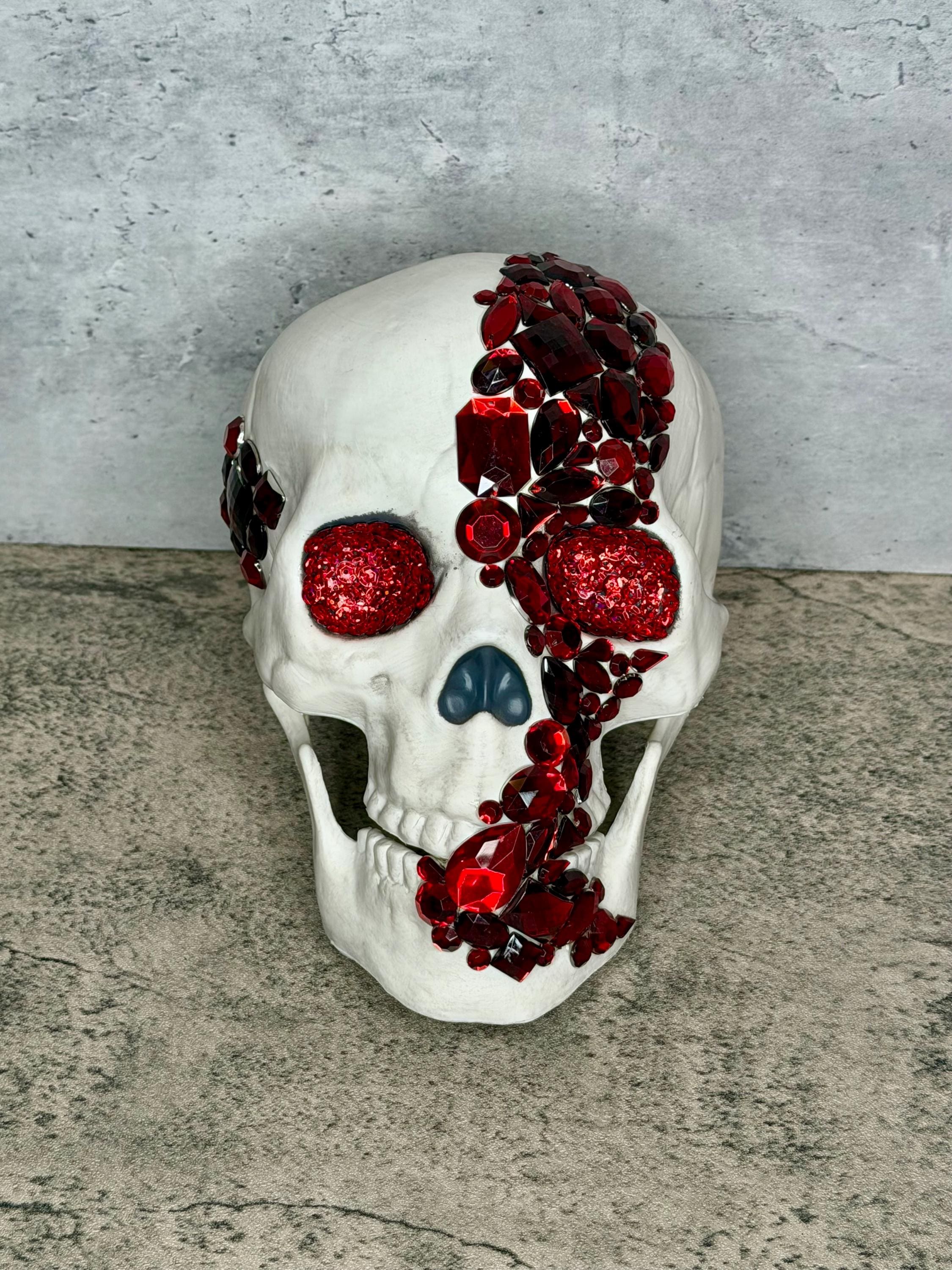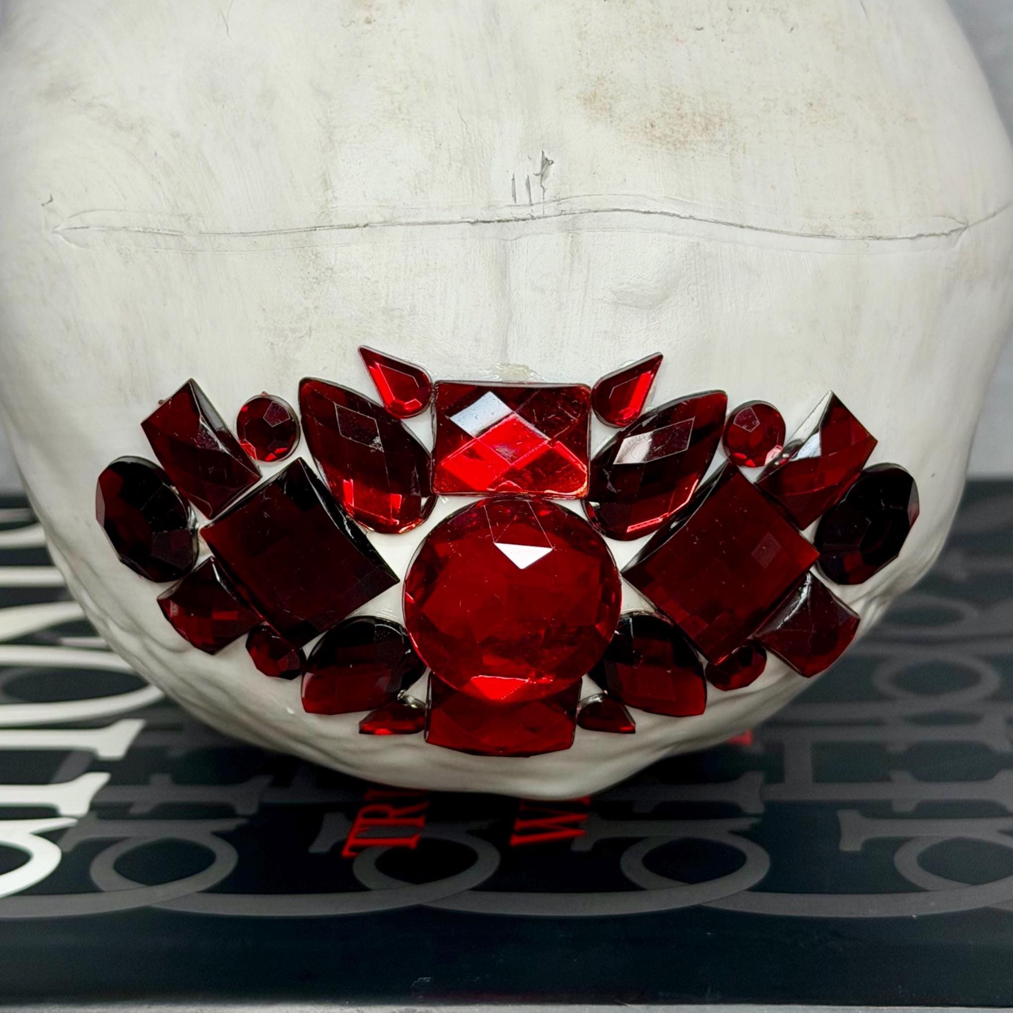 Skull is adorned with assorted red acrylic gems and sequins. This decoration automatically transforms any party or photoshoot from ordinary to beautifully macabre.
