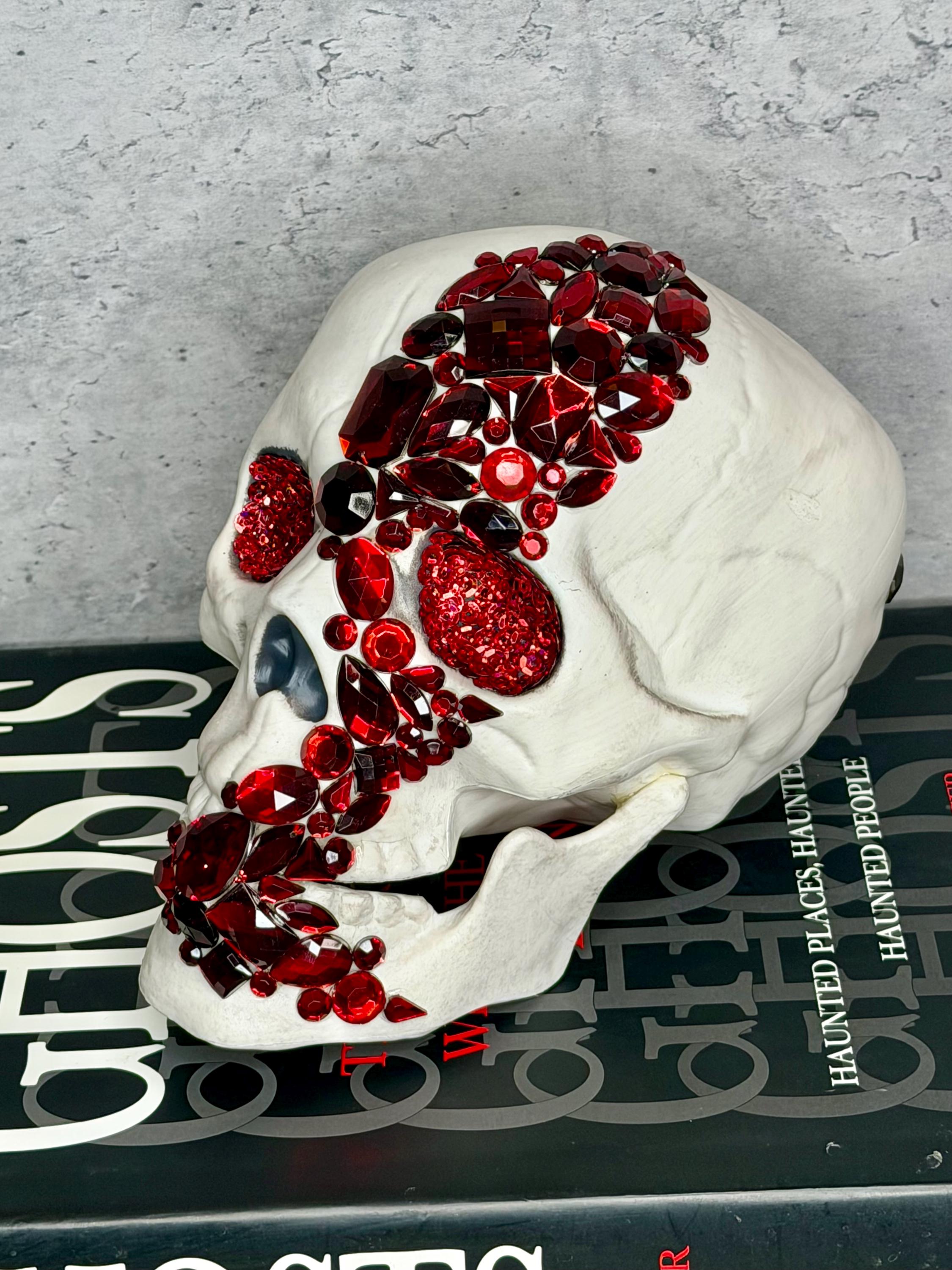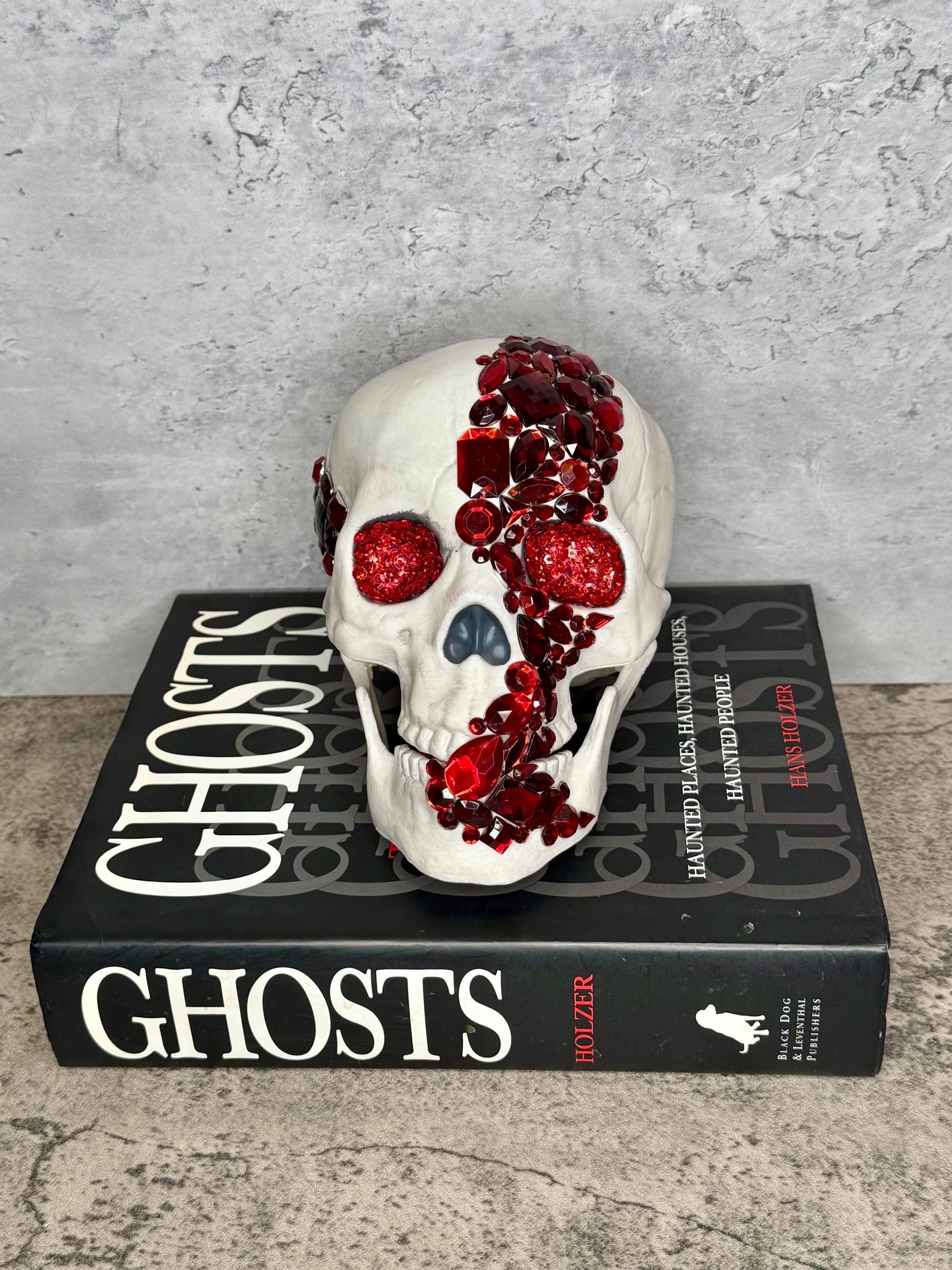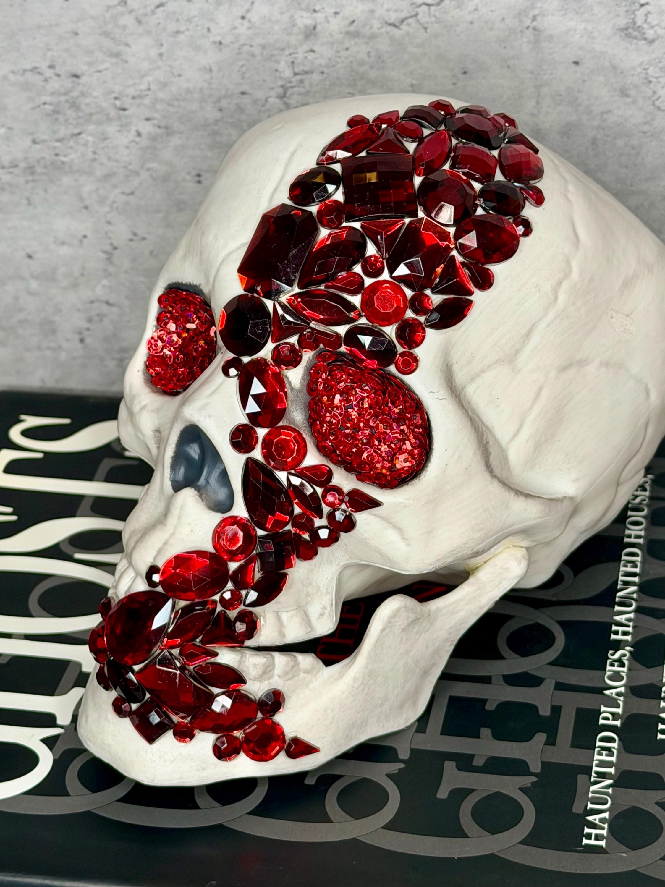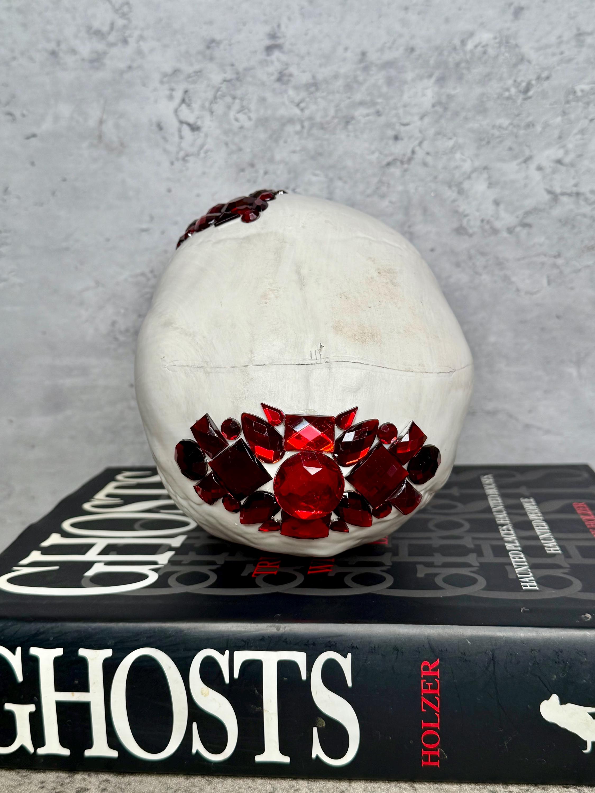 Skull is adorned with assorted red acrylic gems and sequins. This decoration automatically transforms any party or photoshoot from ordinary to beautifully macabre.