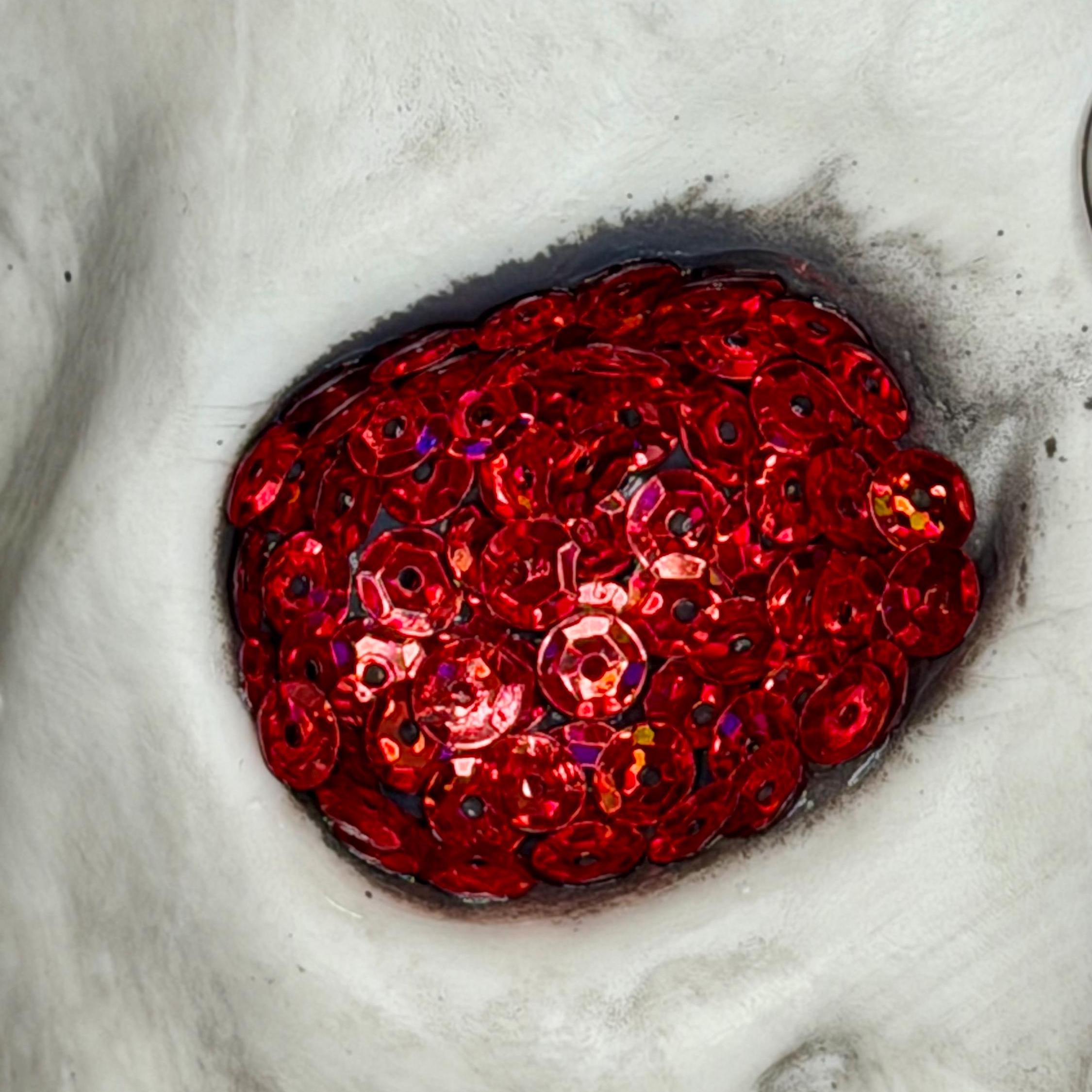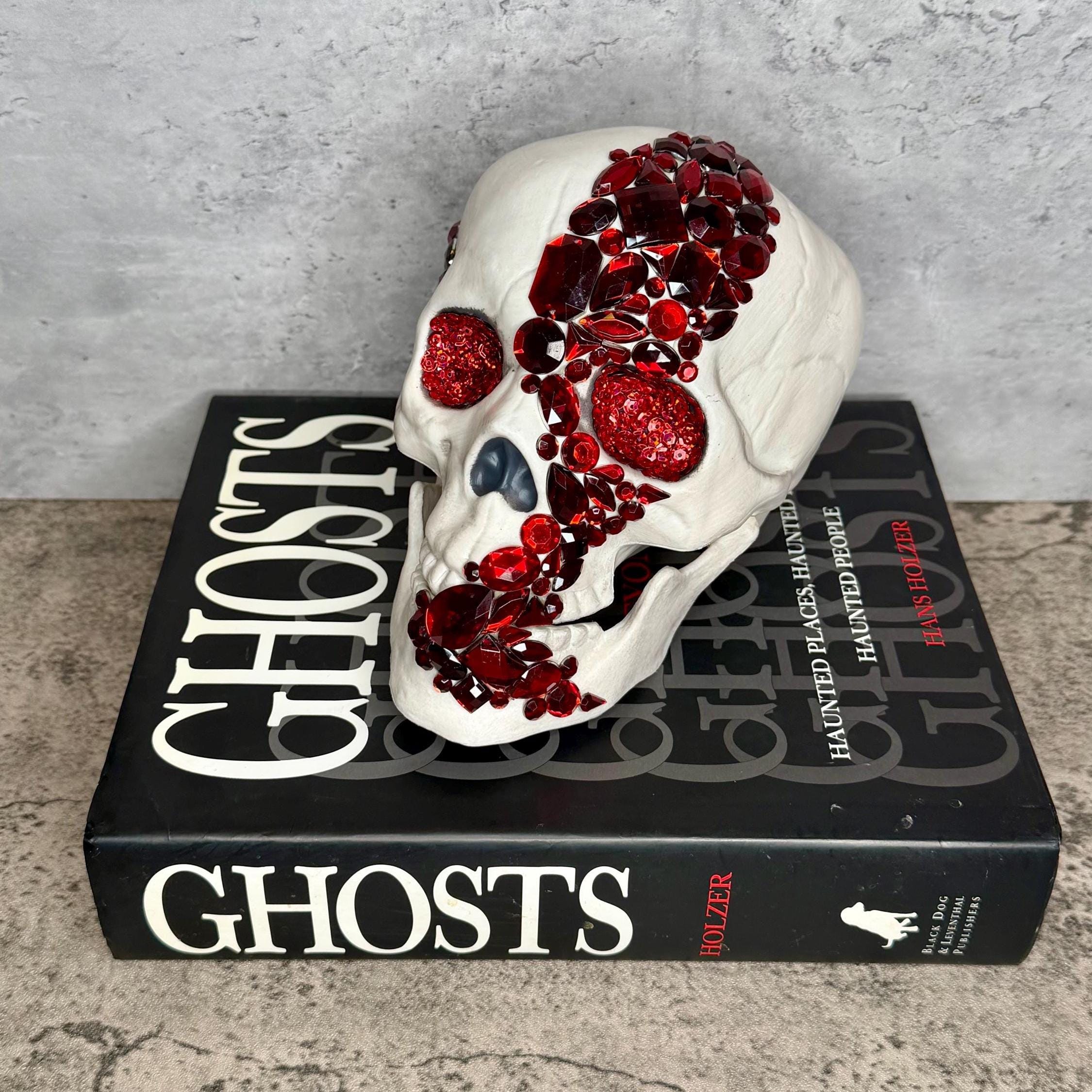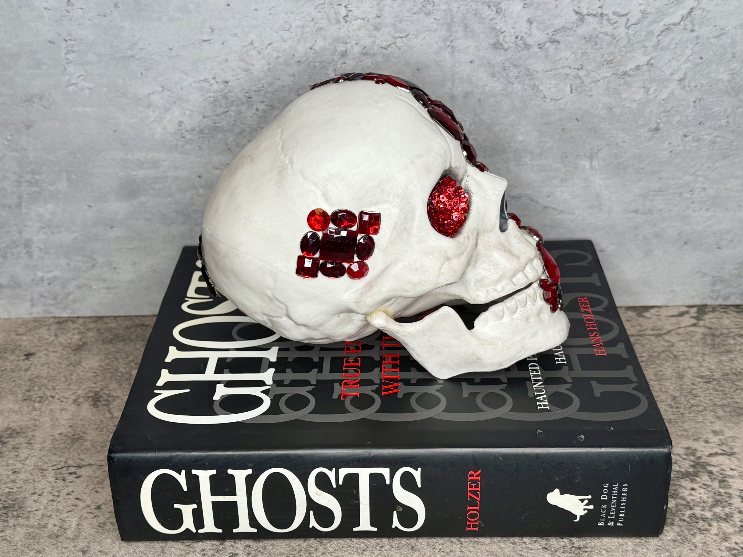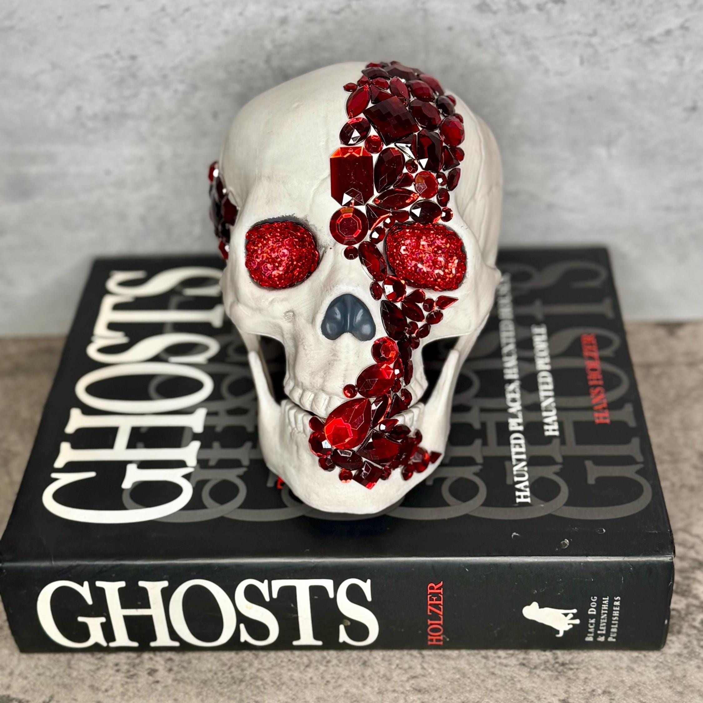 Skull is adorned with assorted red acrylic gems and sequins. This decoration automatically transforms any party or photoshoot from ordinary to beautifully macabre.