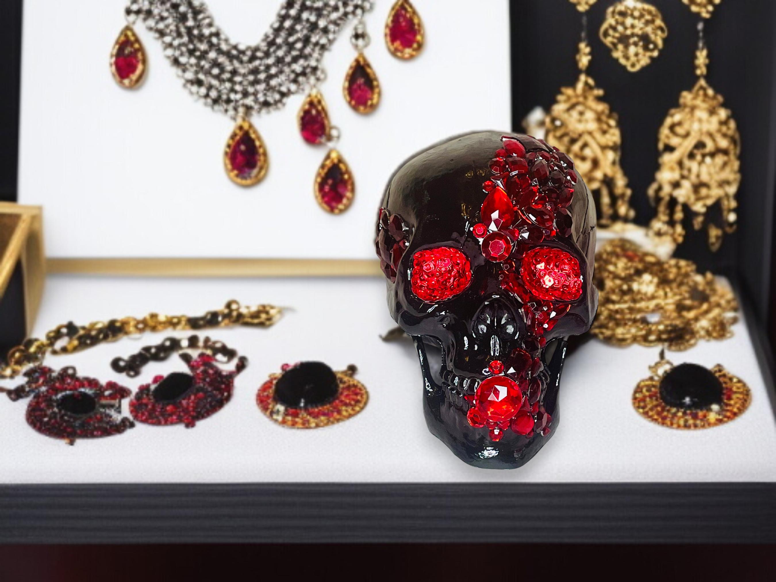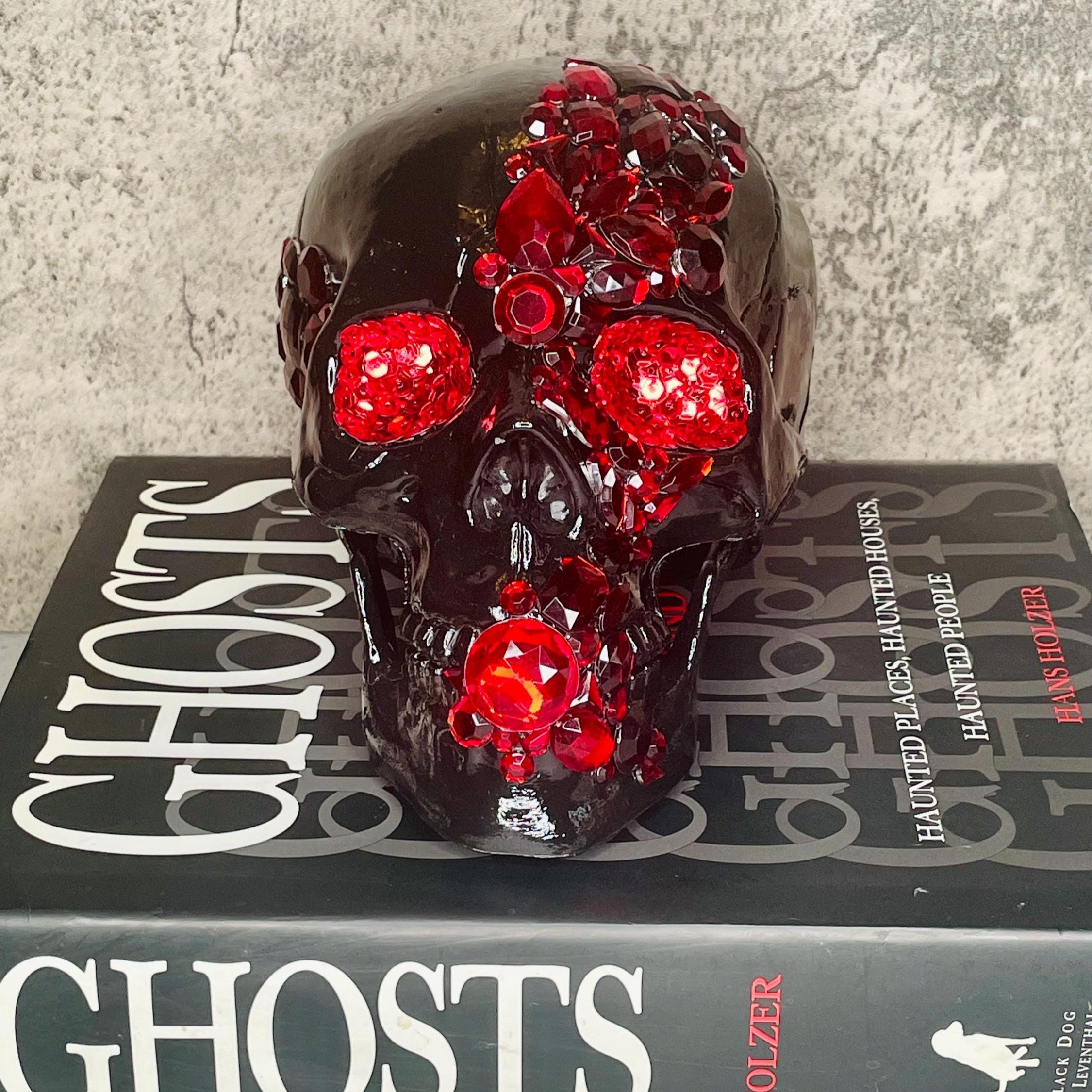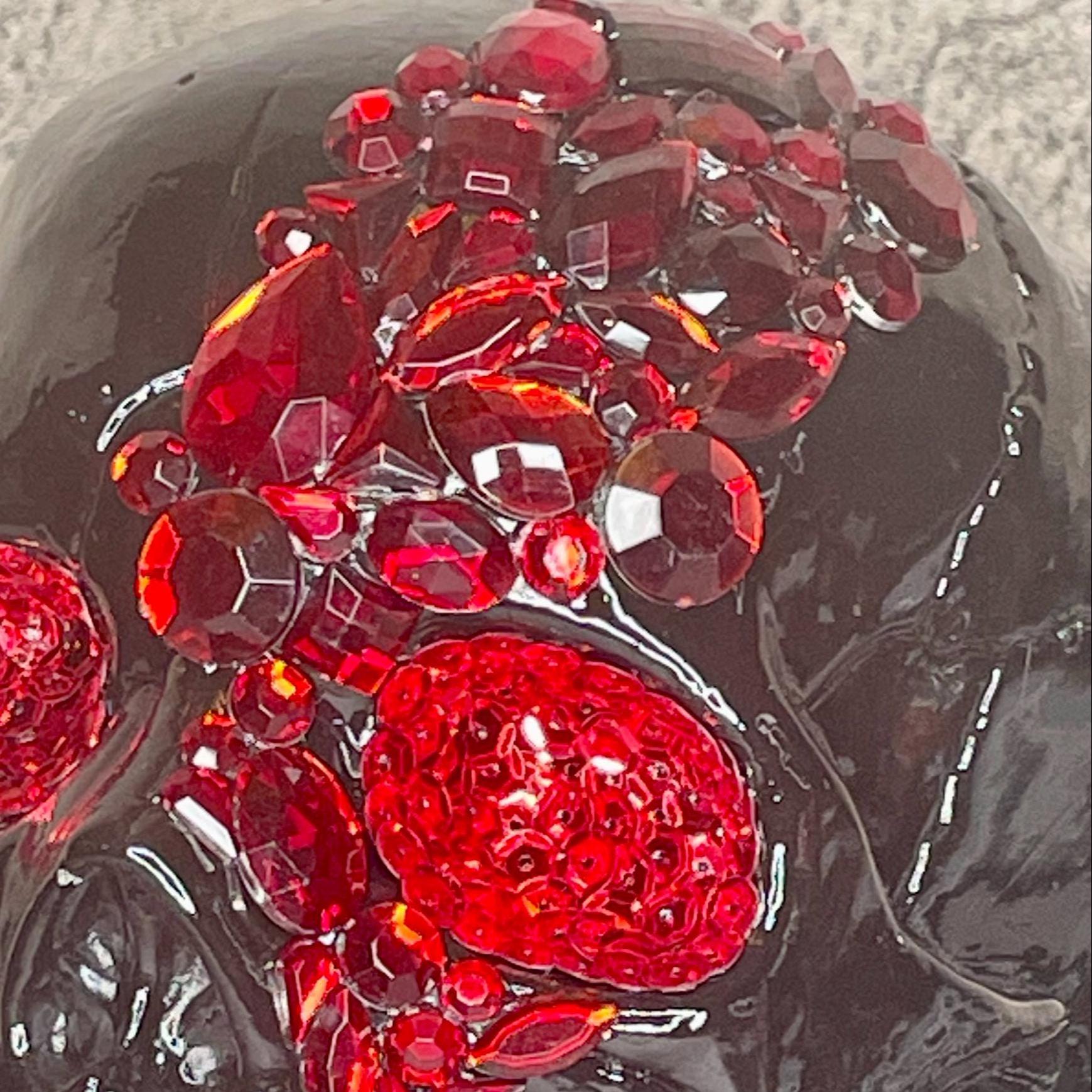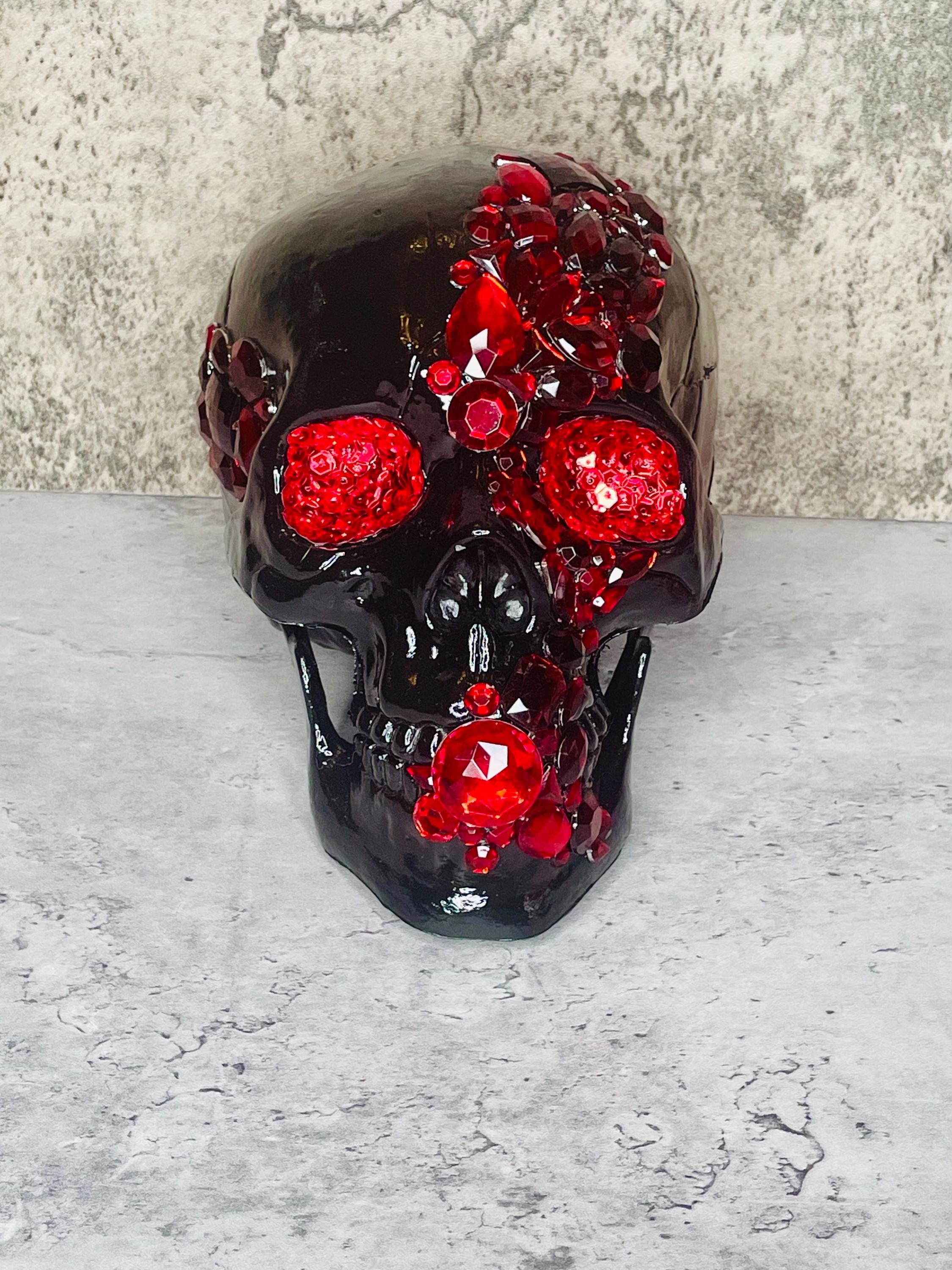 Black skull is adorned with assorted red acrylic gems and sequins. Whether serving as a centerpiece or part of your mantel, this decoration transforms any room from ordinary to beautifully macabre.