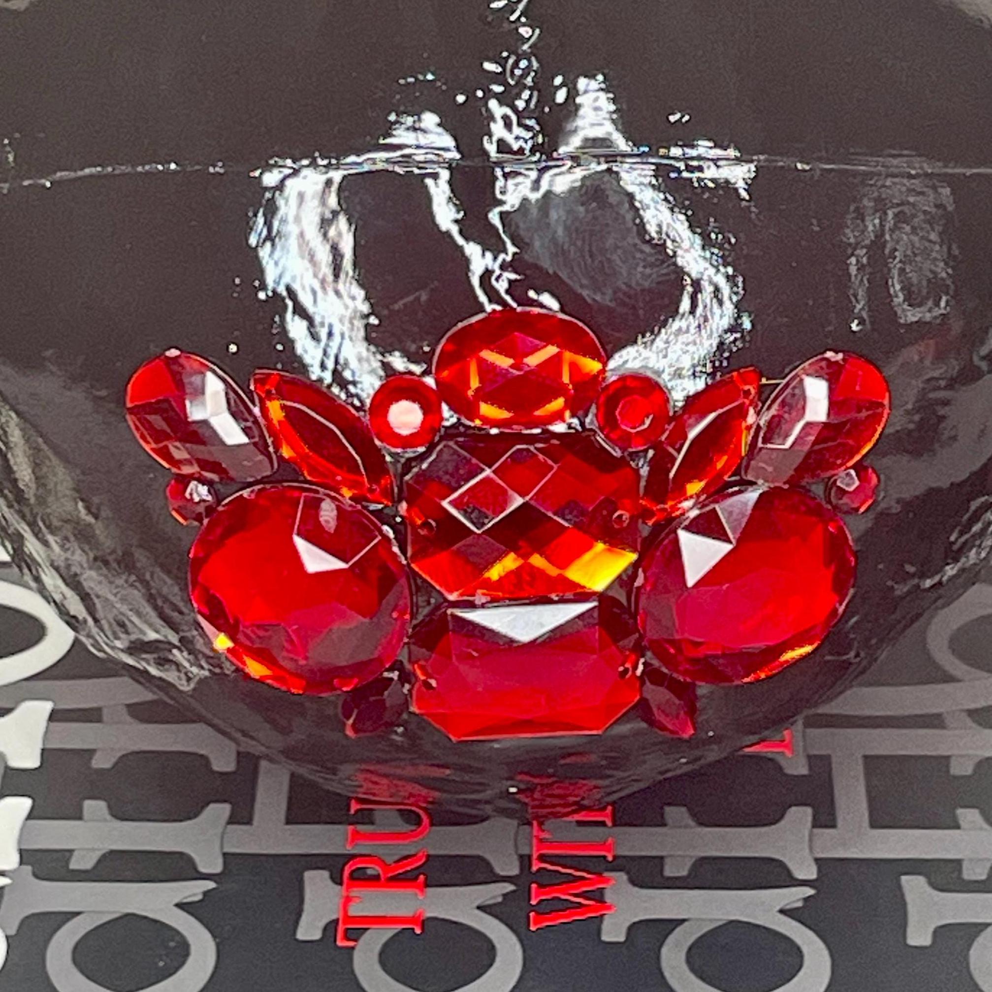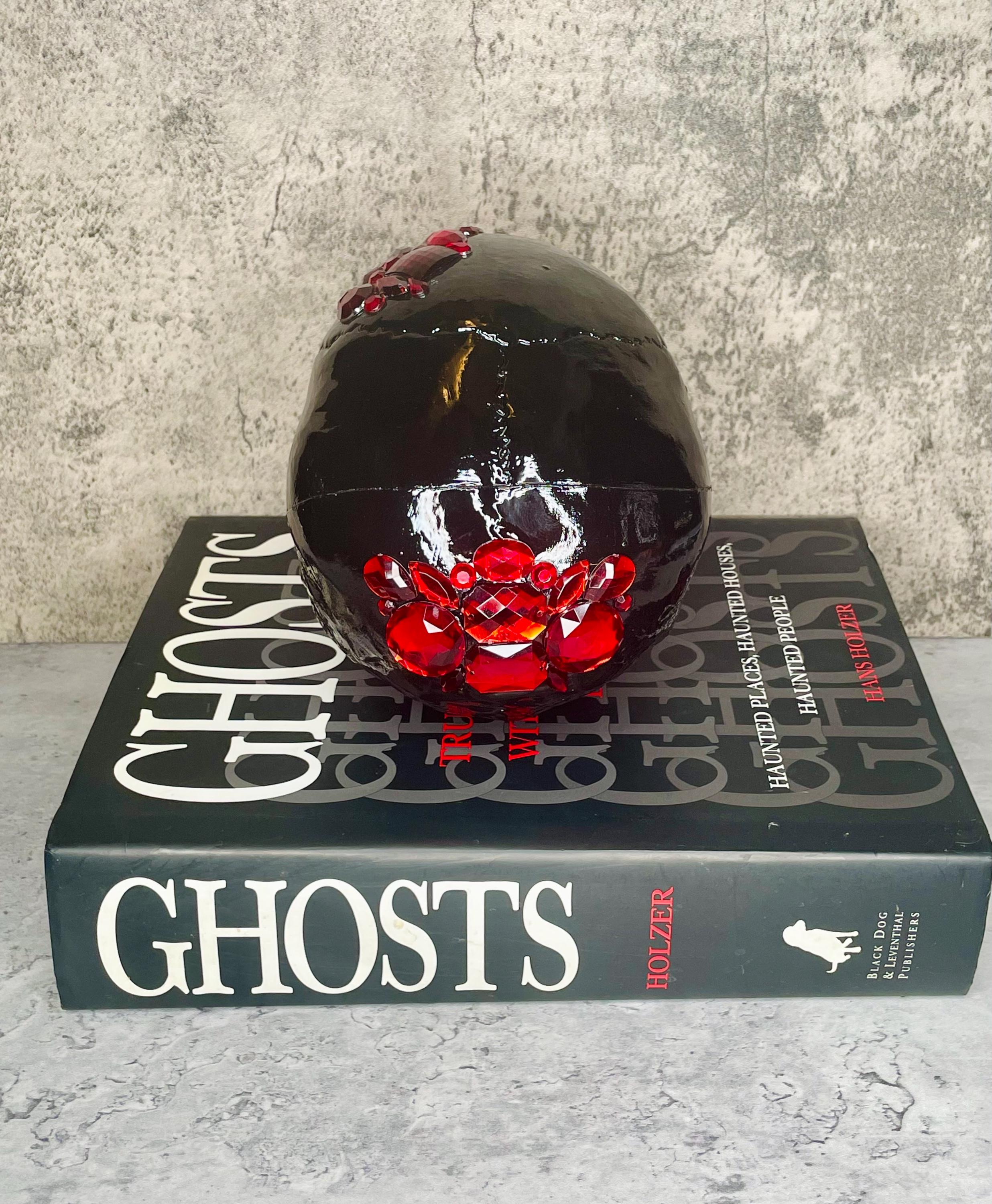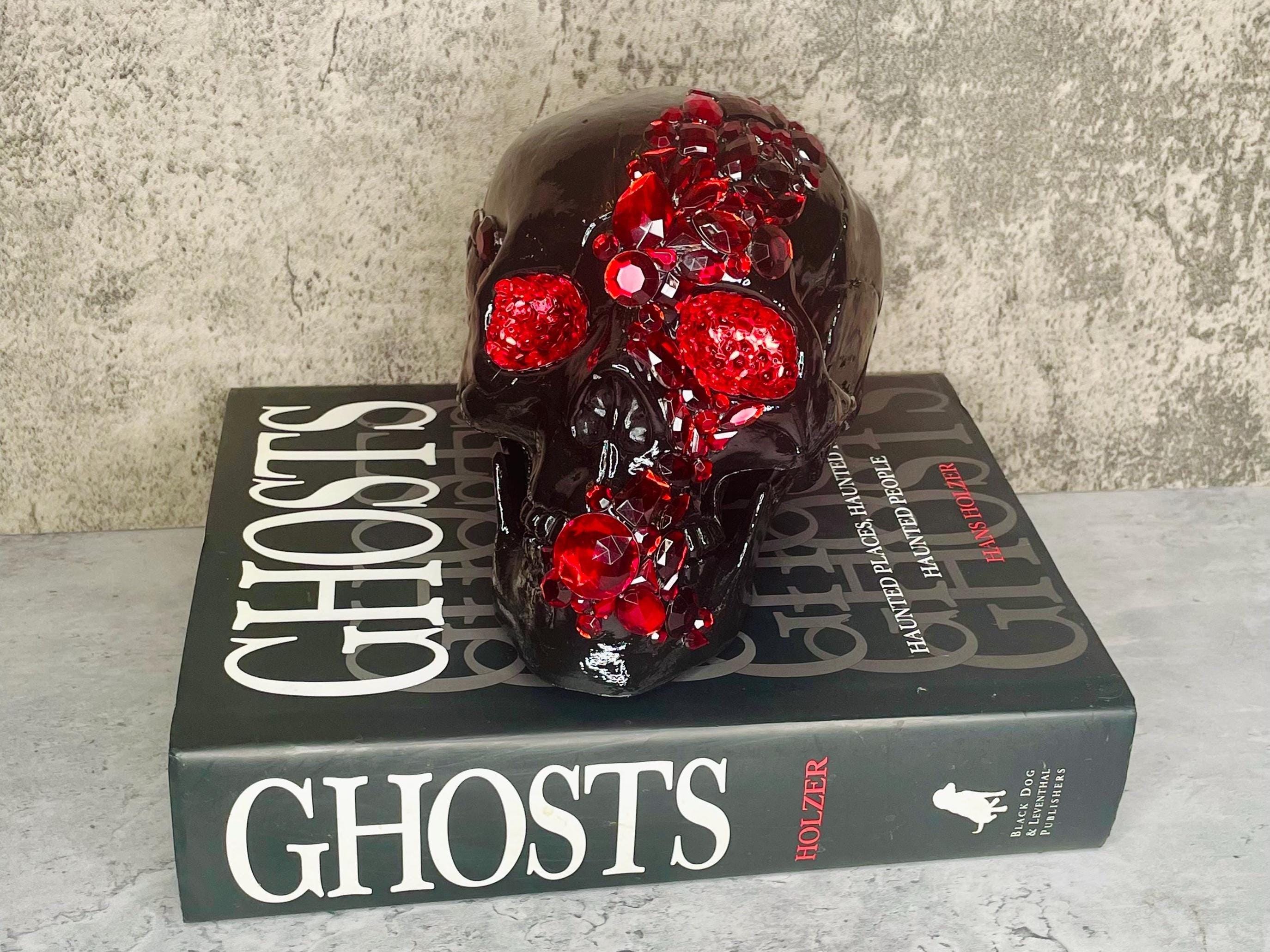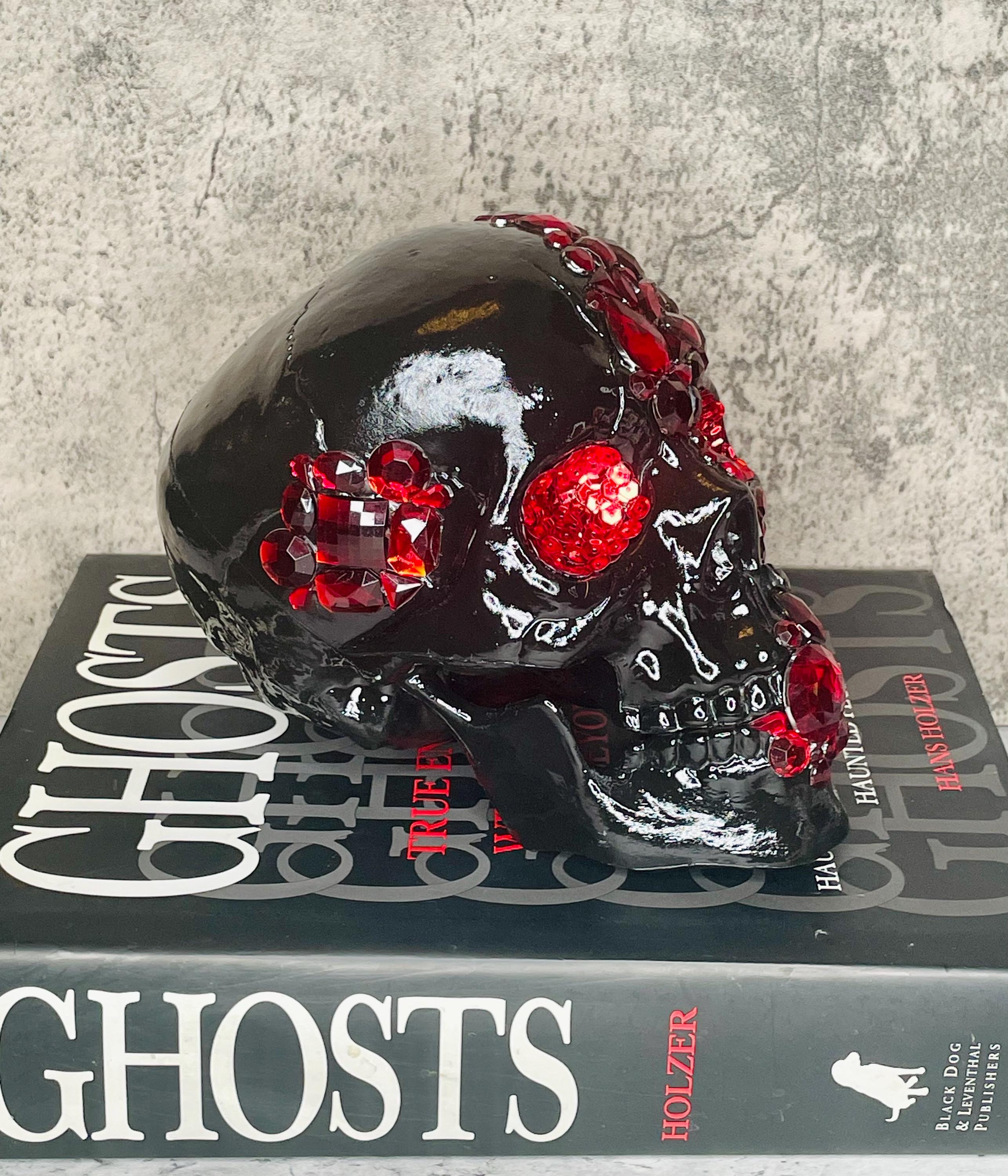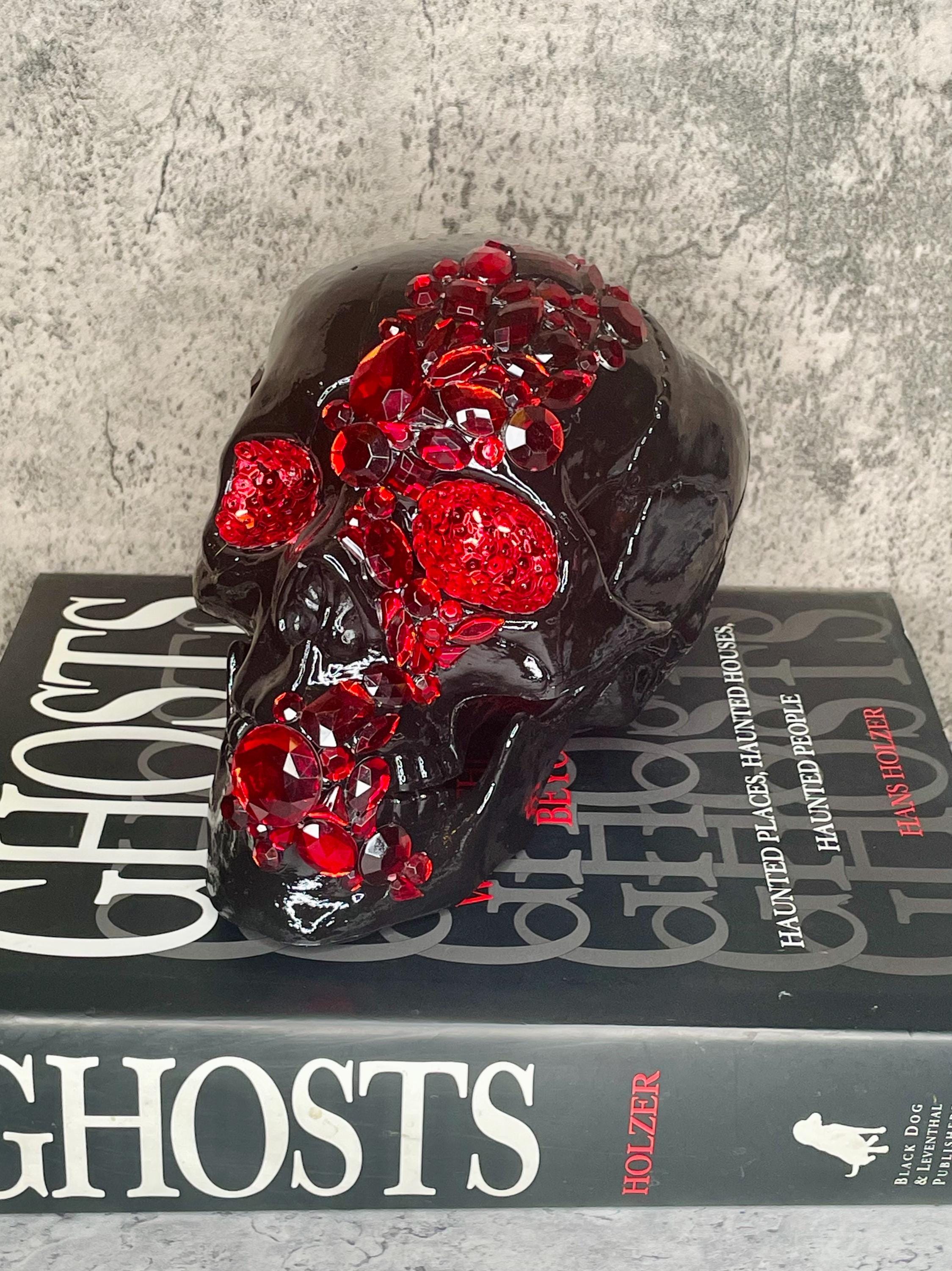 Black skull is adorned with assorted red acrylic gems and sequins. Whether serving as a centerpiece or part of your mantel, this decoration transforms any room from ordinary to beautifully macabre.