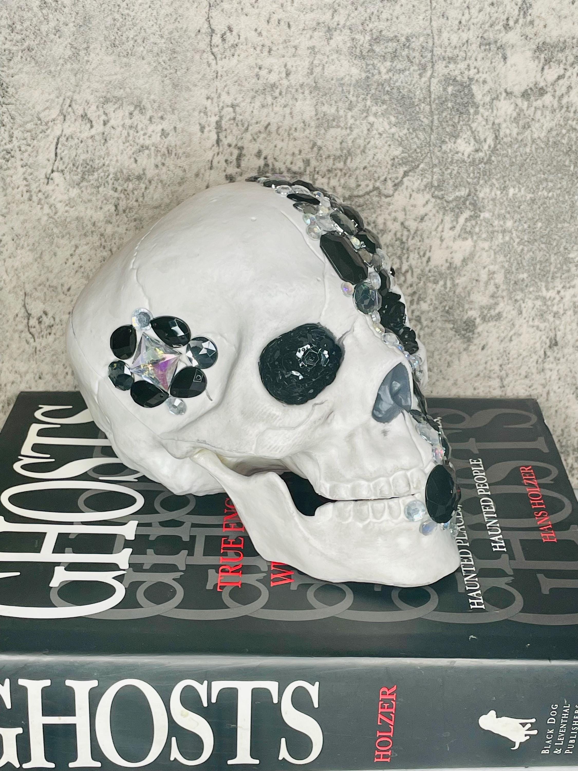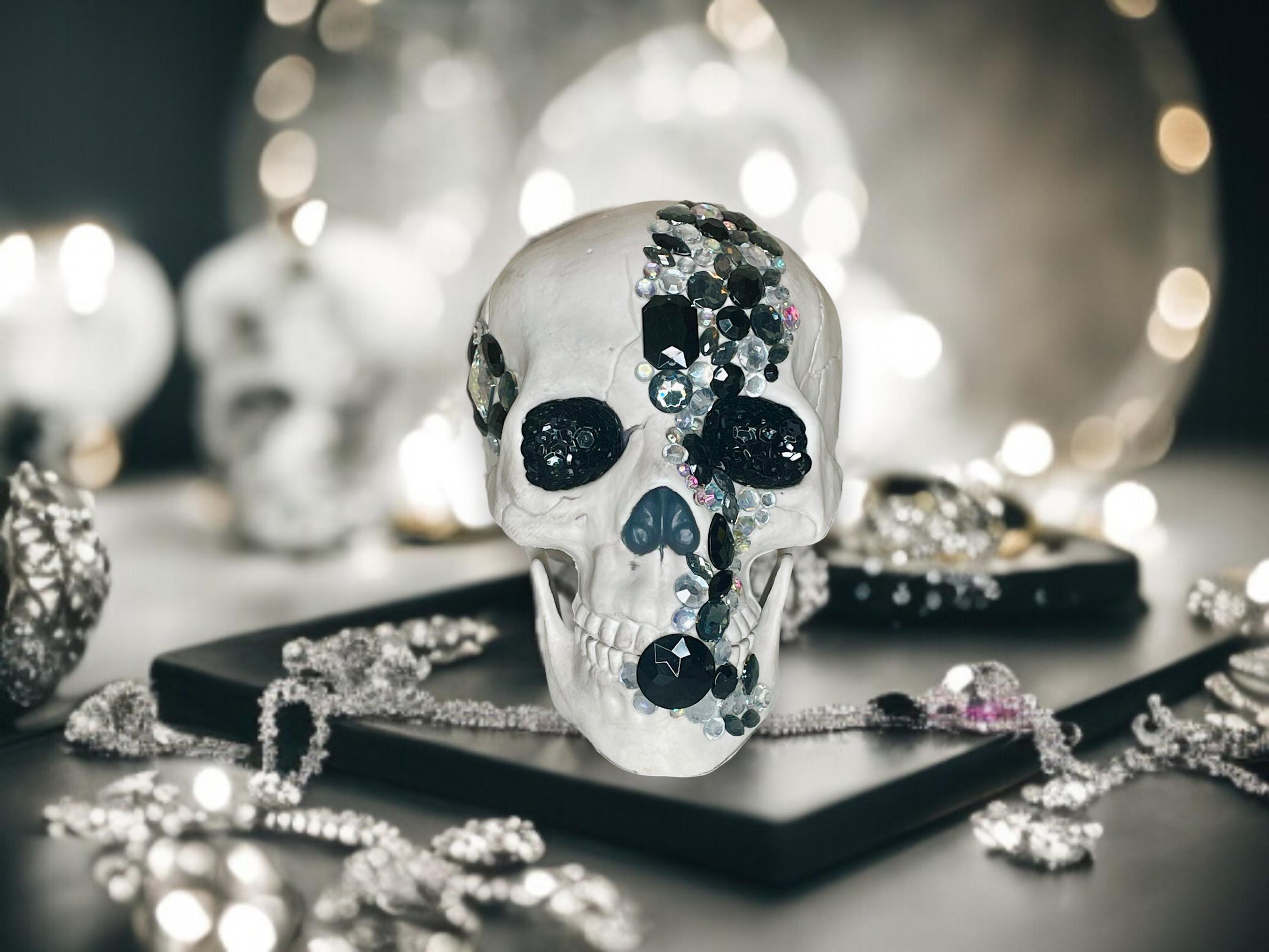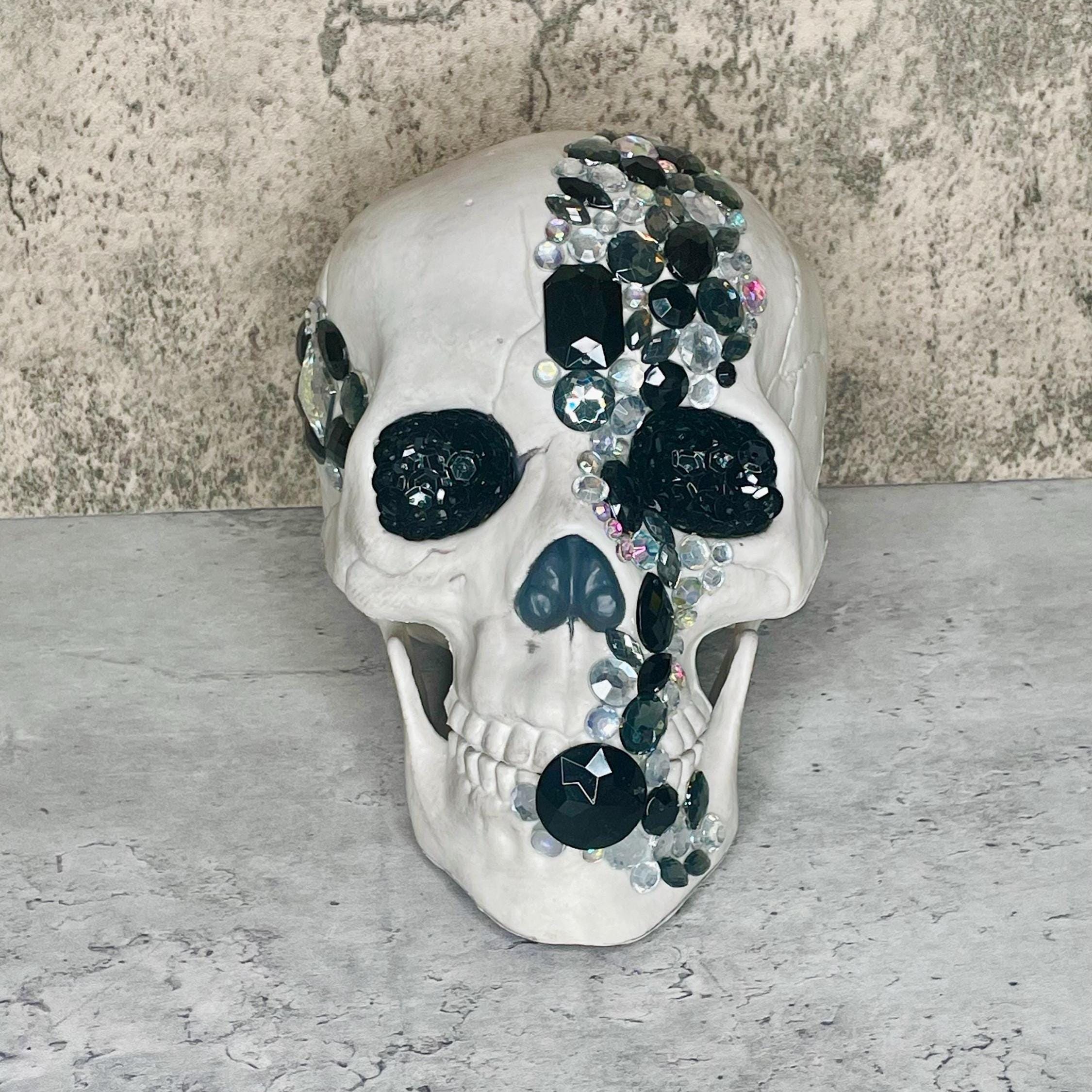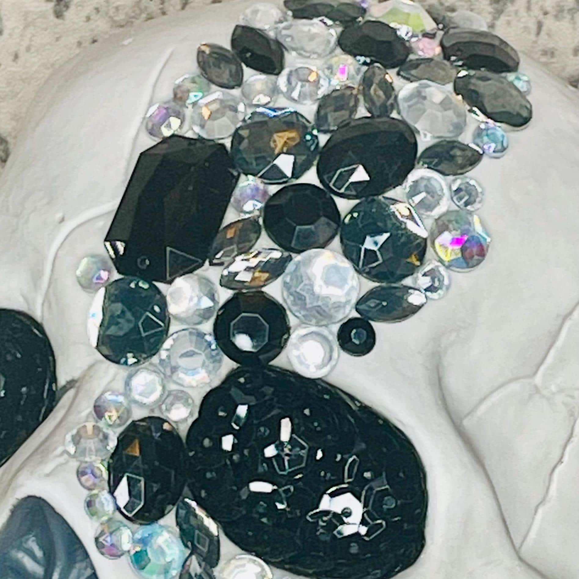 Skull is adorned with assorted black, smoky, and clear acrylic gems and black sequins. This decoration automatically transforms any party or photoshoot from ordinary to beautifully macabre.