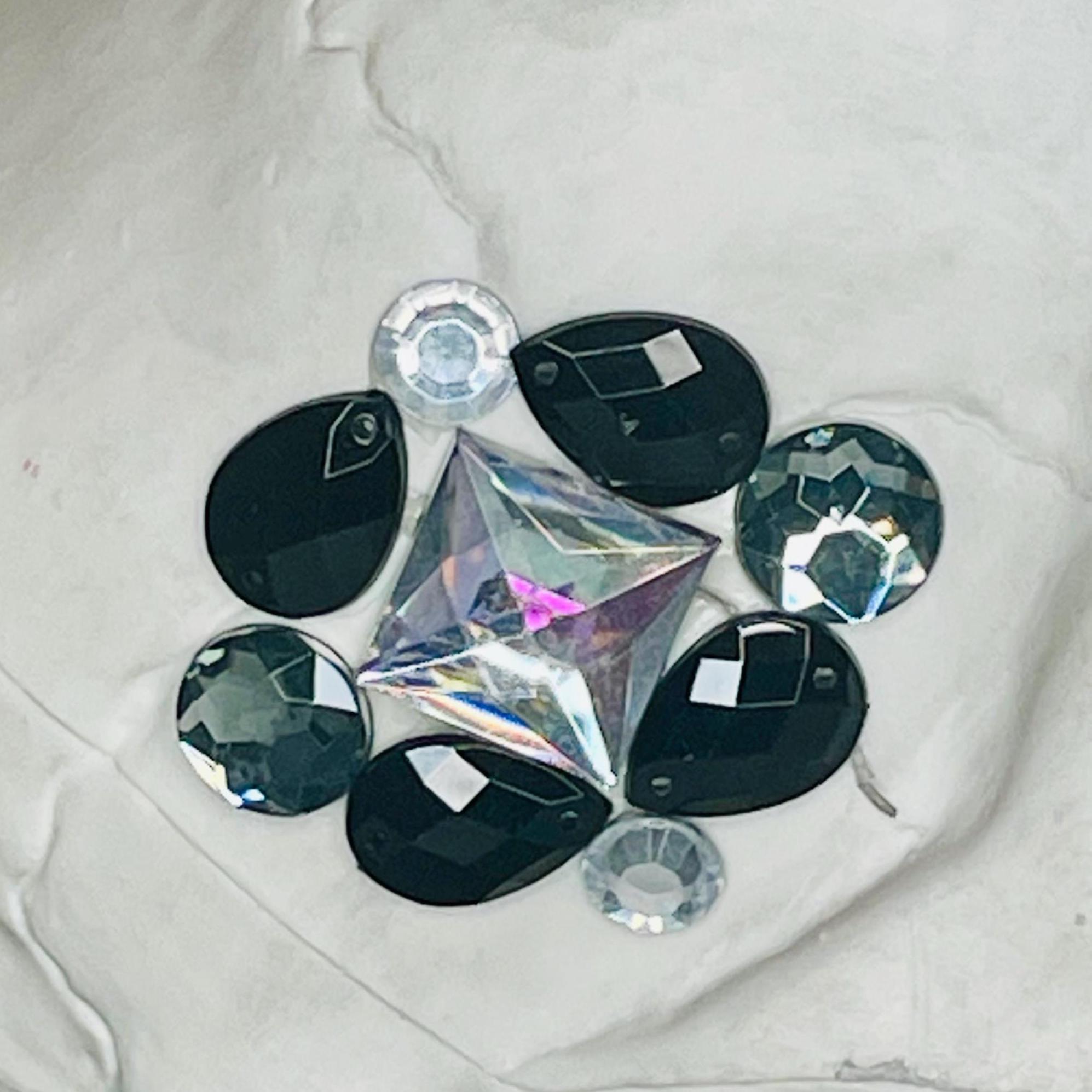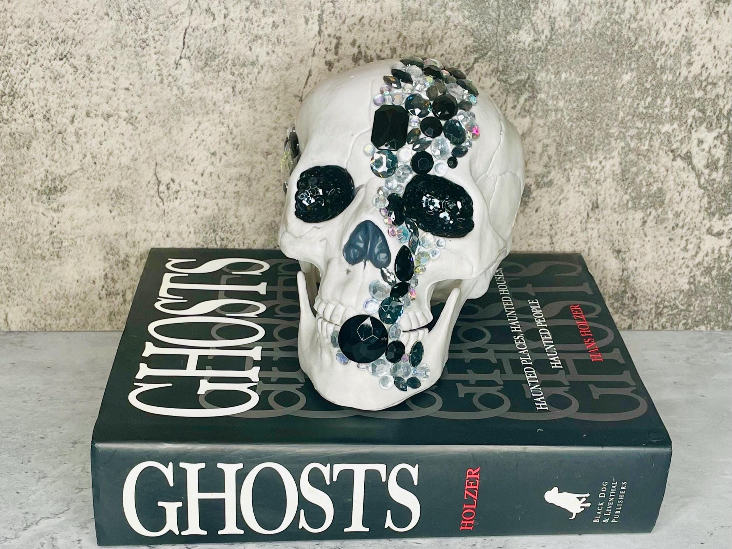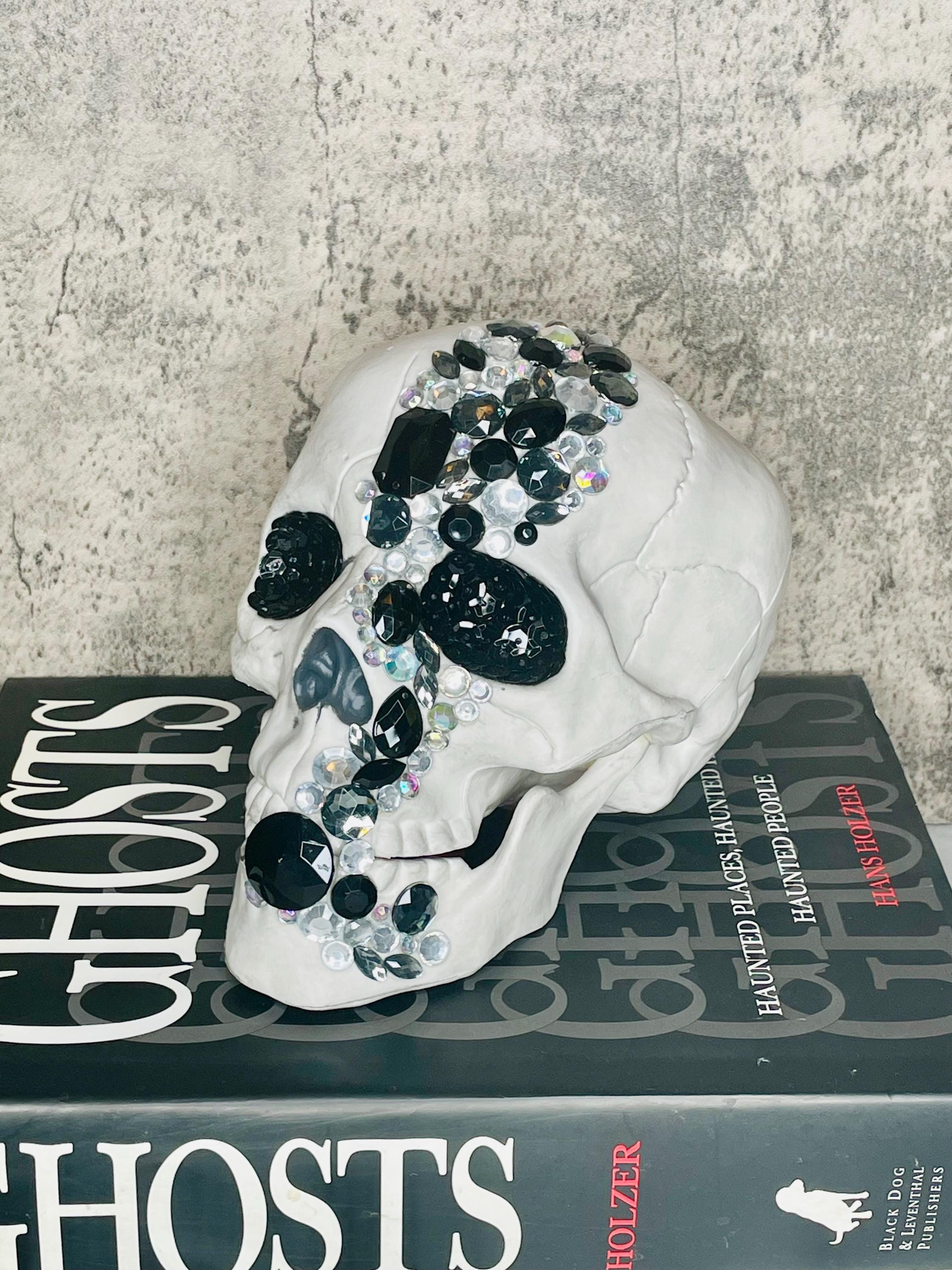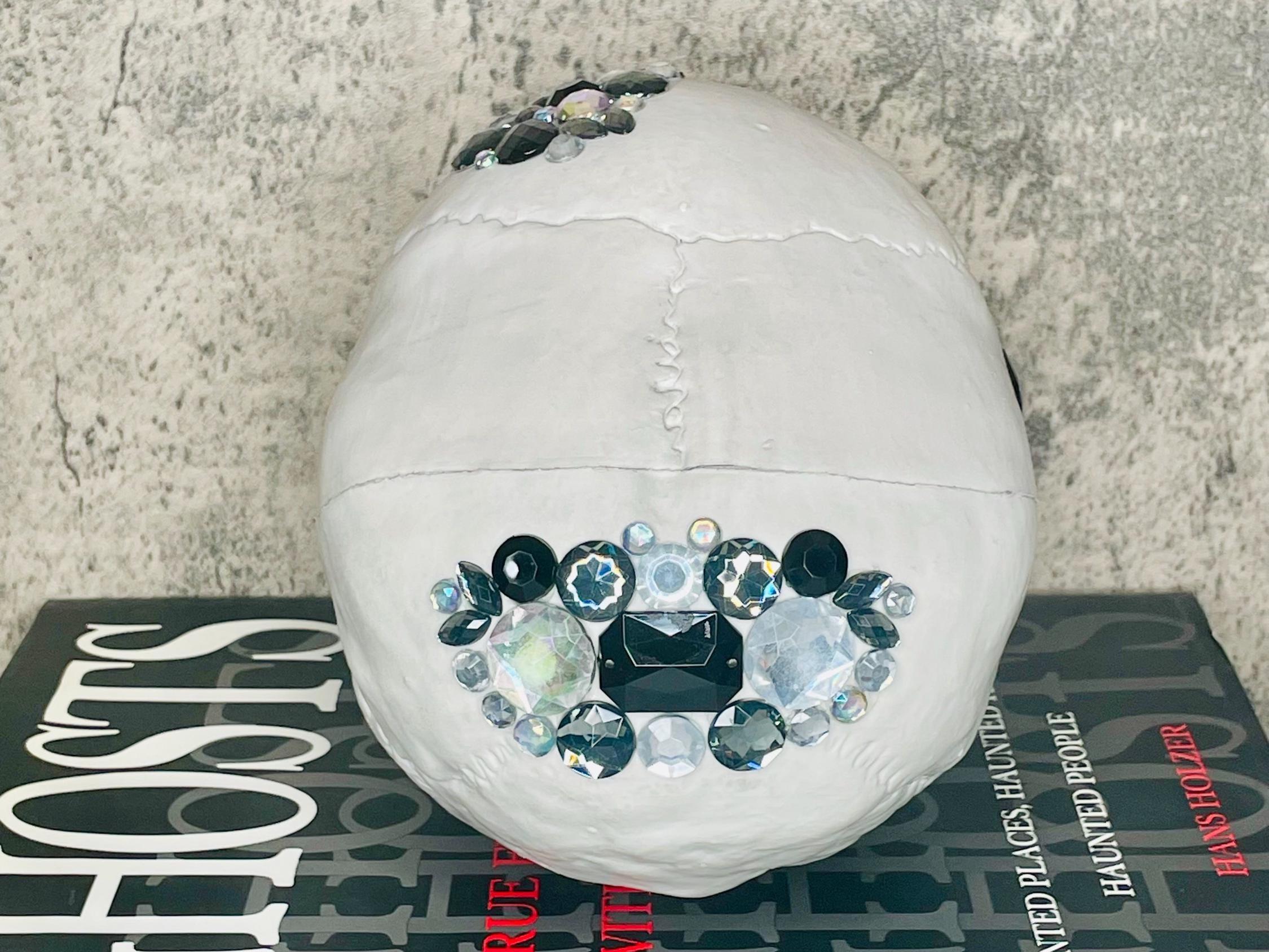Skull is adorned with assorted black, smoky, and clear acrylic gems and black sequins. This decoration automatically transforms any party or photoshoot from ordinary to beautifully macabre.