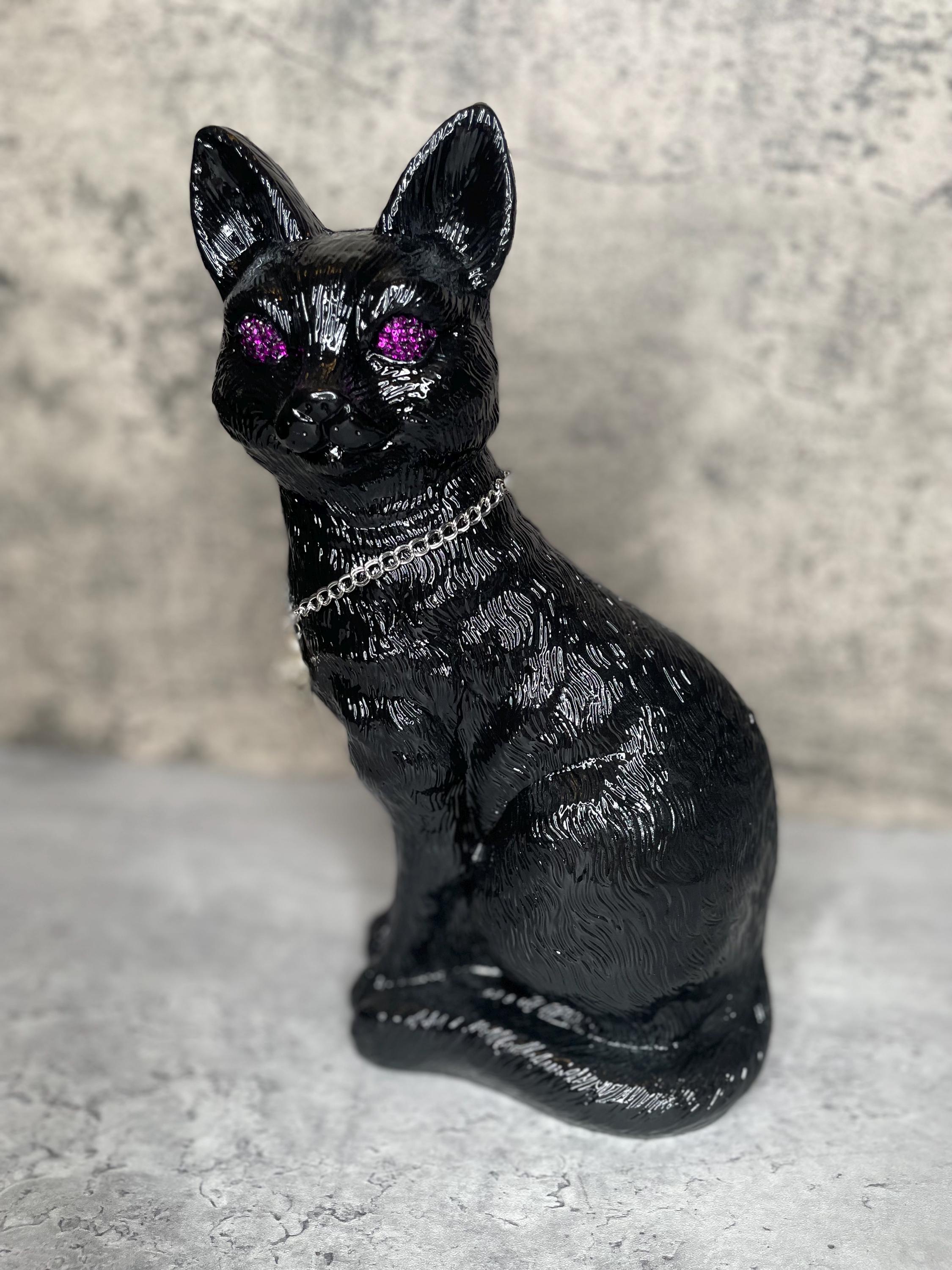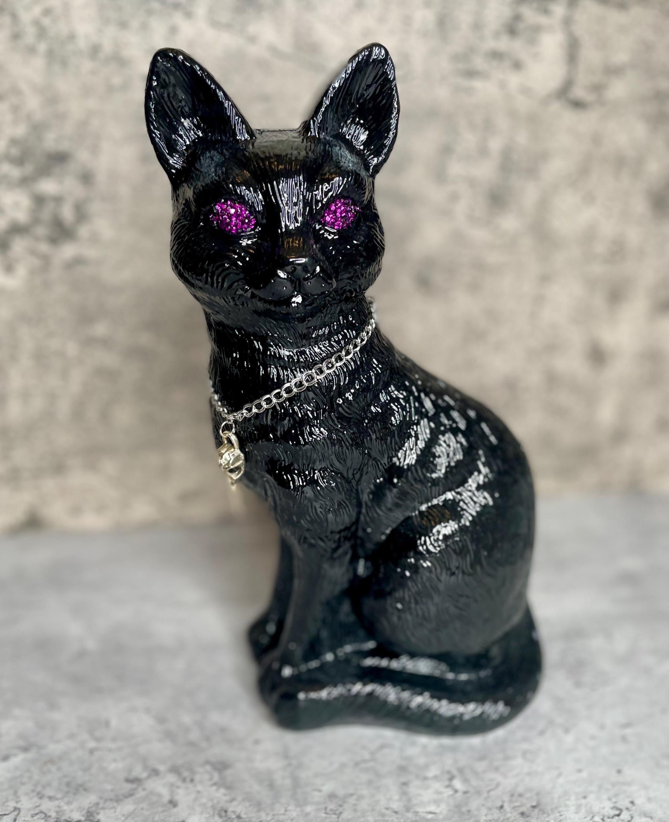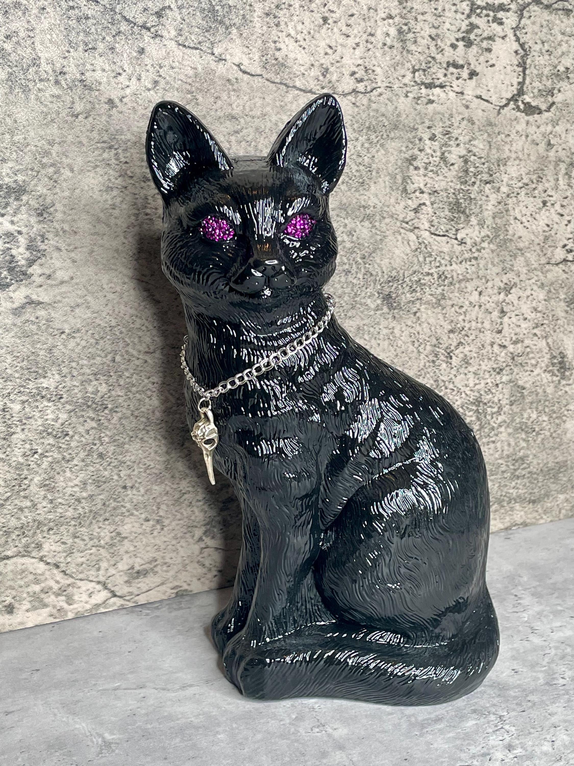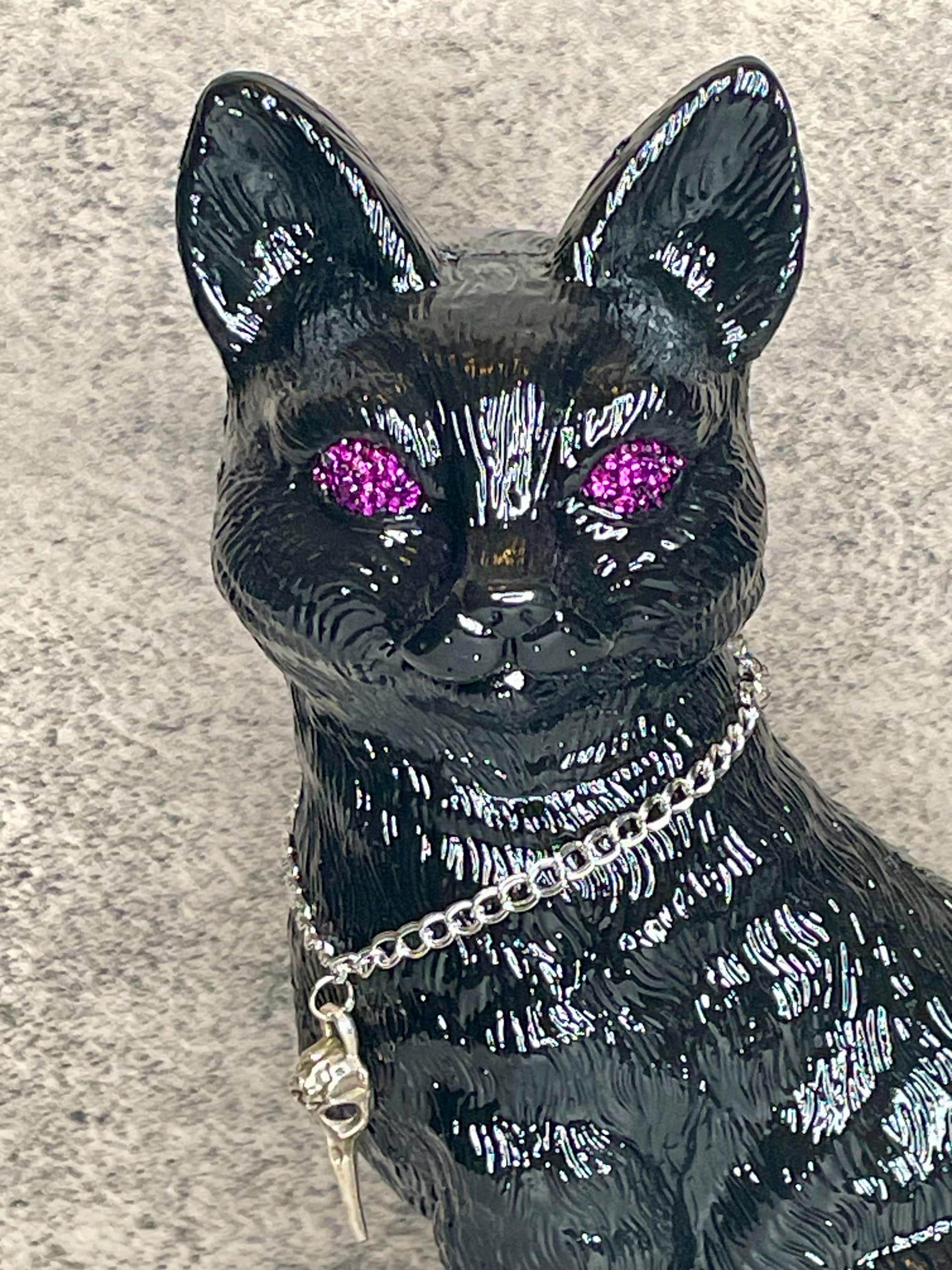 Black cat is hand-embellished and made from light weight plastic. Eyes are adorned with small acrylic purple gems and features a metal chain collar with bird skull charm. This unique accessory is perfect for Halloween or any gothic-themed décor.