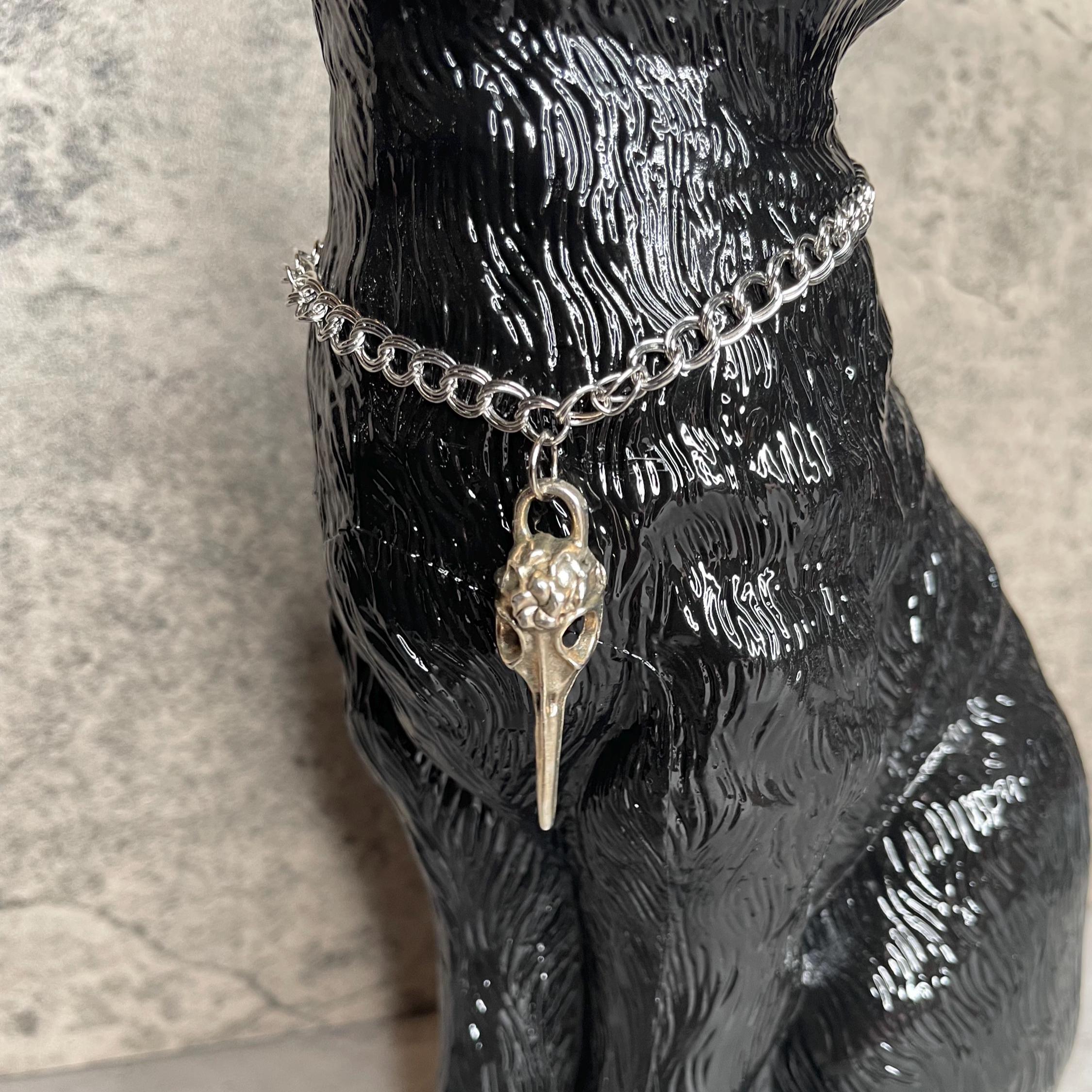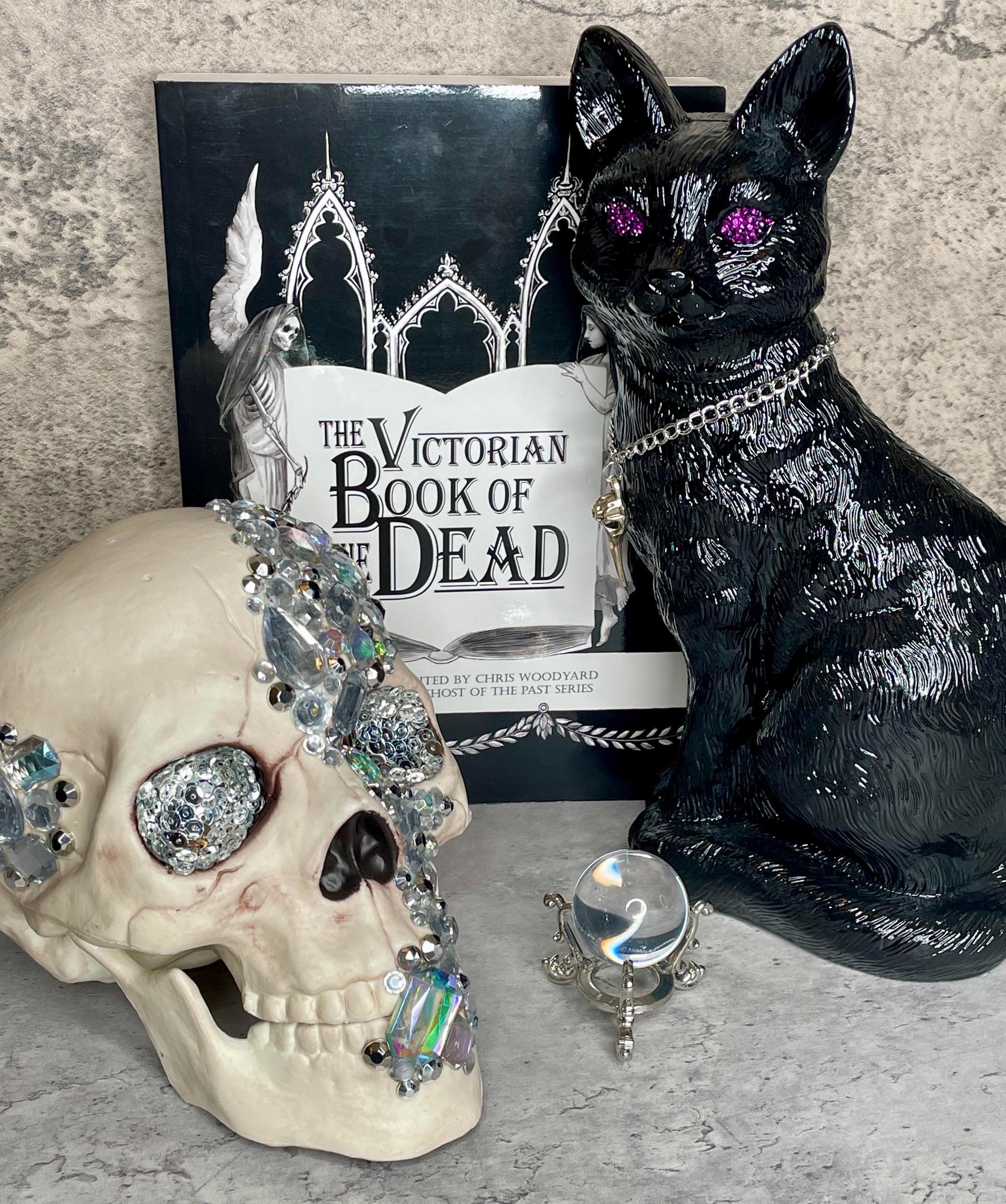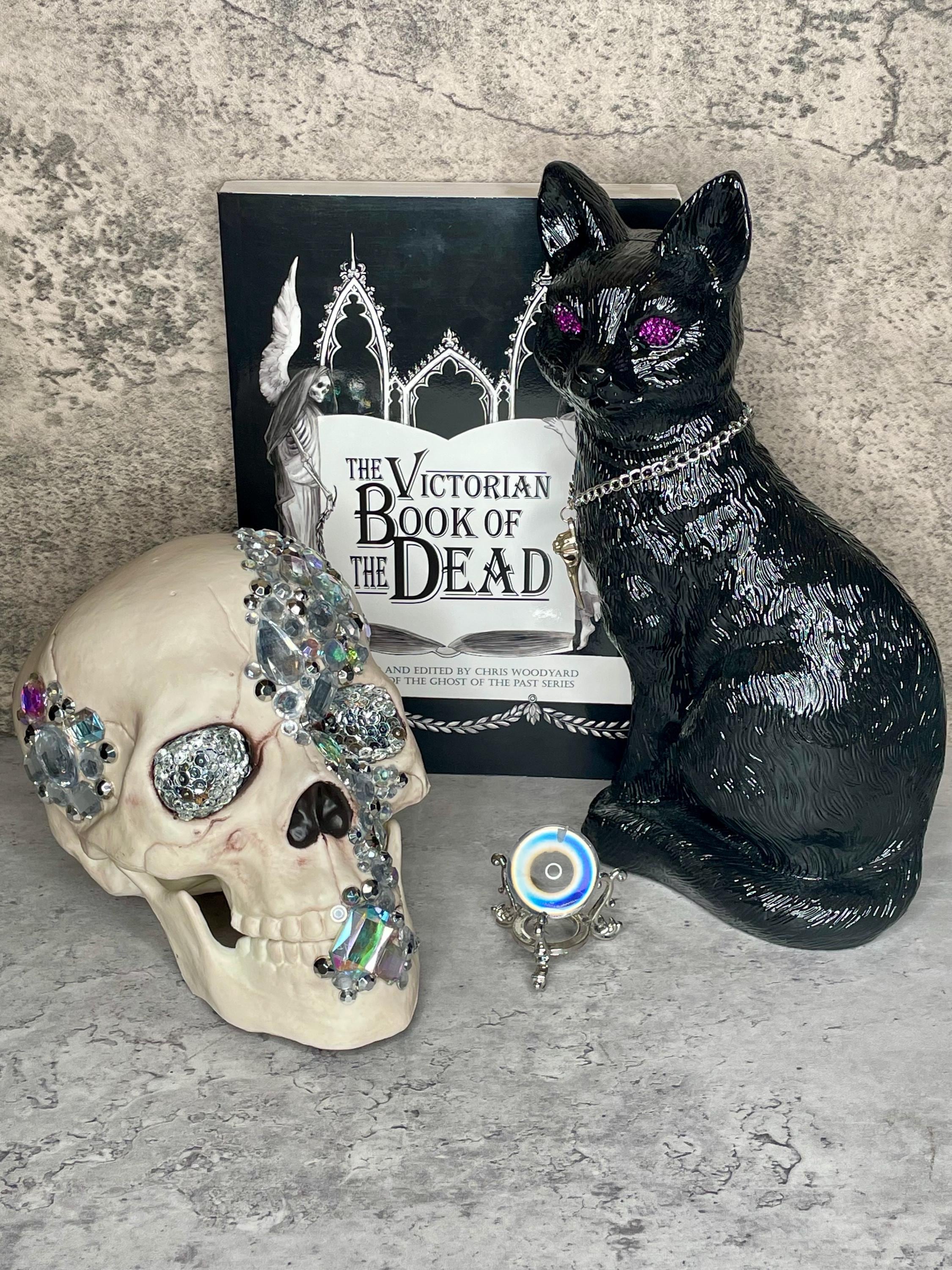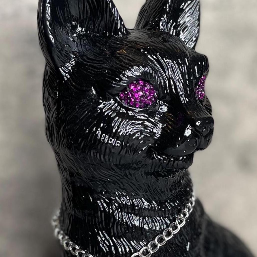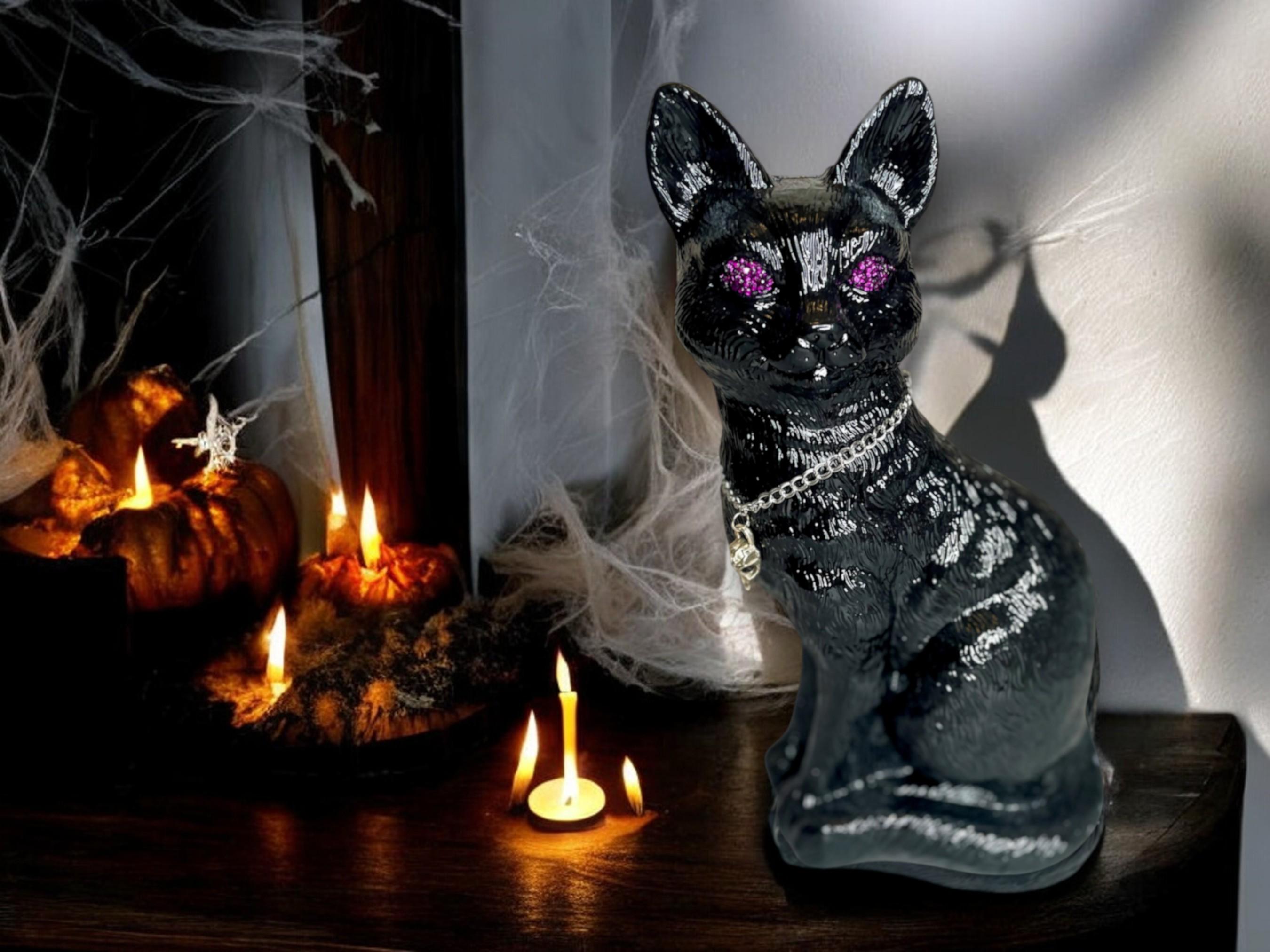 Black cat is hand-embellished and made from light weight plastic. Eyes are adorned with small acrylic purple gems and features a metal chain collar with bird skull charm. This unique accessory is perfect for Halloween or any gothic-themed décor.