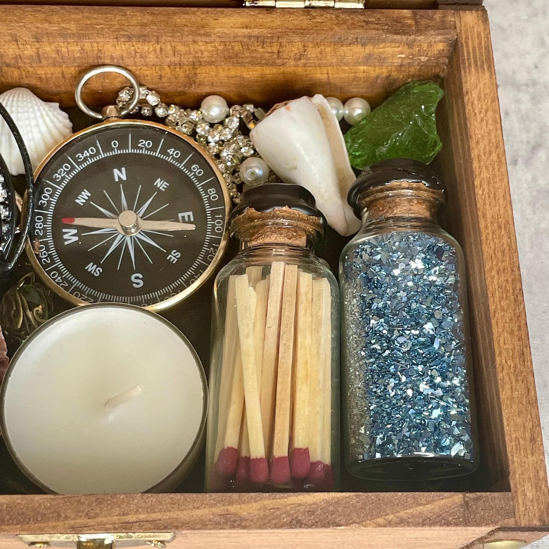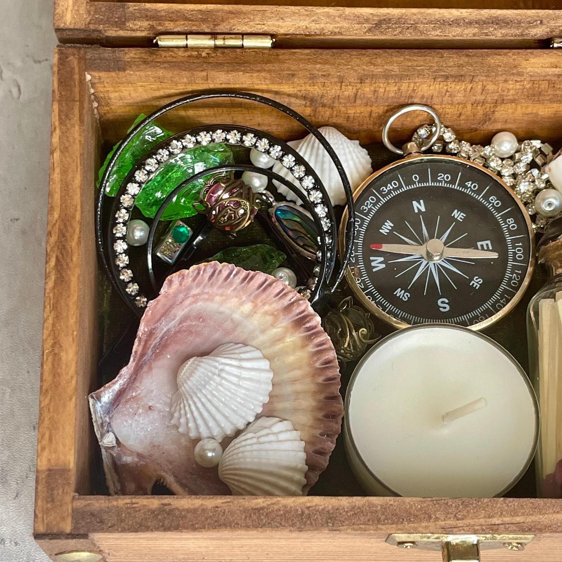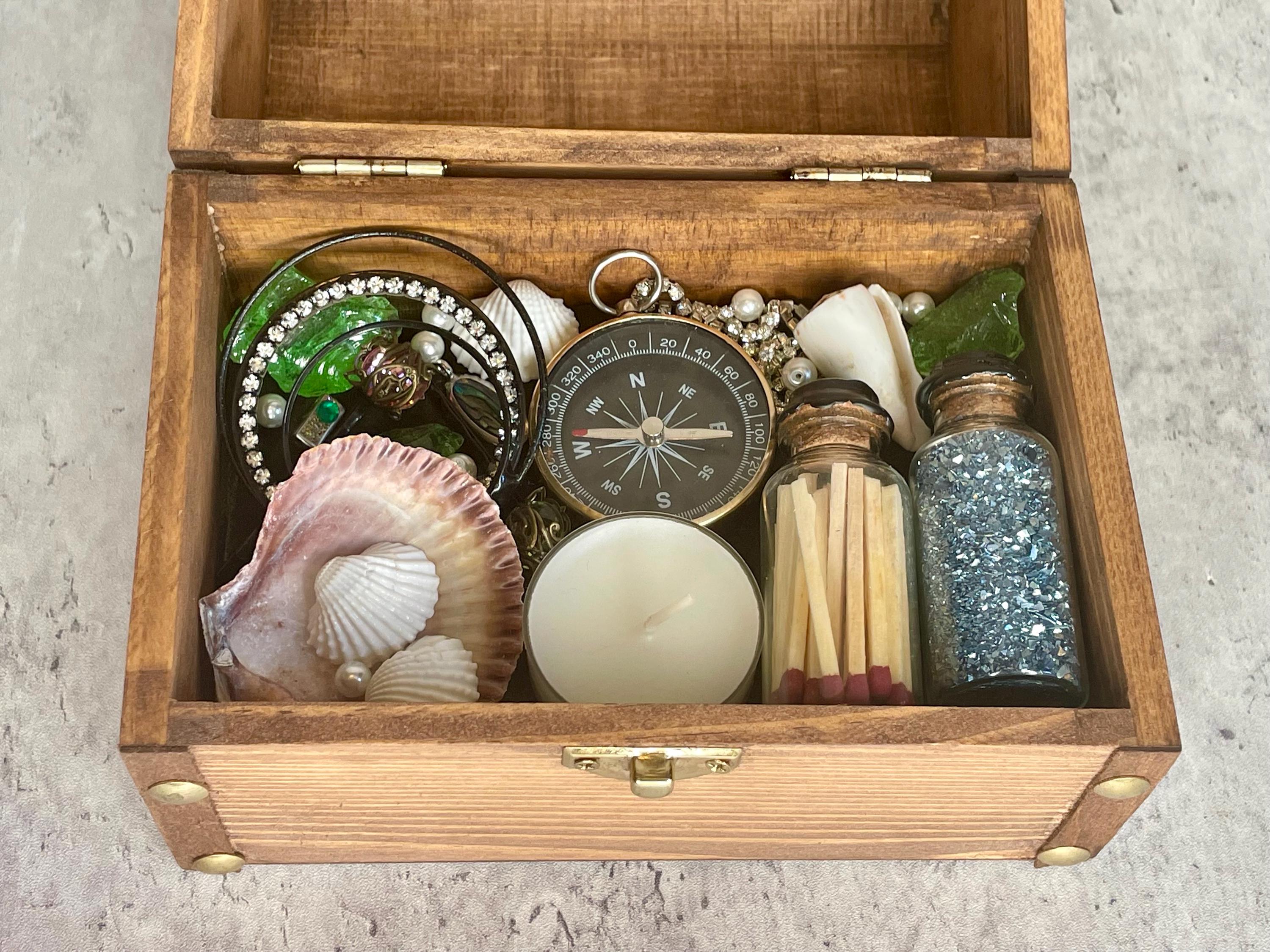 Mermaid summoning treasure chest includes a distressed wooden chest with metal clasp filled with treasure (recycled costume jewelry, beads, glitter), seashells, tea candle, sea glass, matches, and compass. All items sit upon a green velvet background and are not affixed in place. Mermaids, water nymphs, and sirens alike are sure to feel the call of the sea with this one-of-a-kind gift.