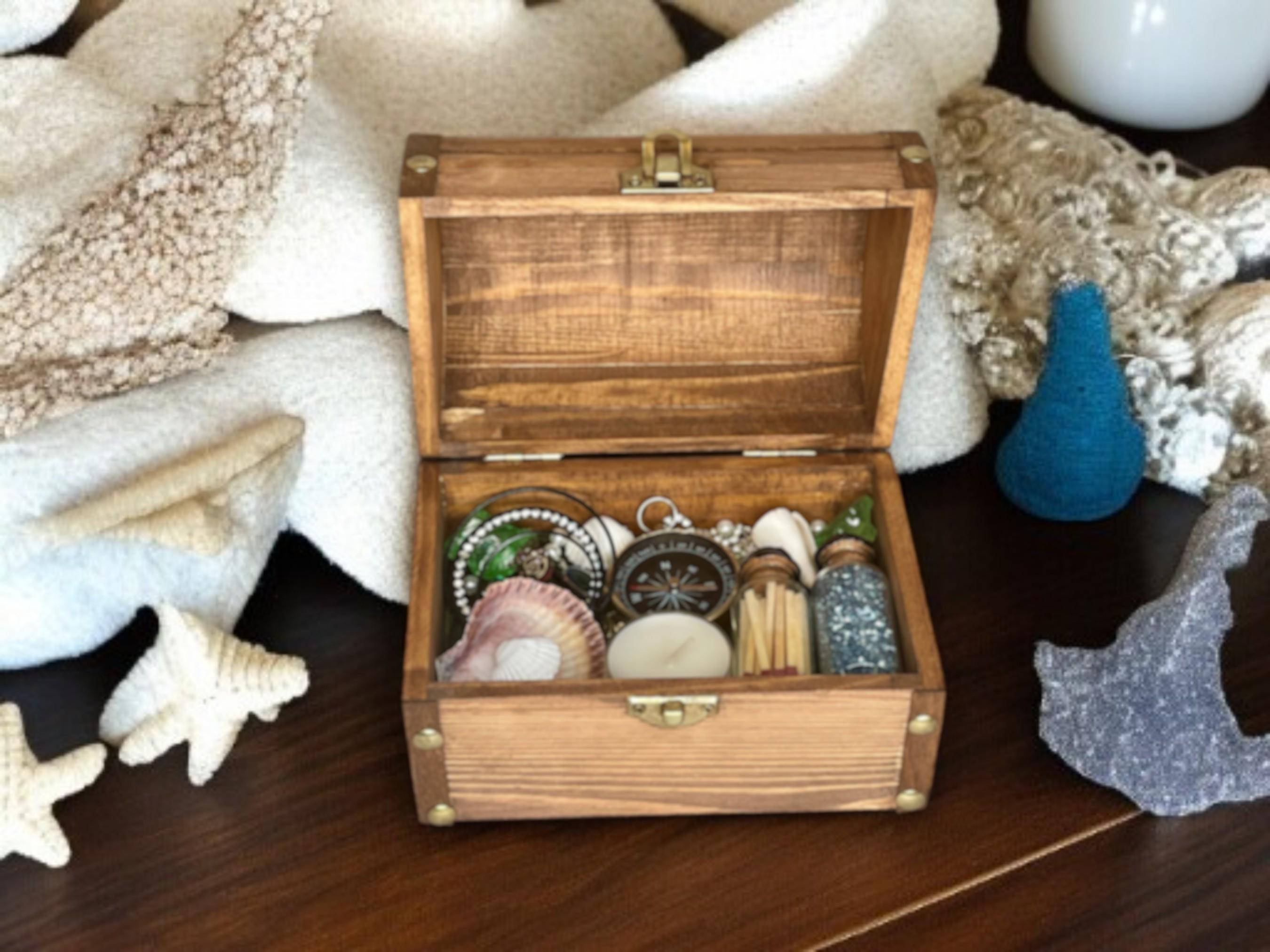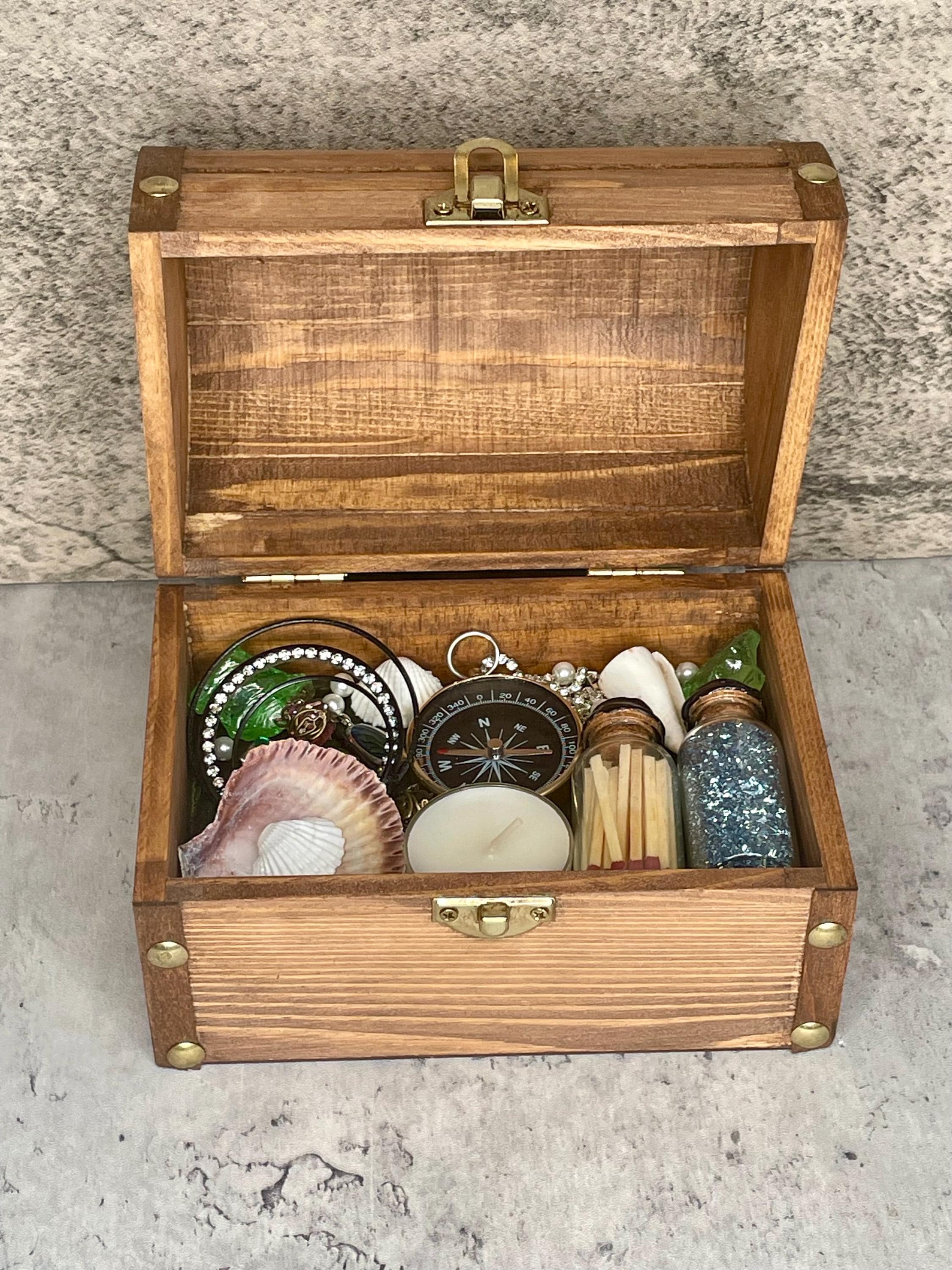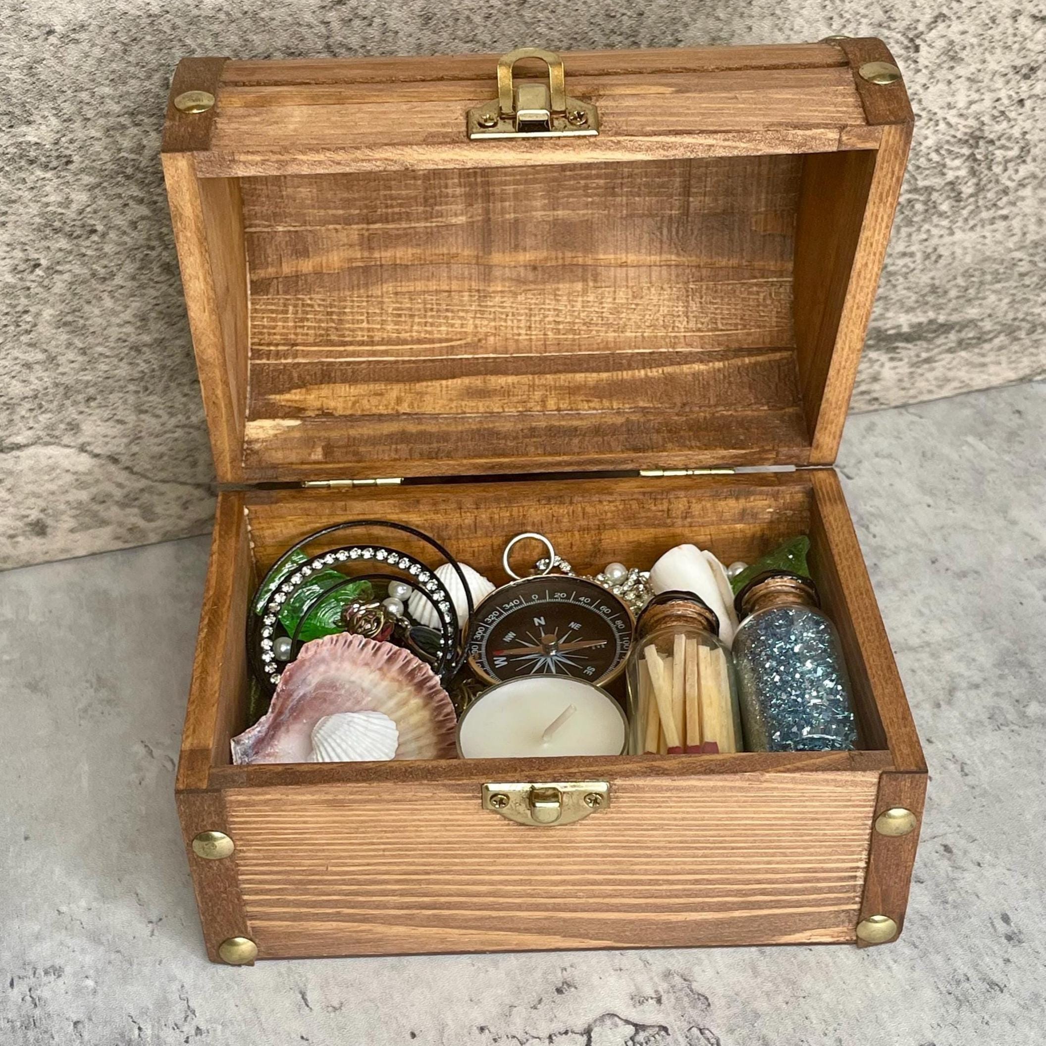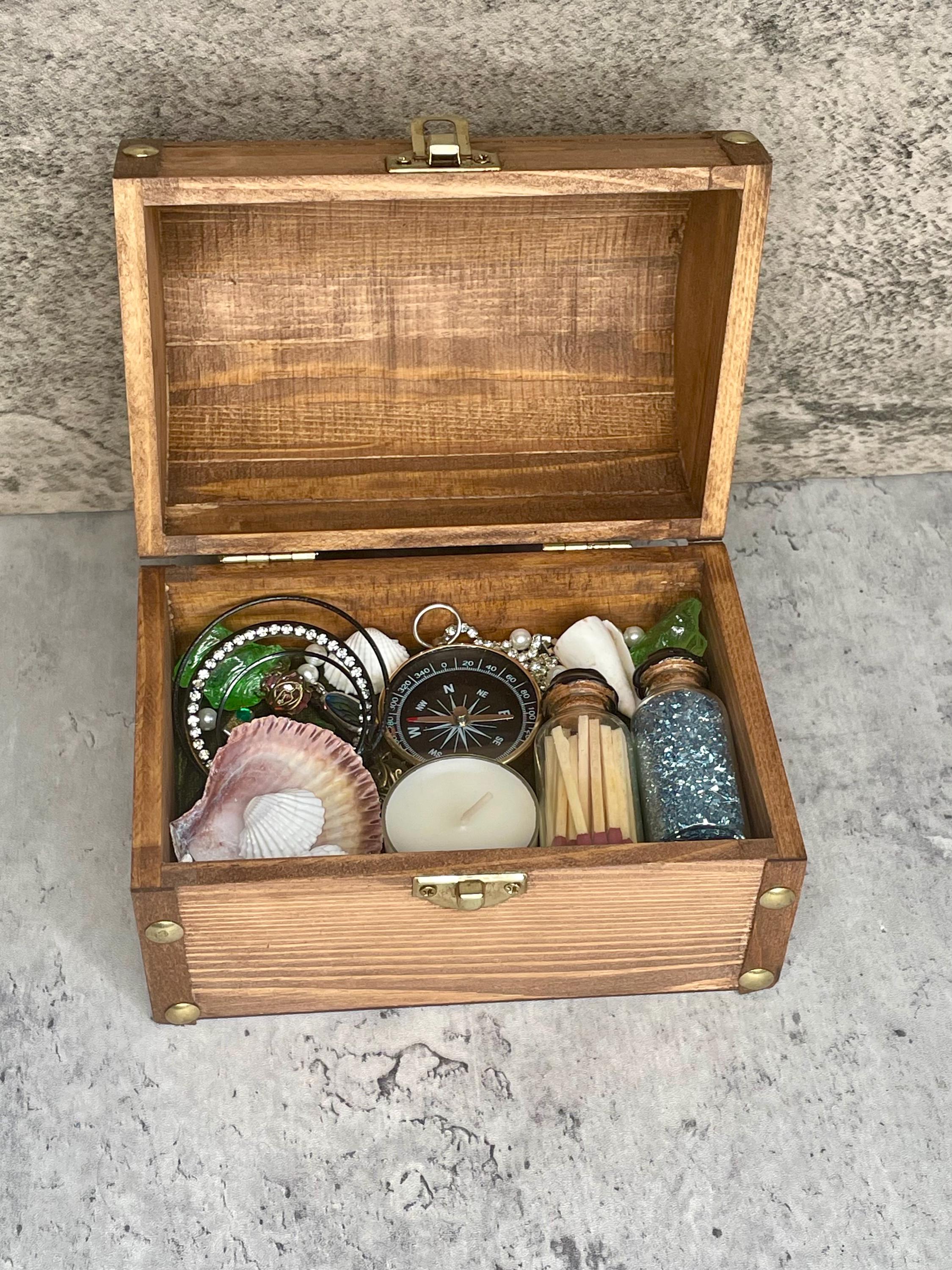 Mermaid summoning treasure chest includes a distressed wooden chest with metal clasp filled with treasure (recycled costume jewelry, beads, glitter), seashells, tea candle, sea glass, matches, and compass. All items sit upon a green velvet background and are not affixed in place. Mermaids, water nymphs, and sirens alike are sure to feel the call of the sea with this one-of-a-kind gift.