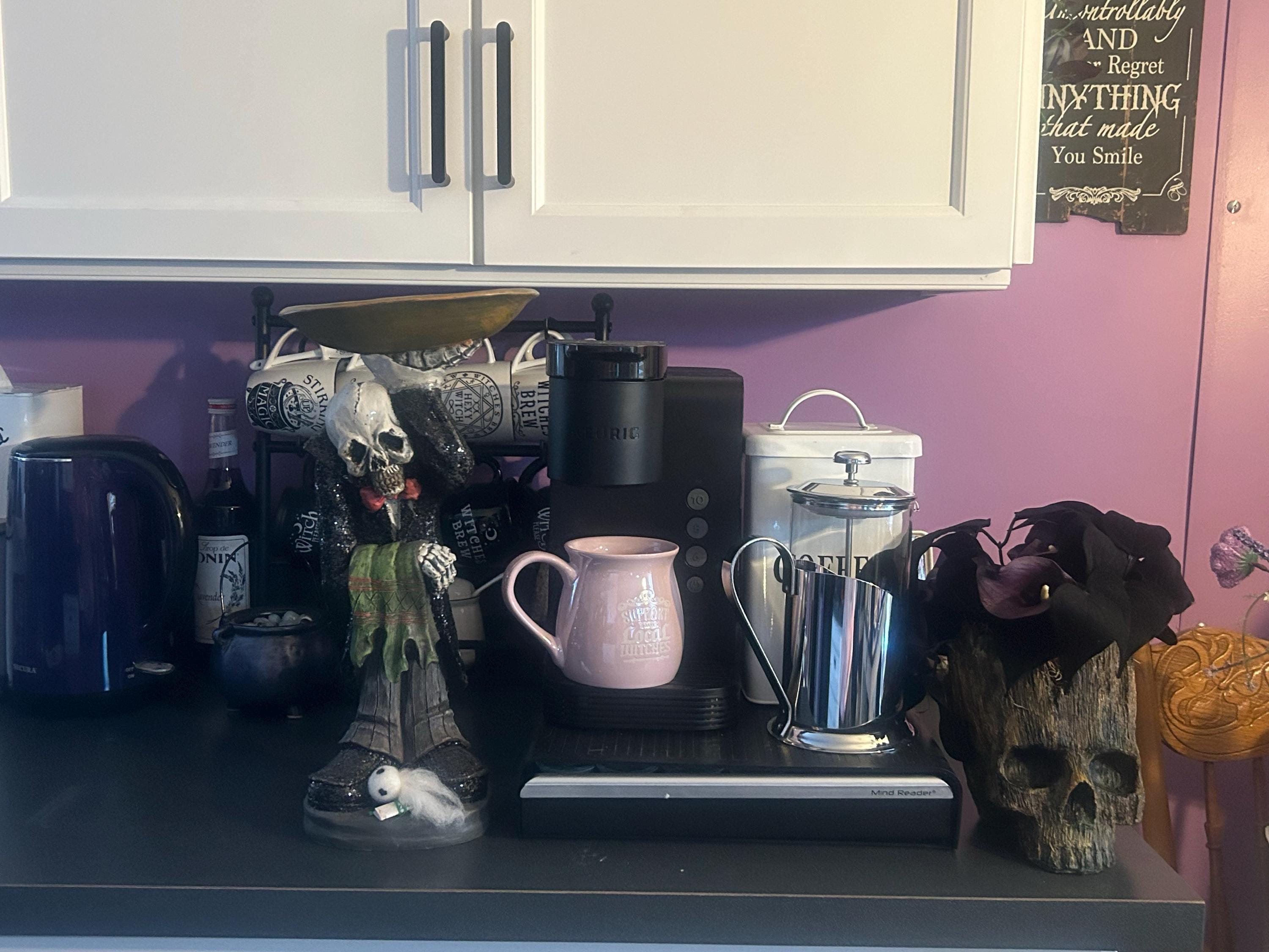 Tree skull centerpiece is made of resin with hand painted bark accents and is topped with an assortment of faux flowers. Purple leather calla lilies, black velvet leaves, and Spanish moss create a beautifully macabre addition to your table or bookshelf!