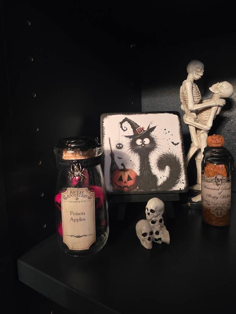 Snow White themed Poison Apples Potion Bottle is hand-crafted and contains red mini apples with black wax detail and black triple moon wax seal. Glass bottle features black cording and a silver spider embellishment. A great addition for Halloween or your apothecary collection!