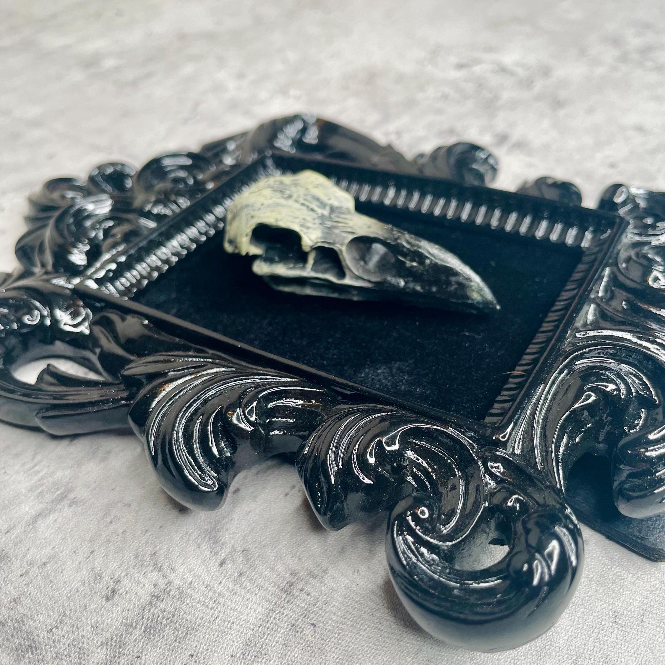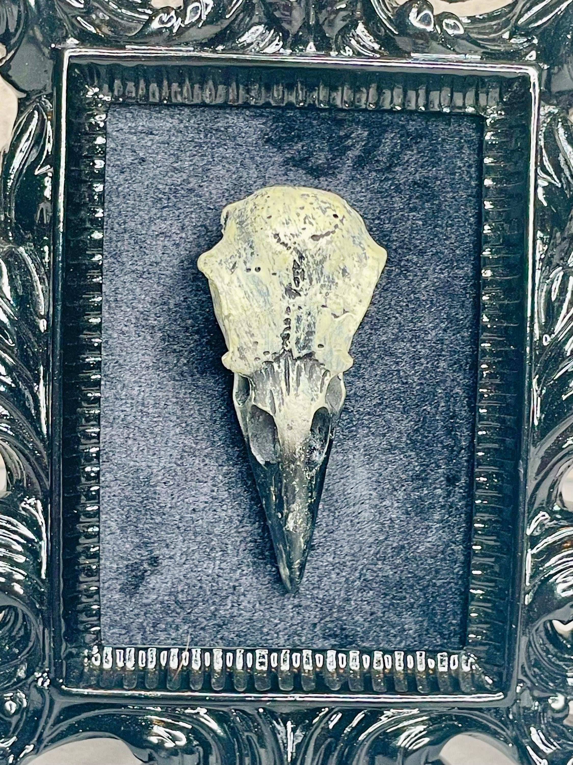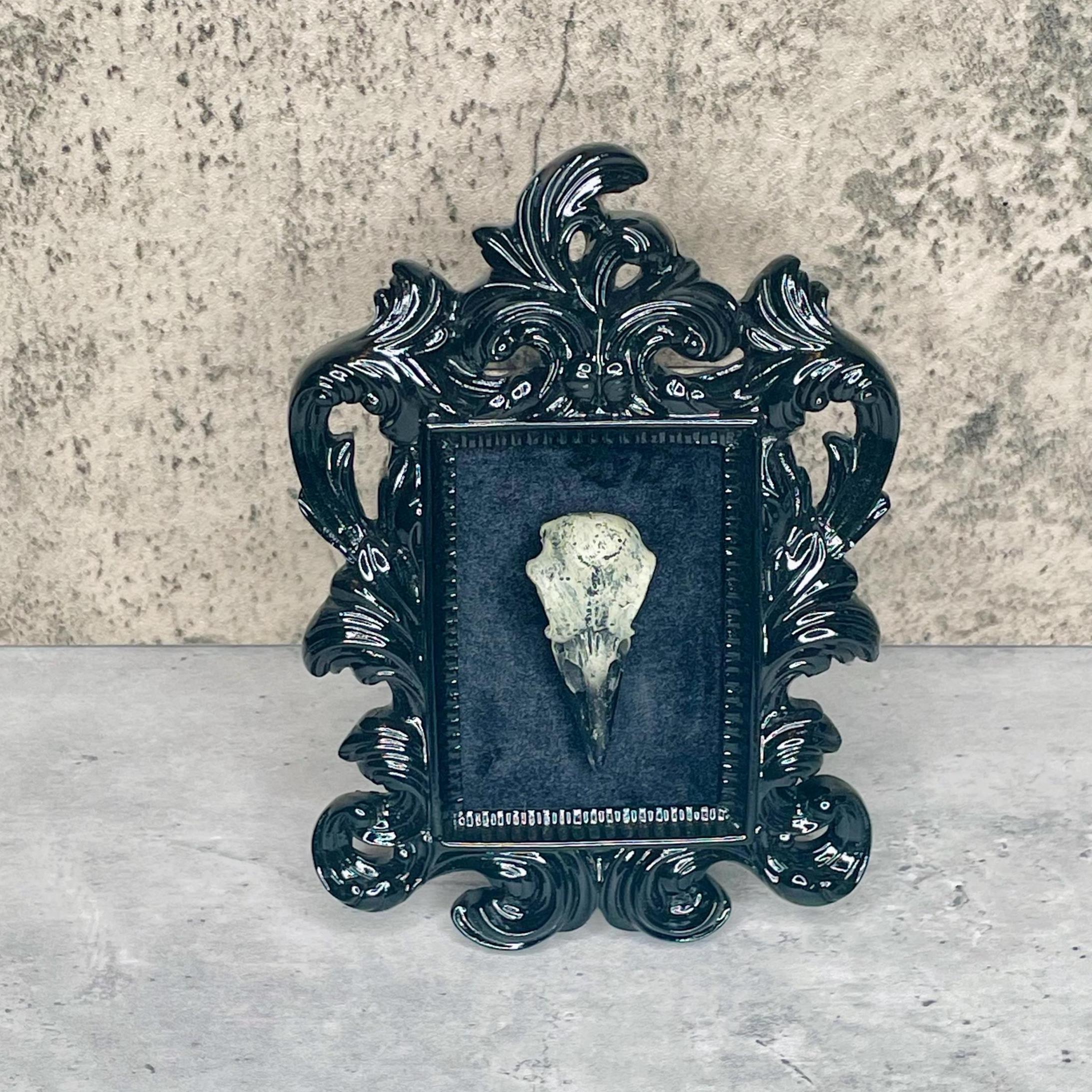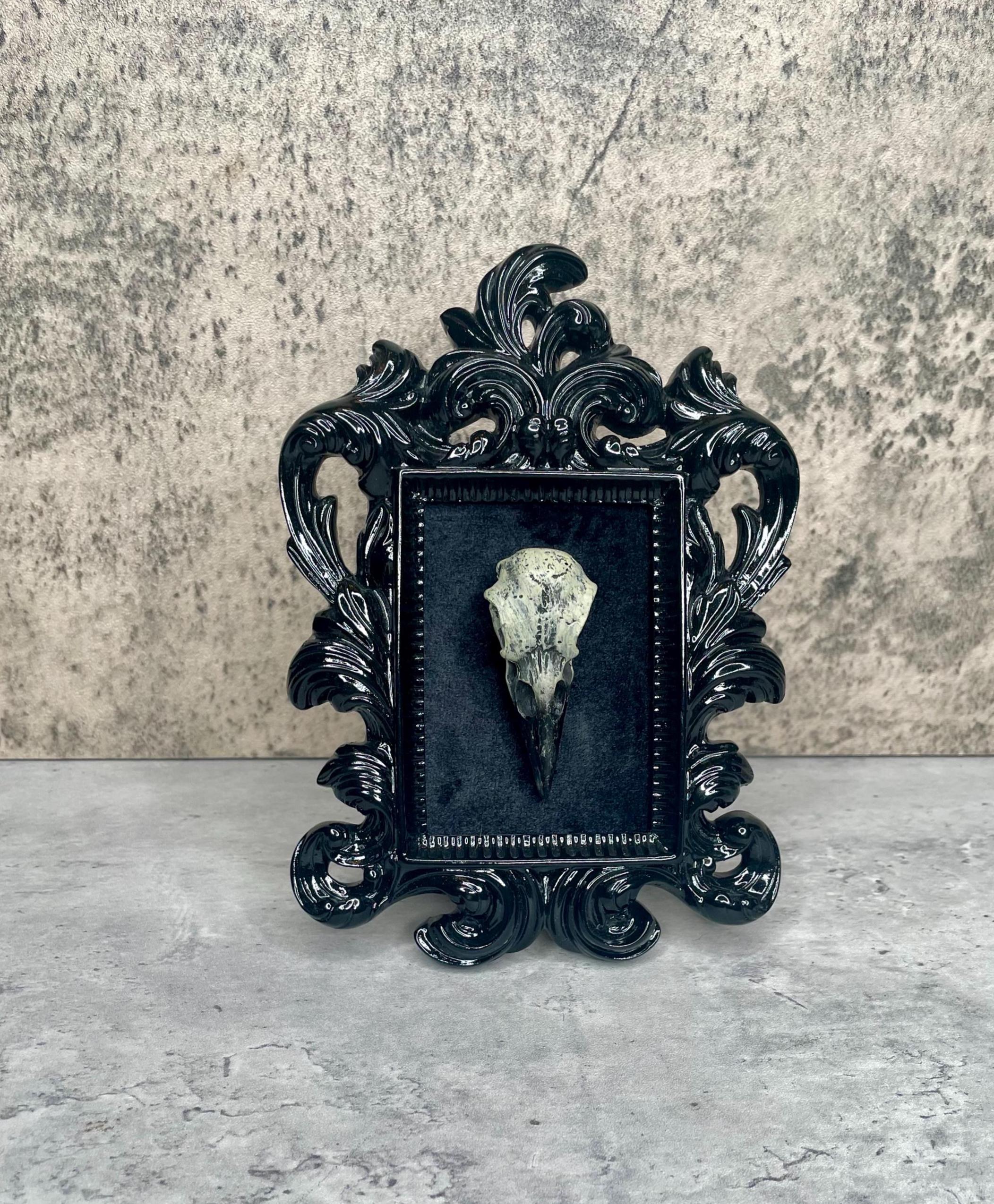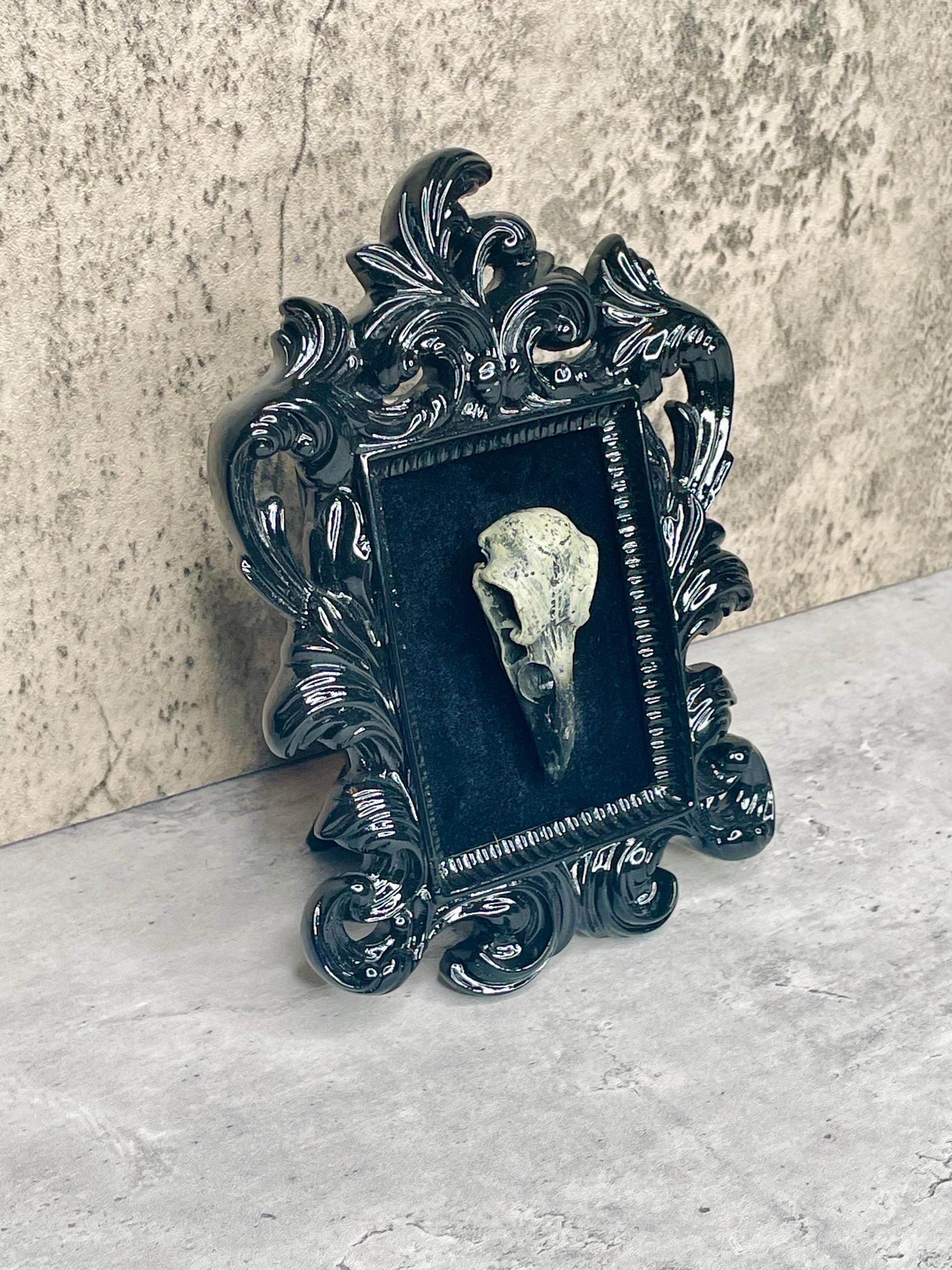 Resin raven bird skull affixed to black velvet background with ornate, black resin frame. Perfect gothic addition for your desk or mantel piece!