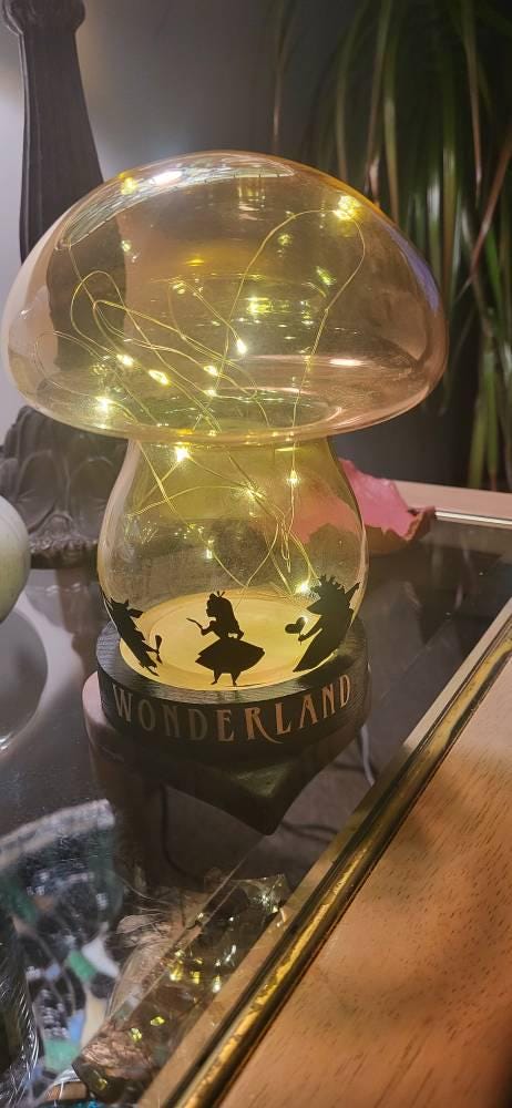 Alice In Wonderland themed mushroom fairy light accent is made of glass and features vinyl Alice, Rabbit, and the Queen of Hearts. Wooden black base, with gold "Wonderland" lettering has switch located underneath. The perfect addition to your Alice collection!