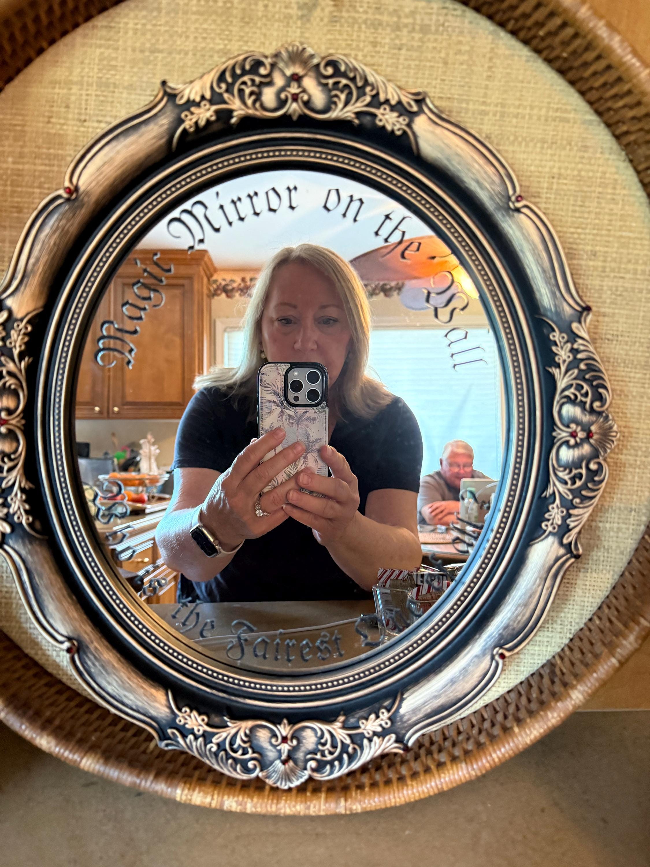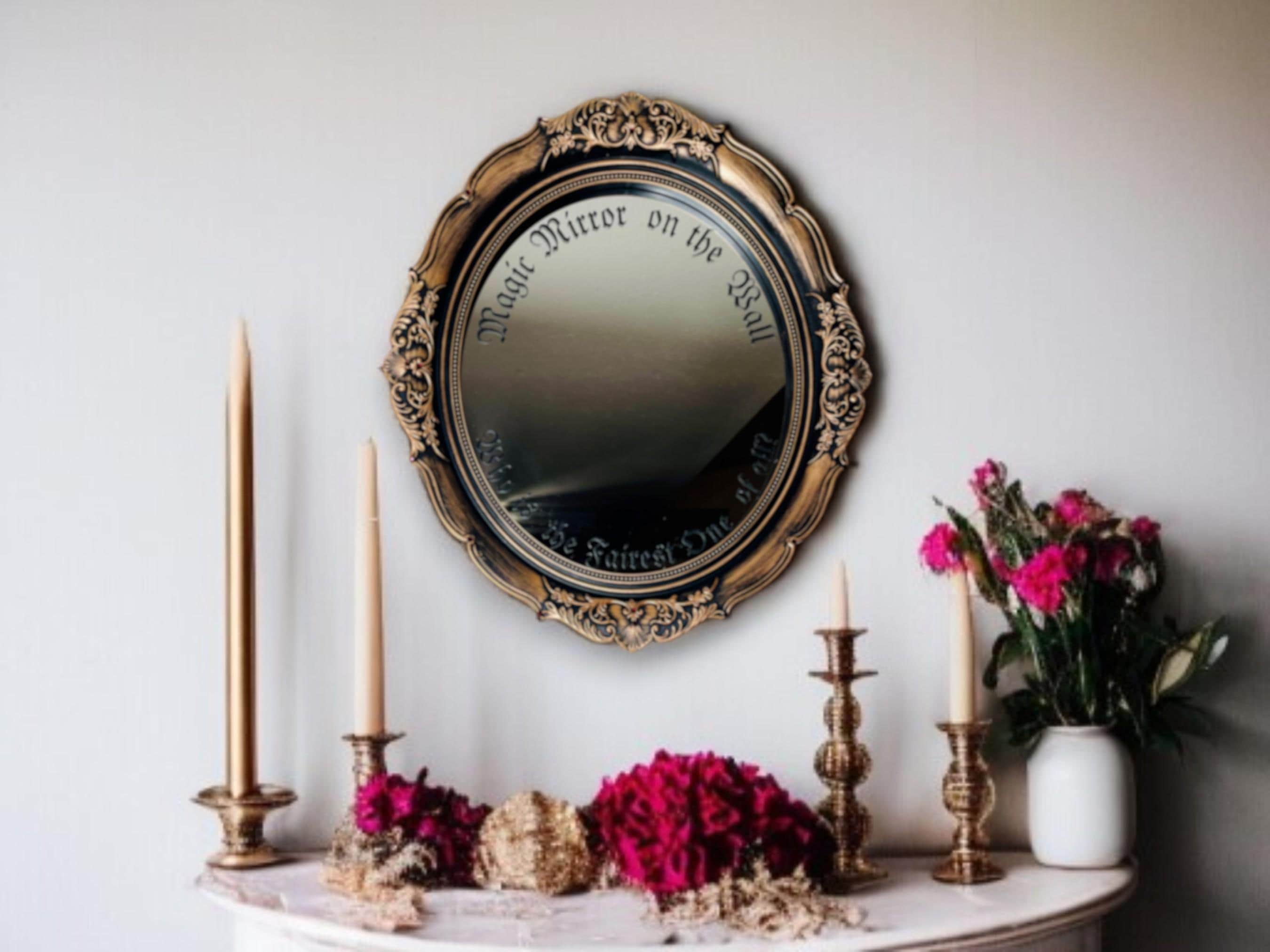 Snow White themed magic mirror is made of lightweight plastic with a vintage gold base and red rhinestone accents. Vinyl lettering on mirror reads, “Magic Mirror on the Wall