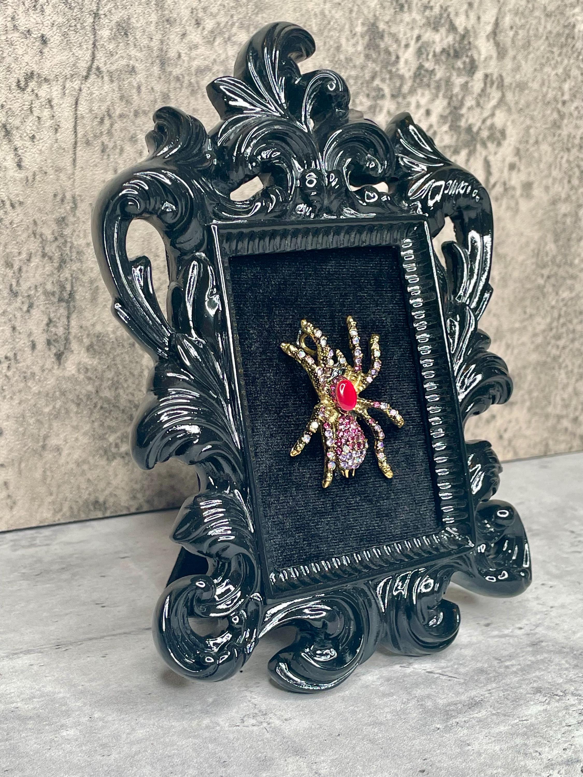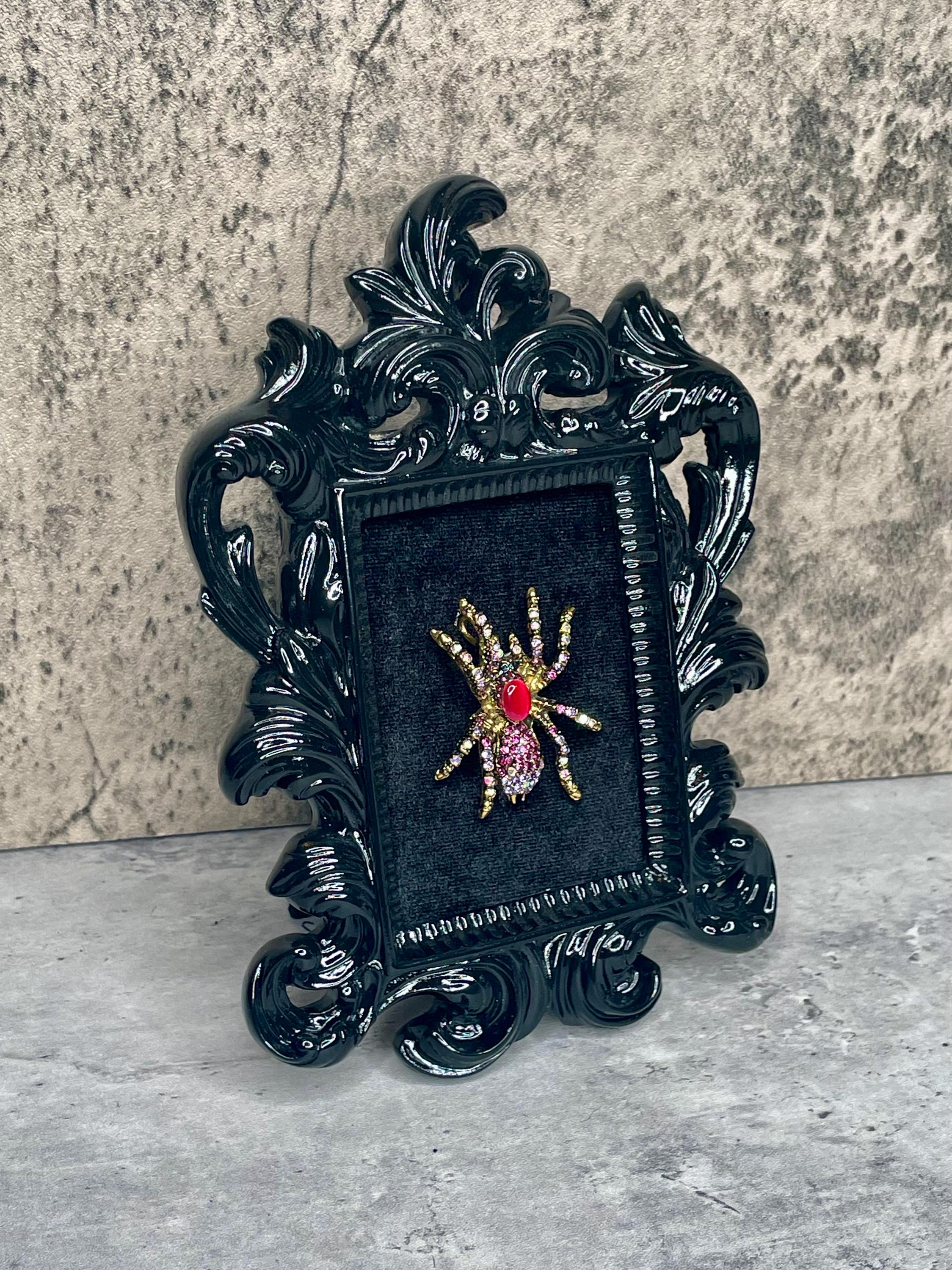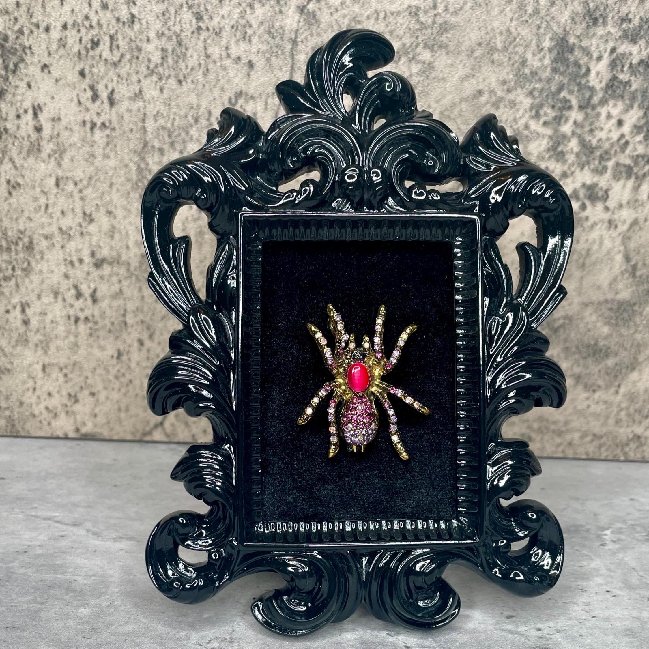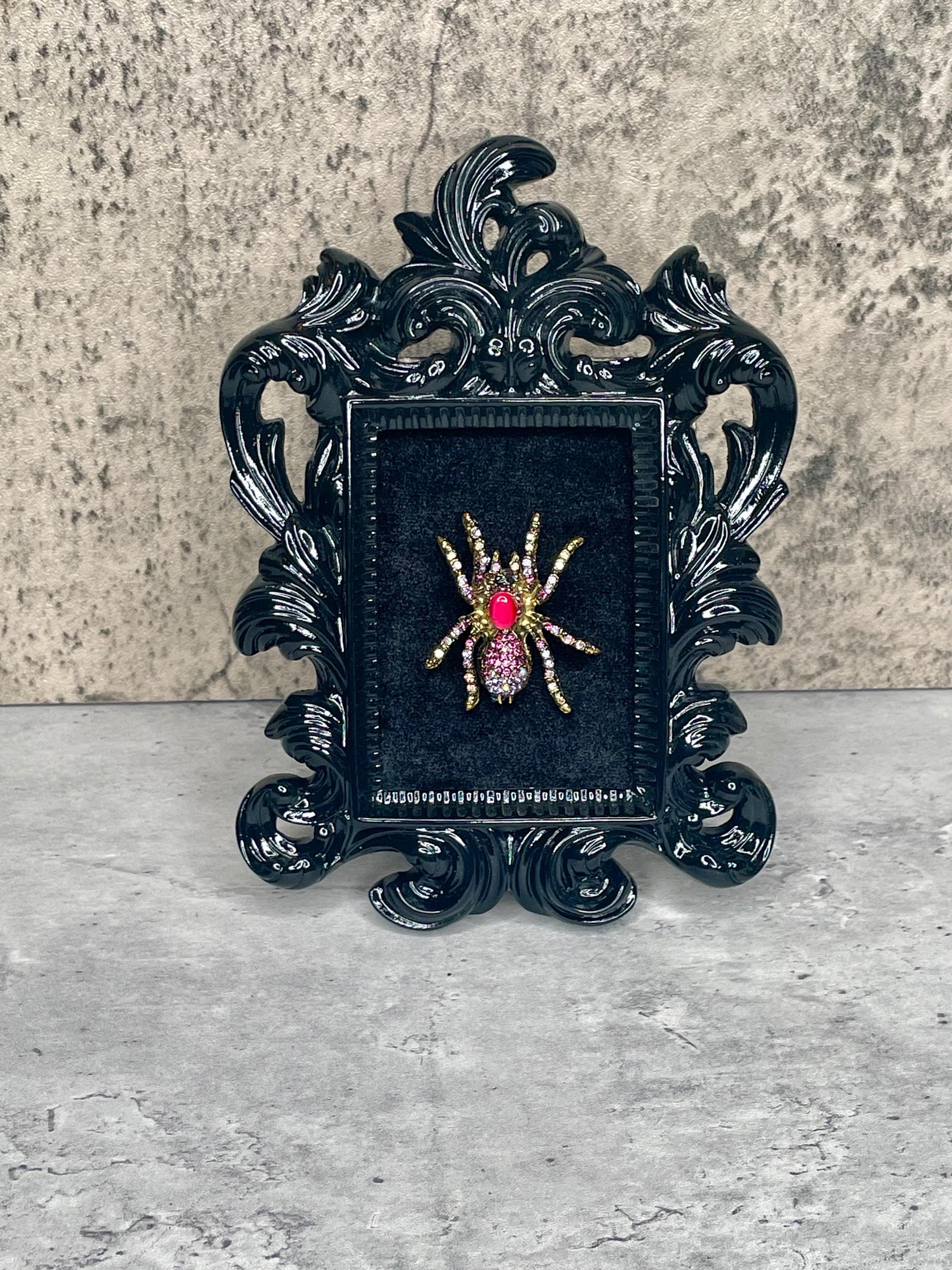 Pink and clear rhinestone spider affixed to black velvet background with ornate, black resin frame. Perfect gothic addition for your desk or mantel piece!