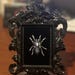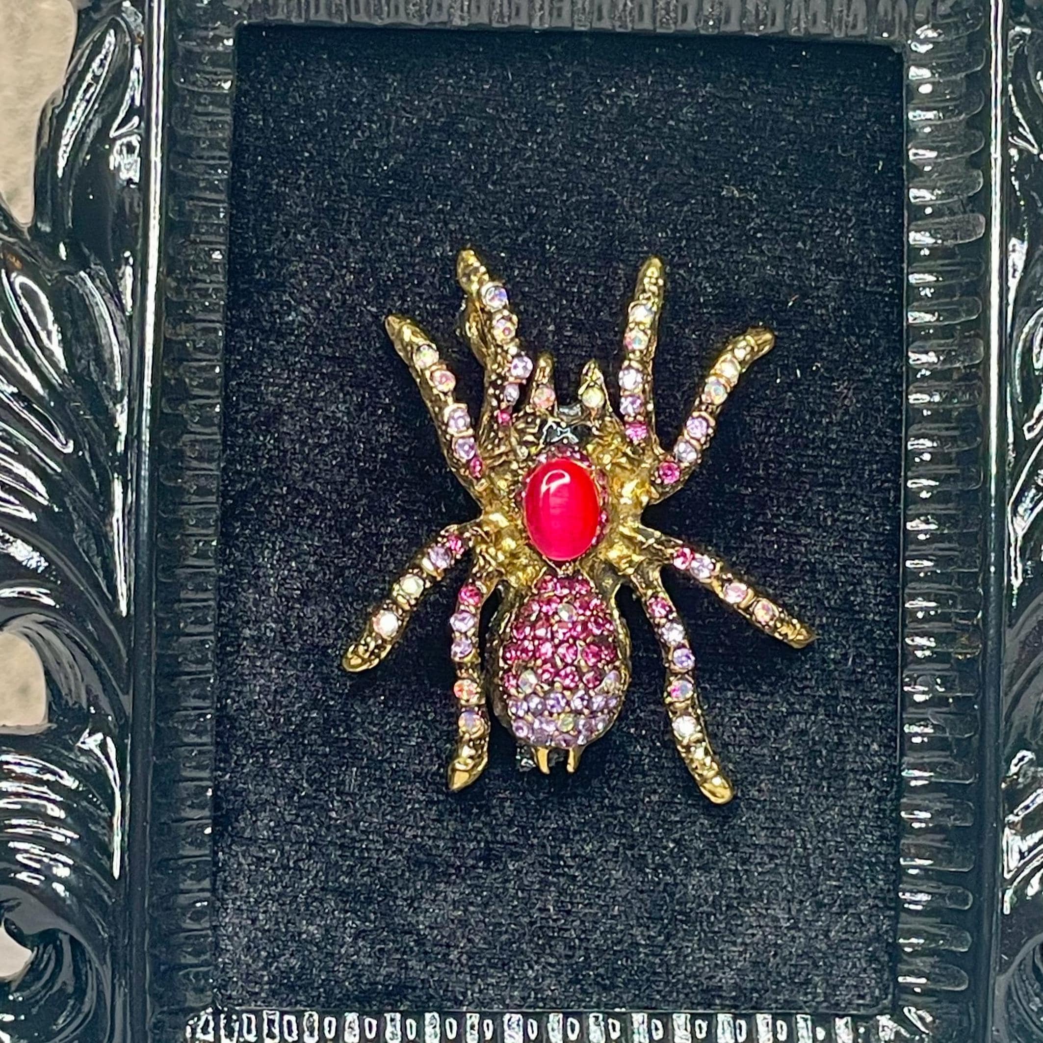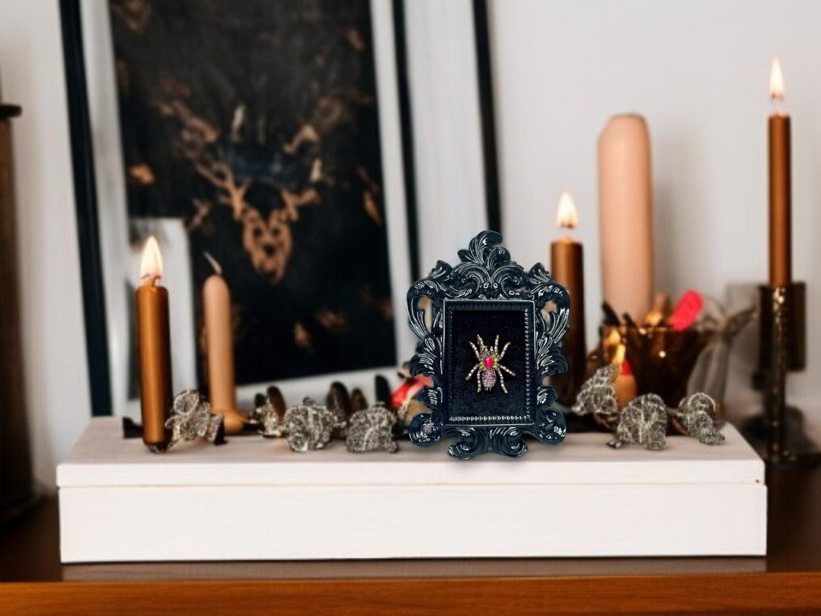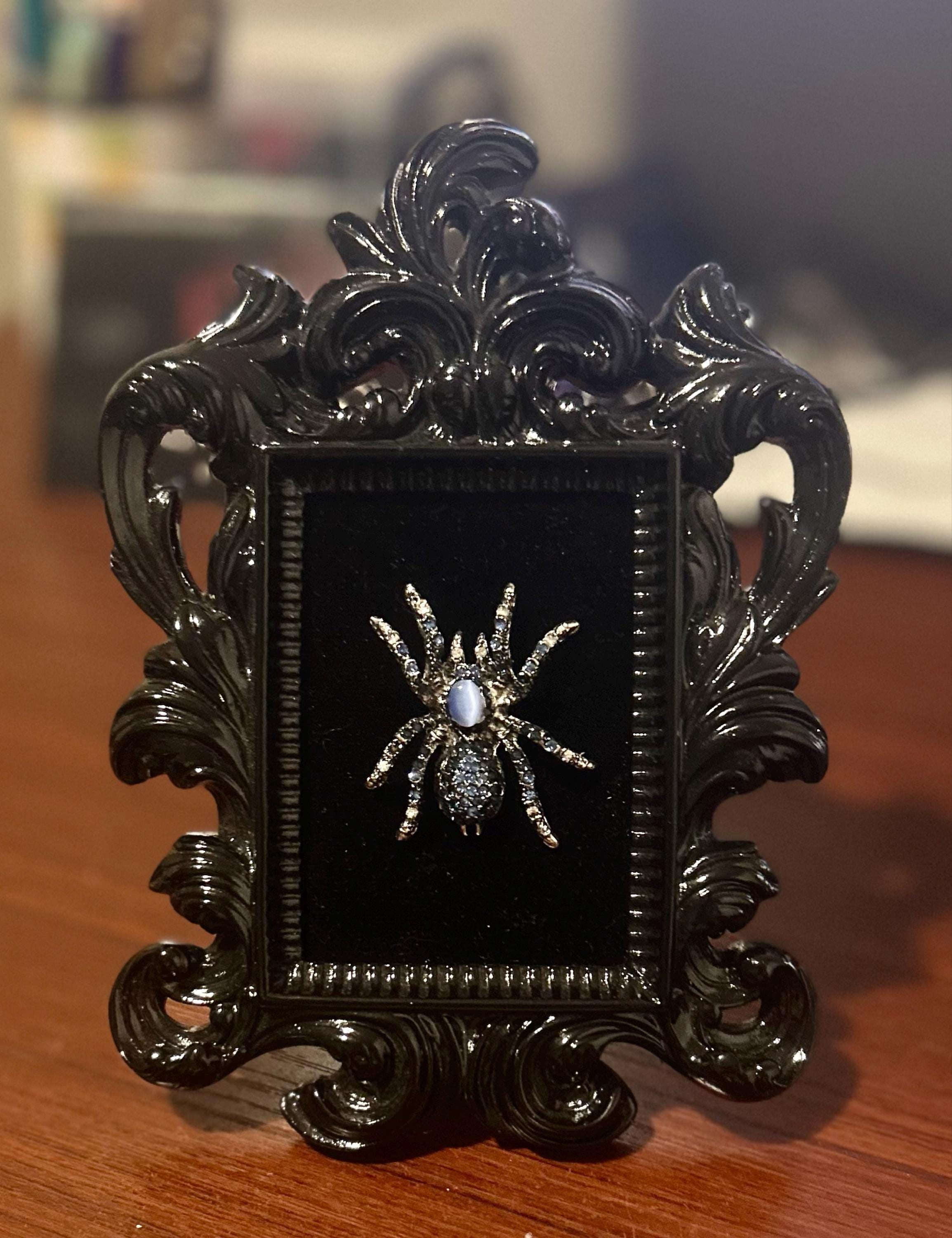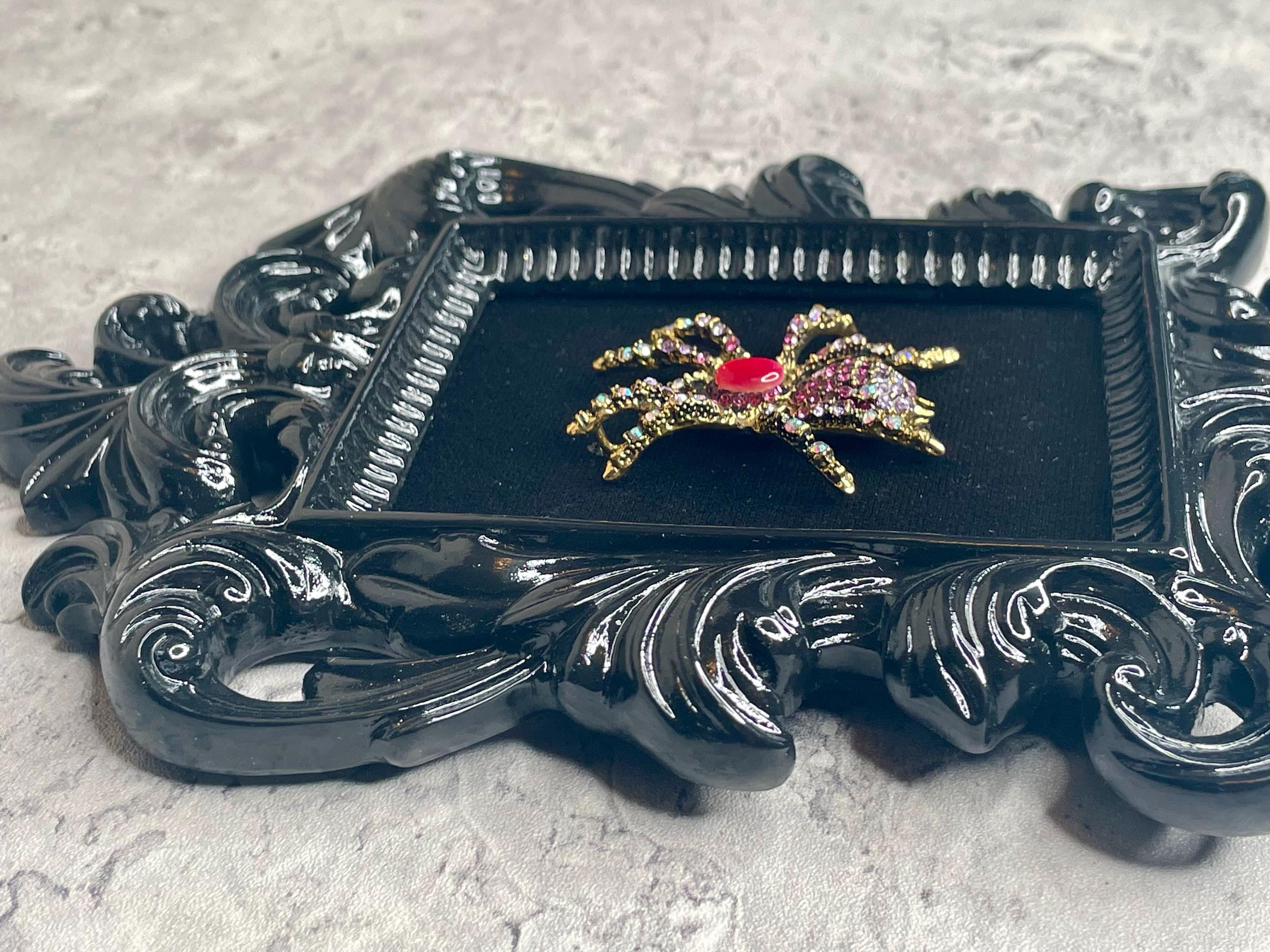 Pink and clear rhinestone spider affixed to black velvet background with ornate, black resin frame. Perfect gothic addition for your desk or mantel piece!
