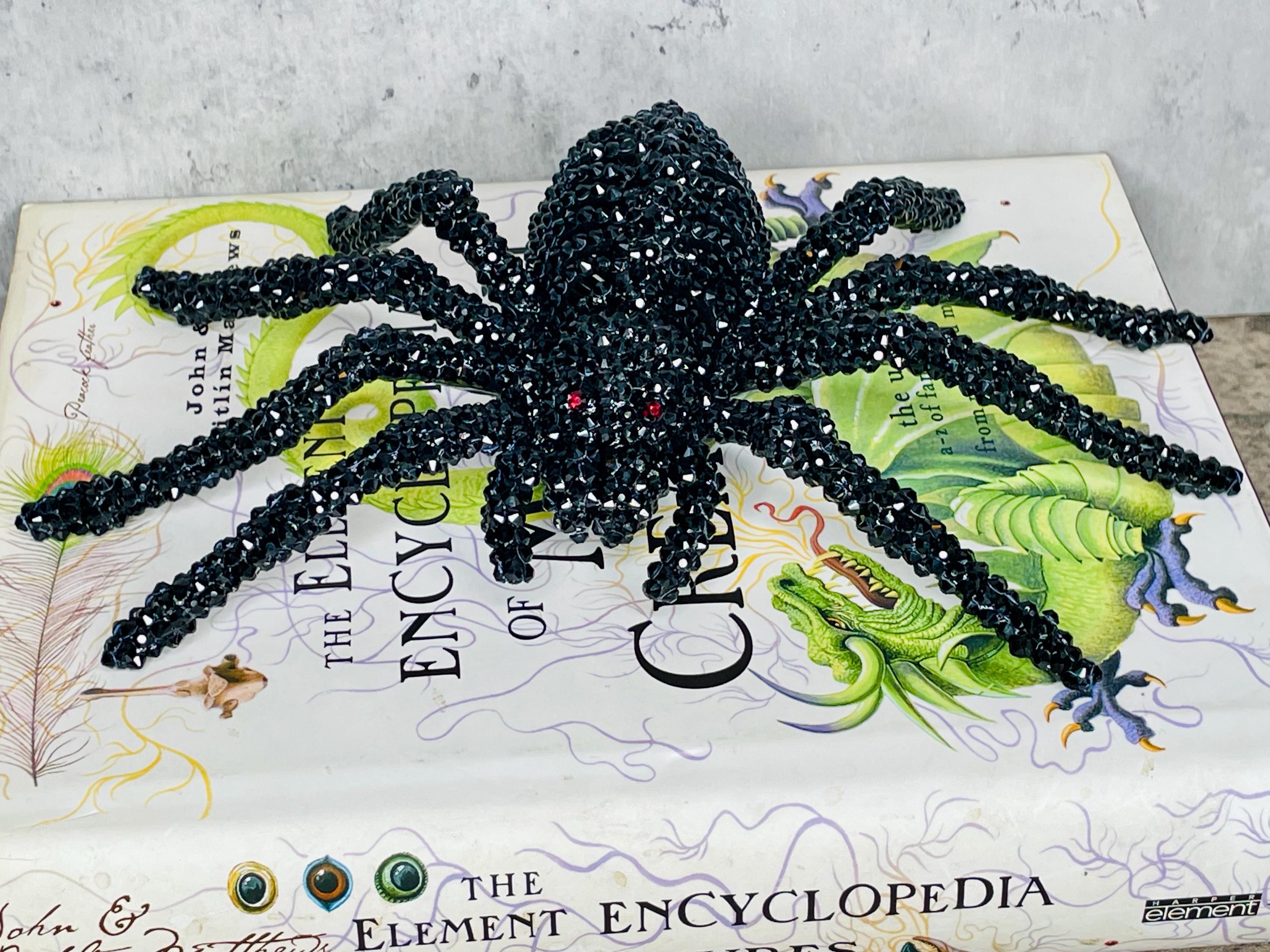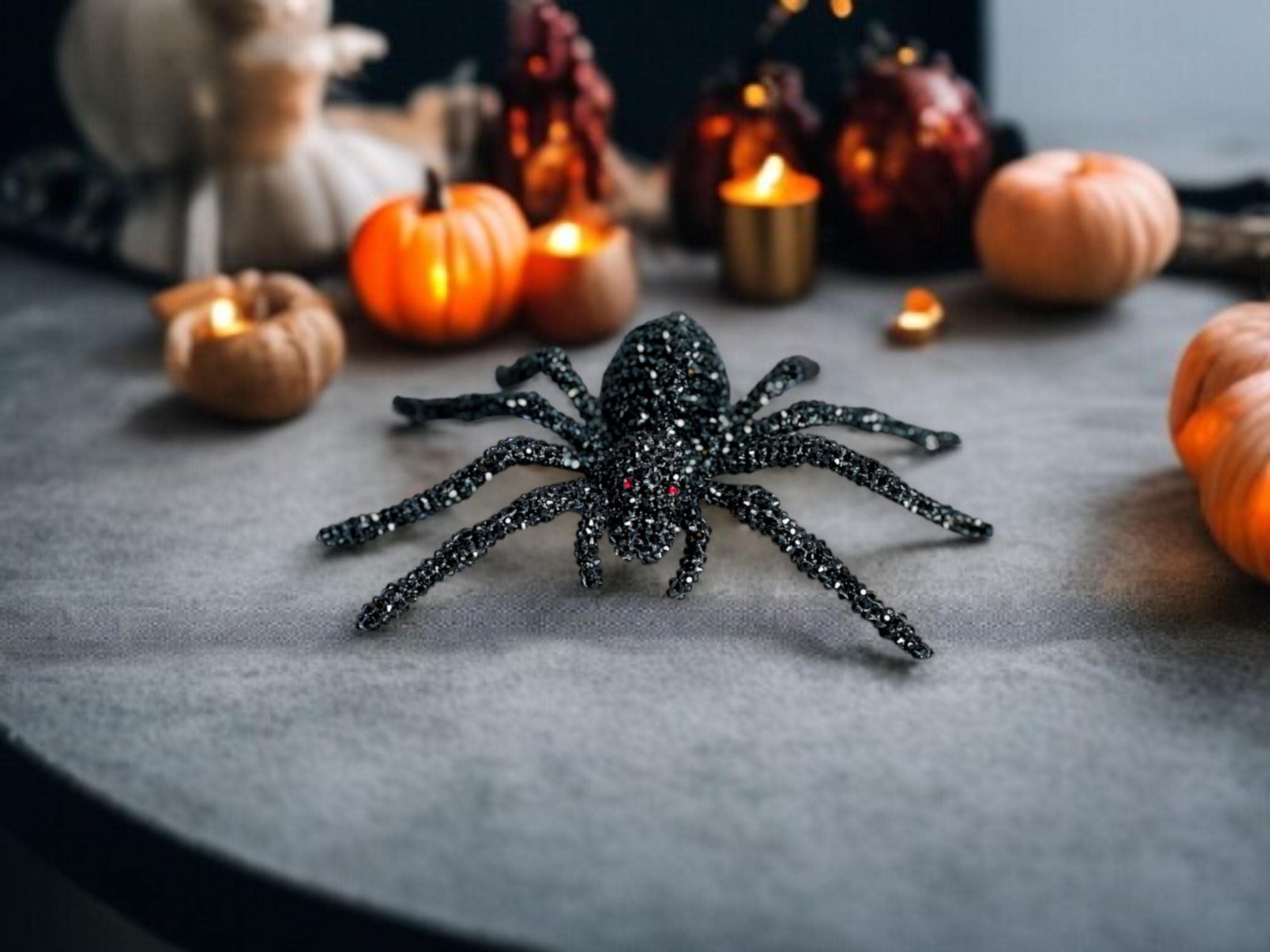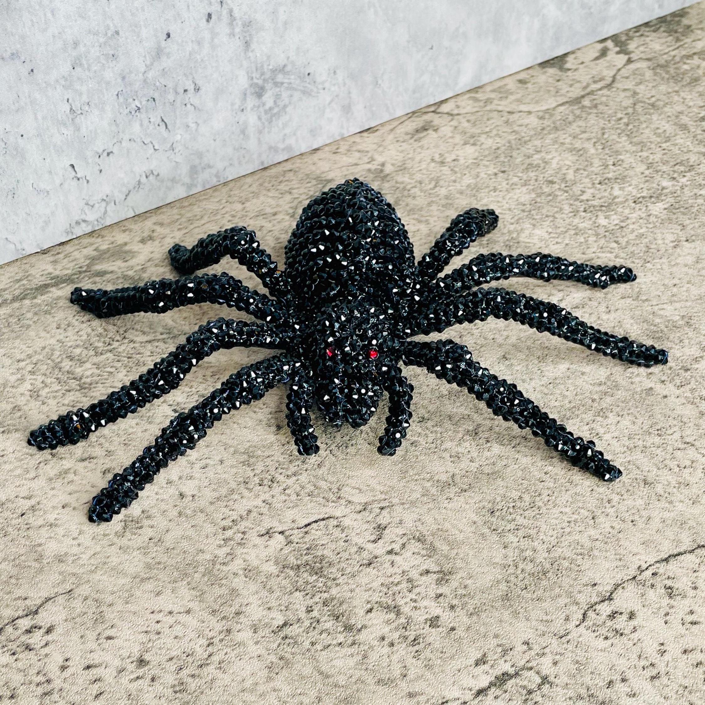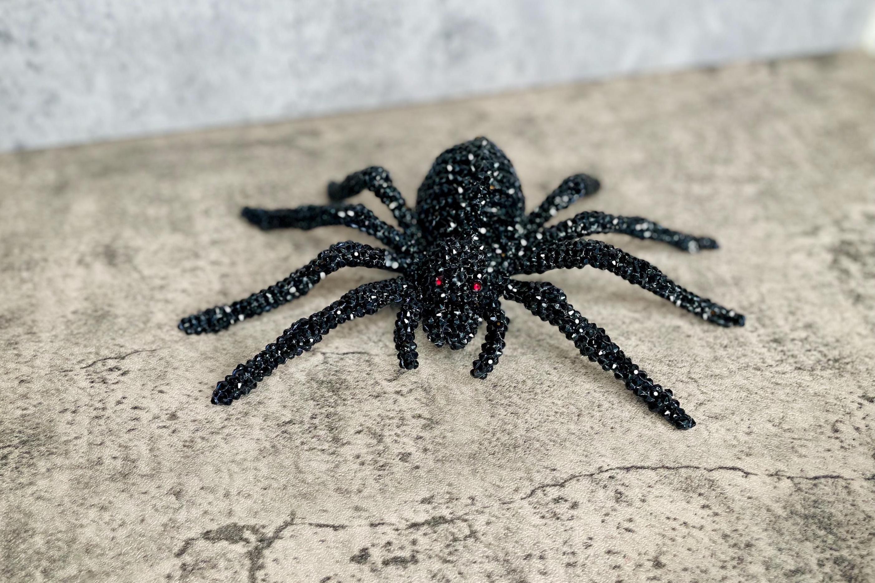 Faux black spider skeleton has a black plastic base and is adorned with black and red (eyes) rhinestone embellishments. This unique accessory is perfect for Halloween or any gothic themed decor.