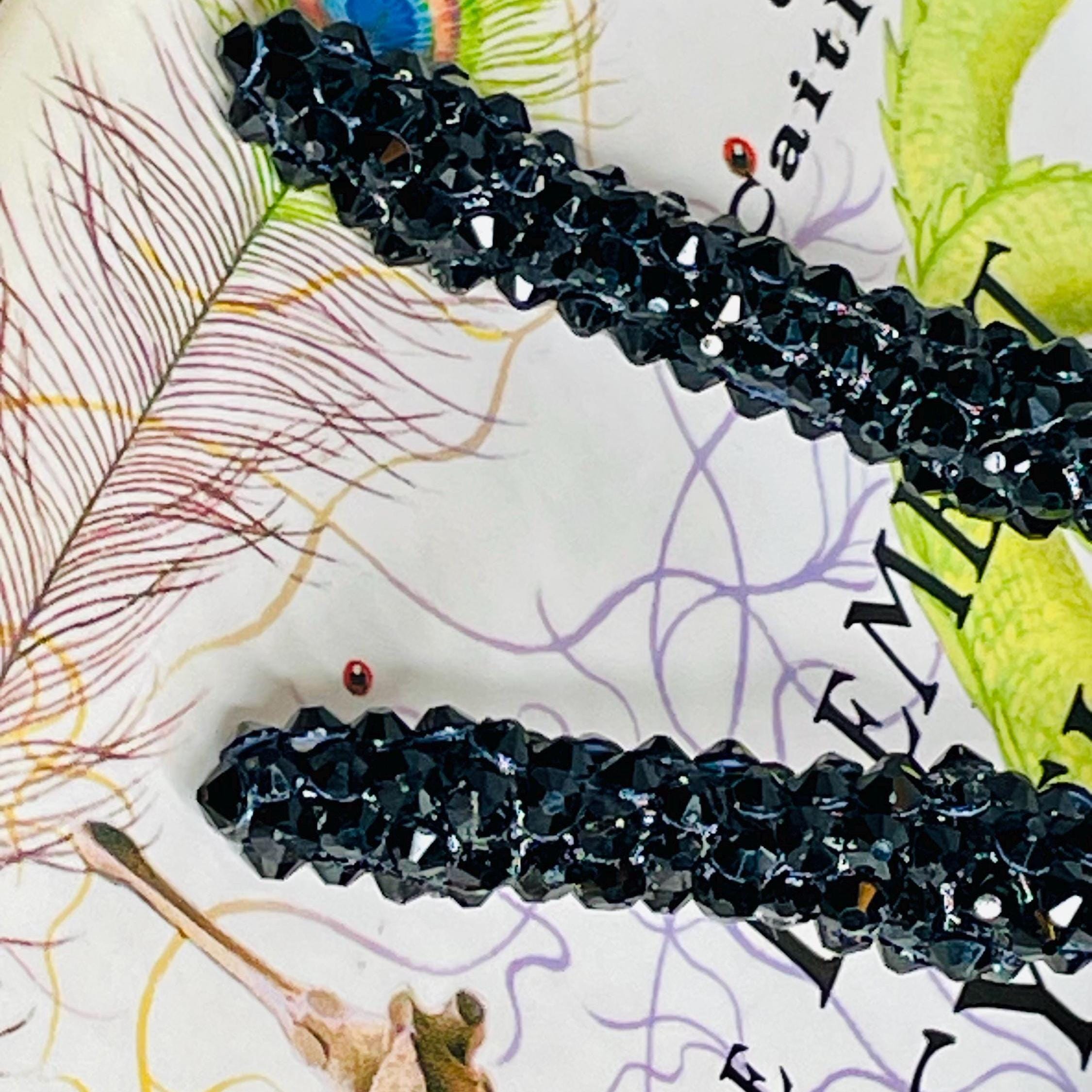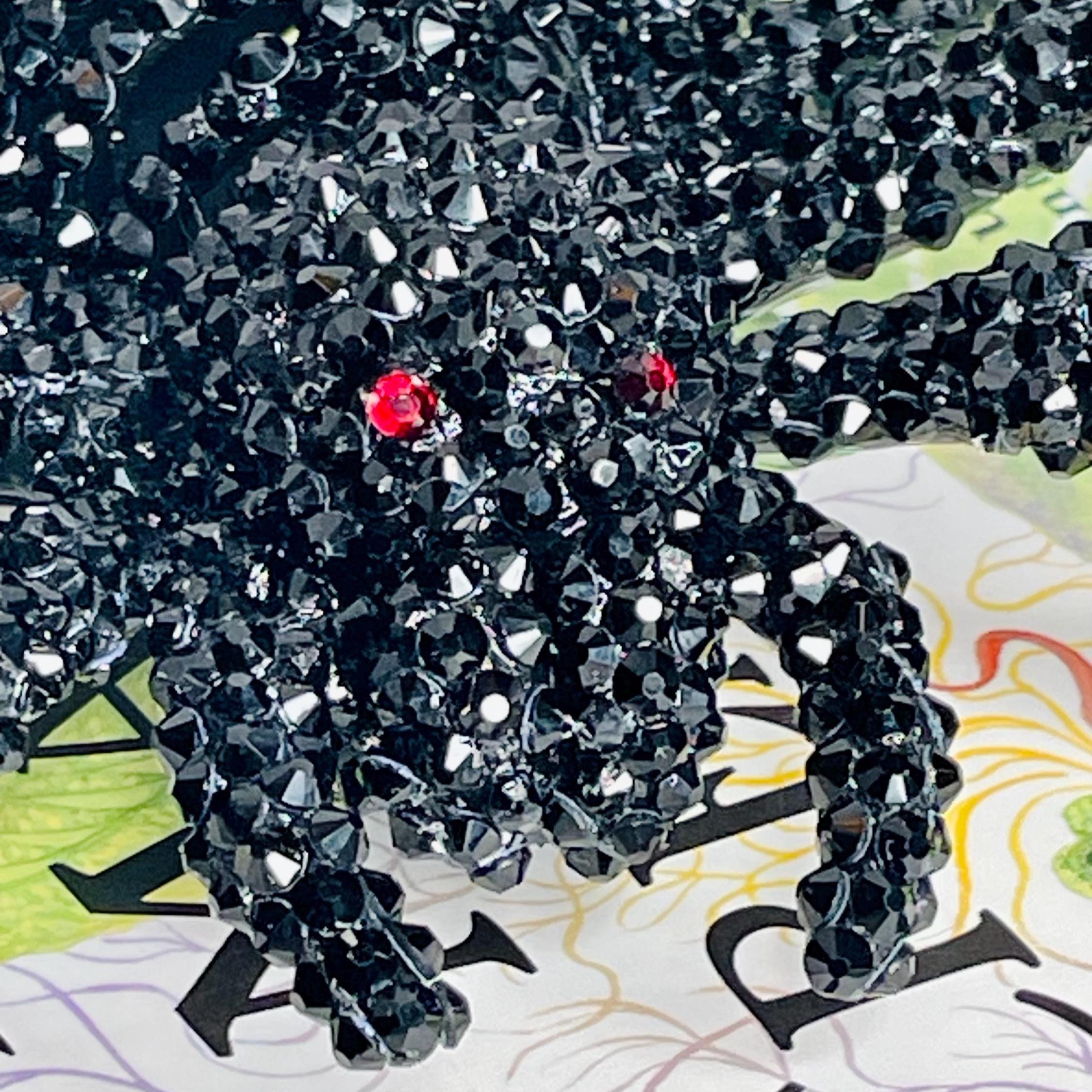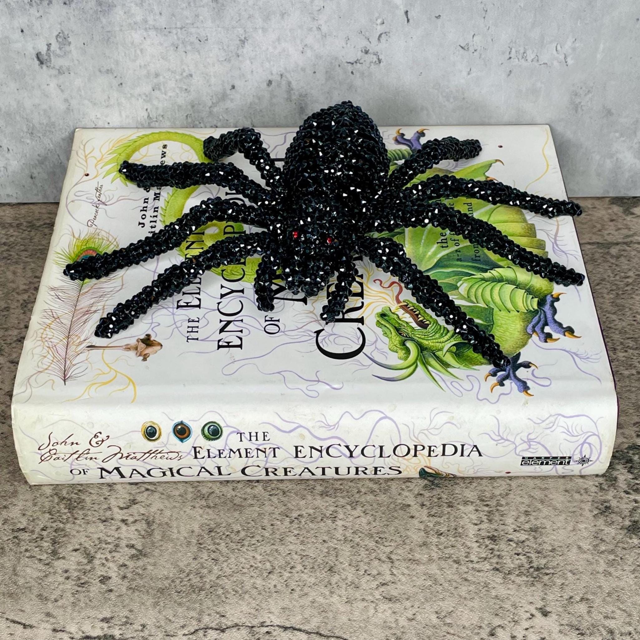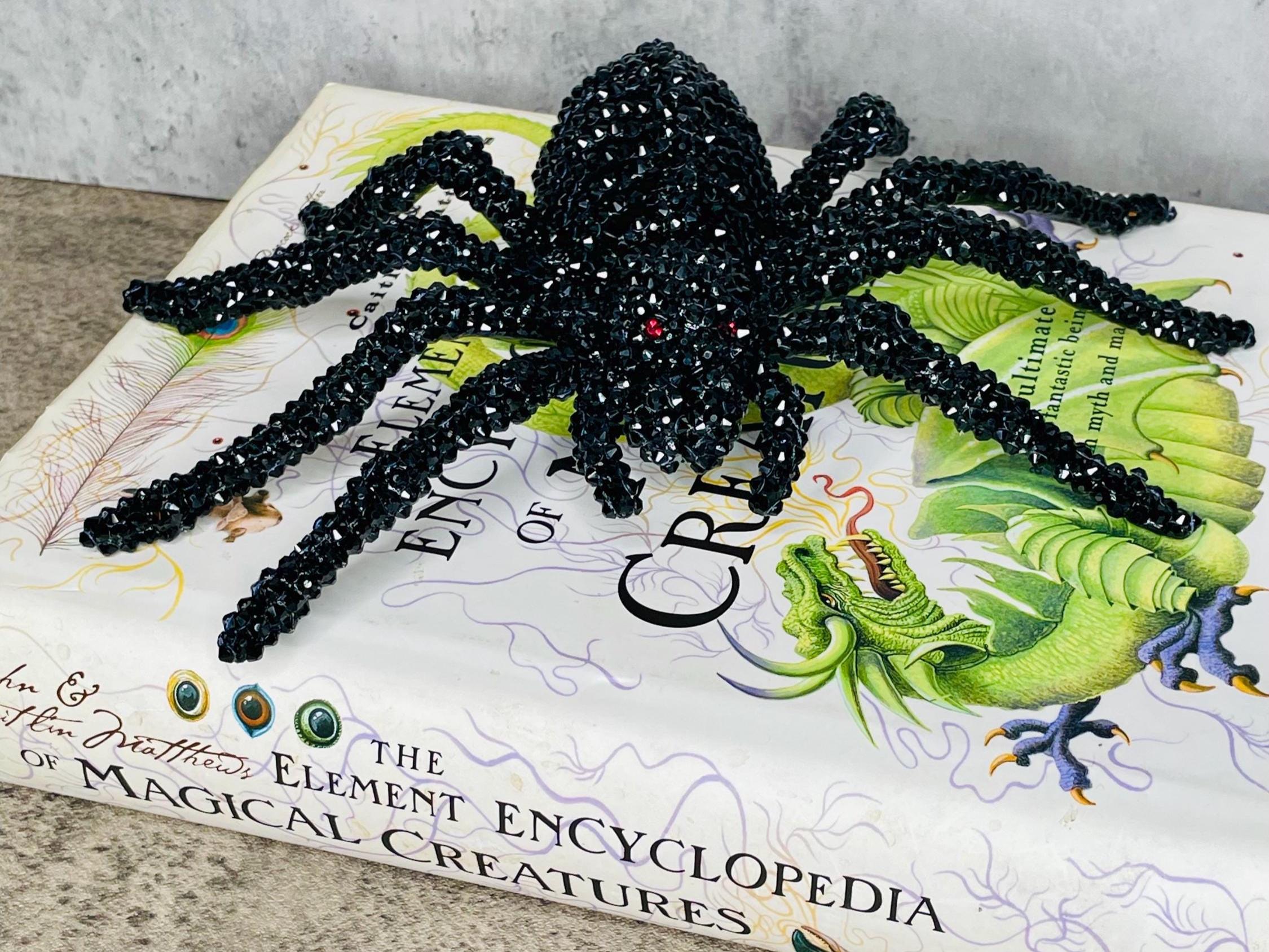 Faux black spider skeleton has a black plastic base and is adorned with black and red (eyes) rhinestone embellishments. This unique accessory is perfect for Halloween or any gothic themed decor.