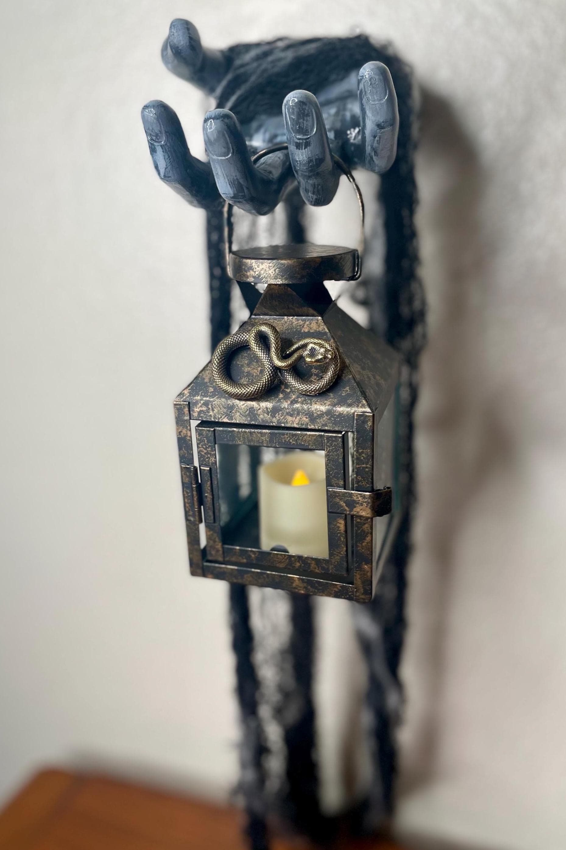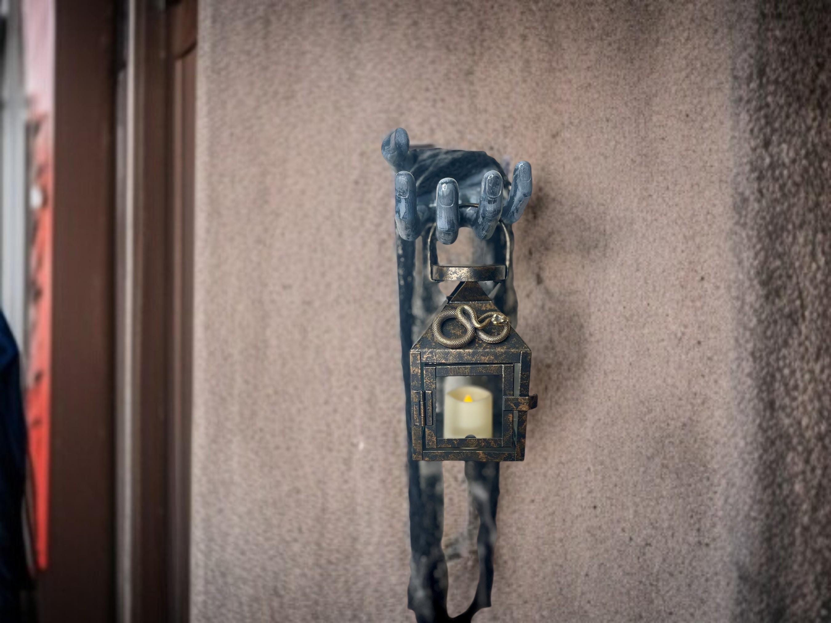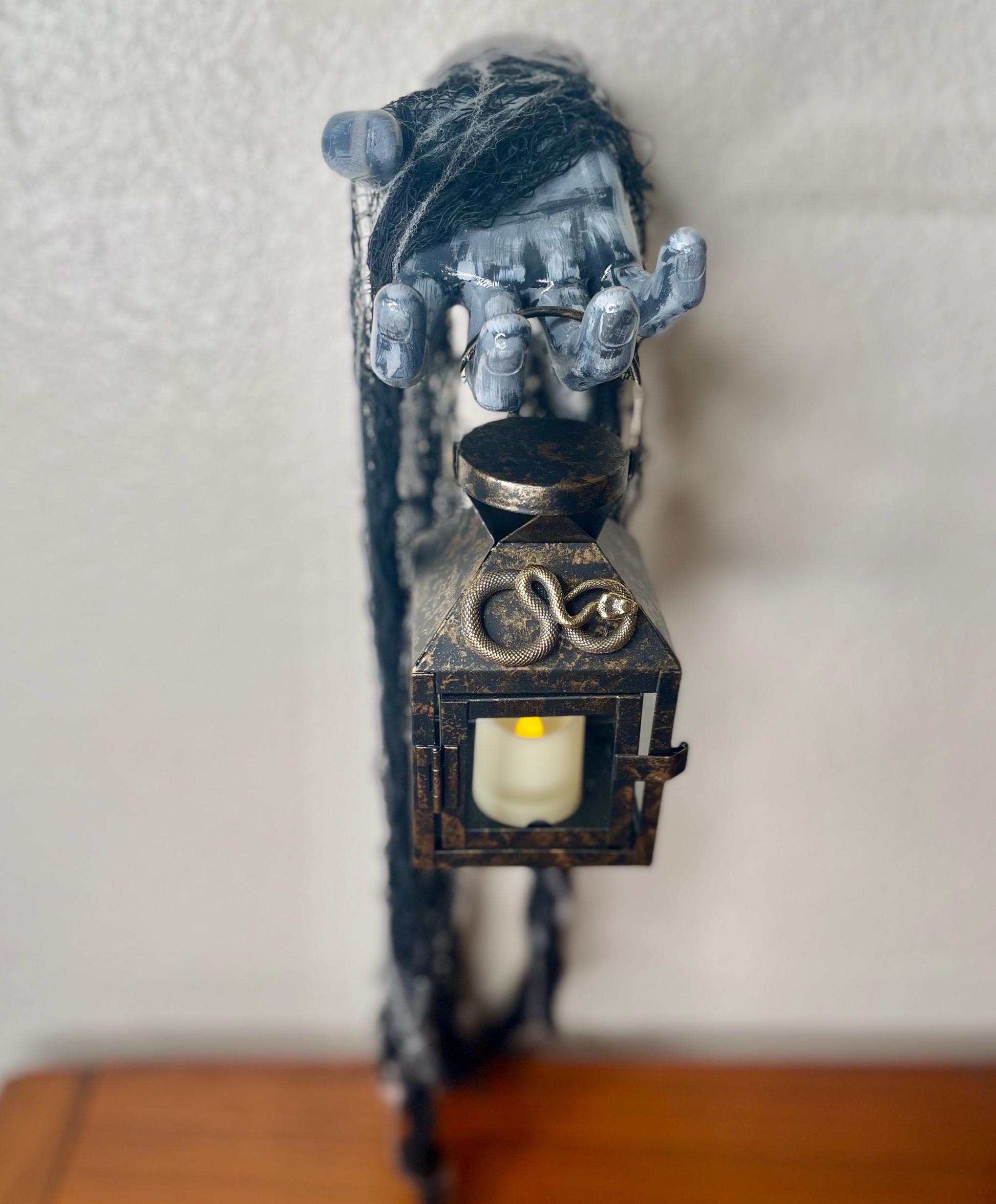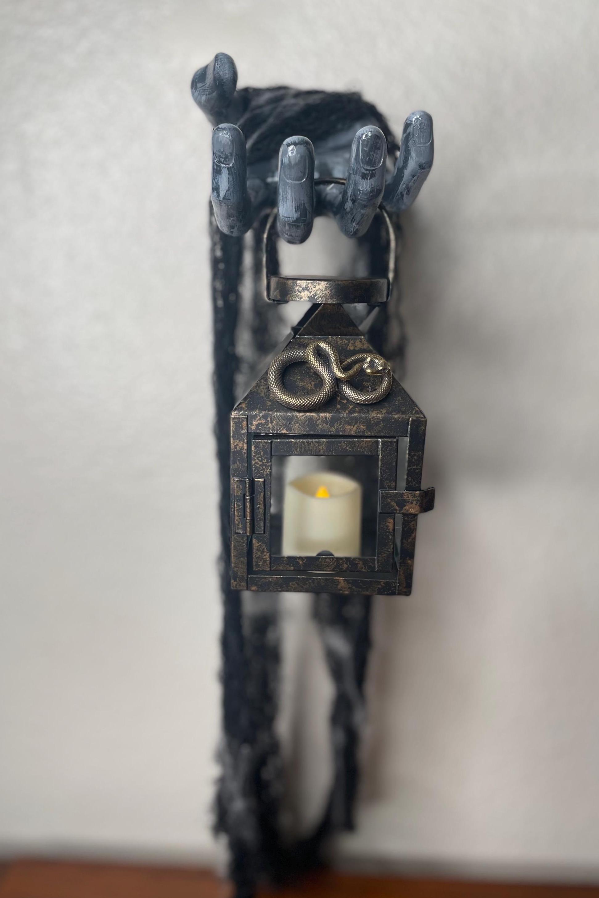 This hand painted ceramic zombie hand/arm is wall mounted with an affixed metallic snake LED candle lantern. Black fabric netting and faux spider web embellishments complete the look. Just the right amount of spooky for the zombie fan in your life!