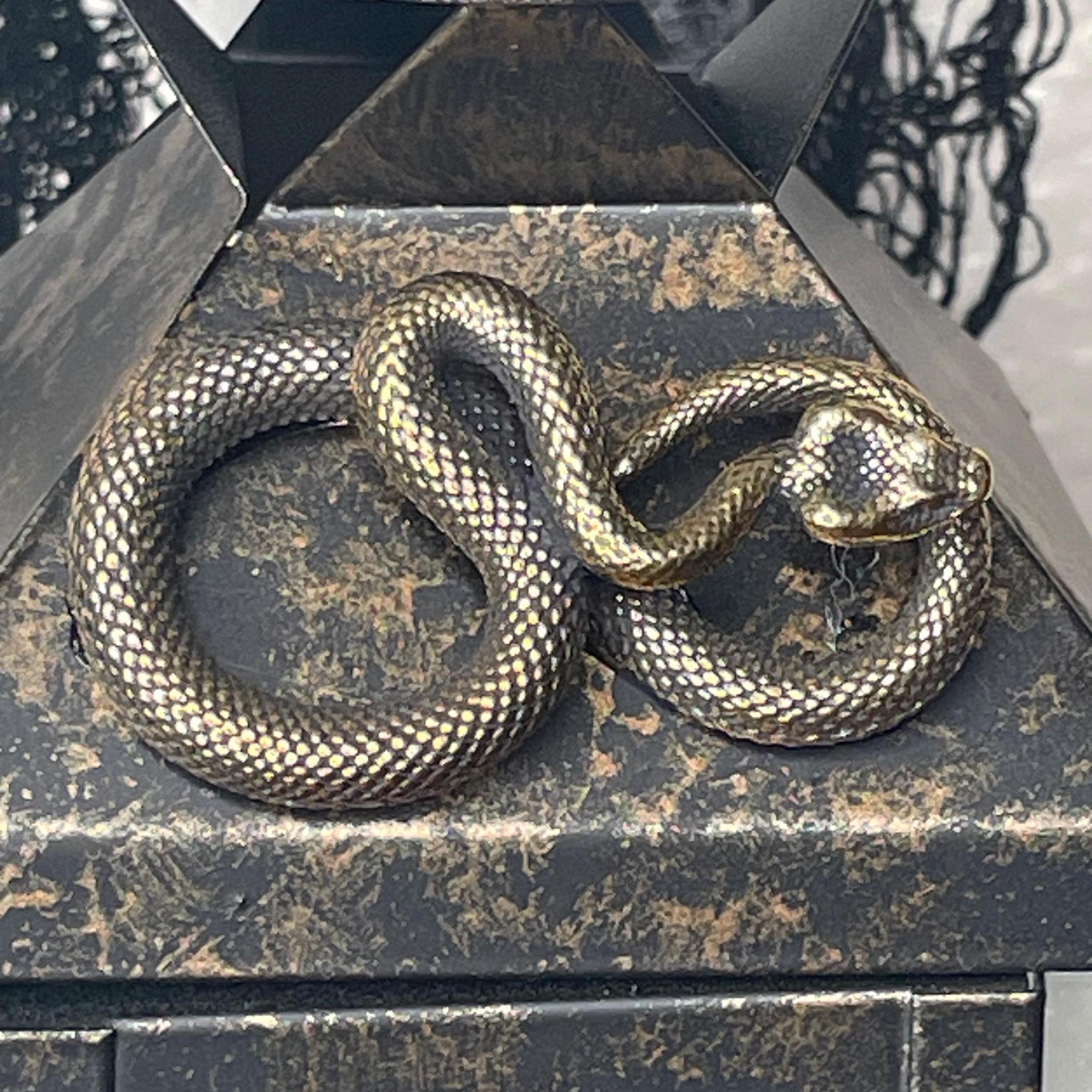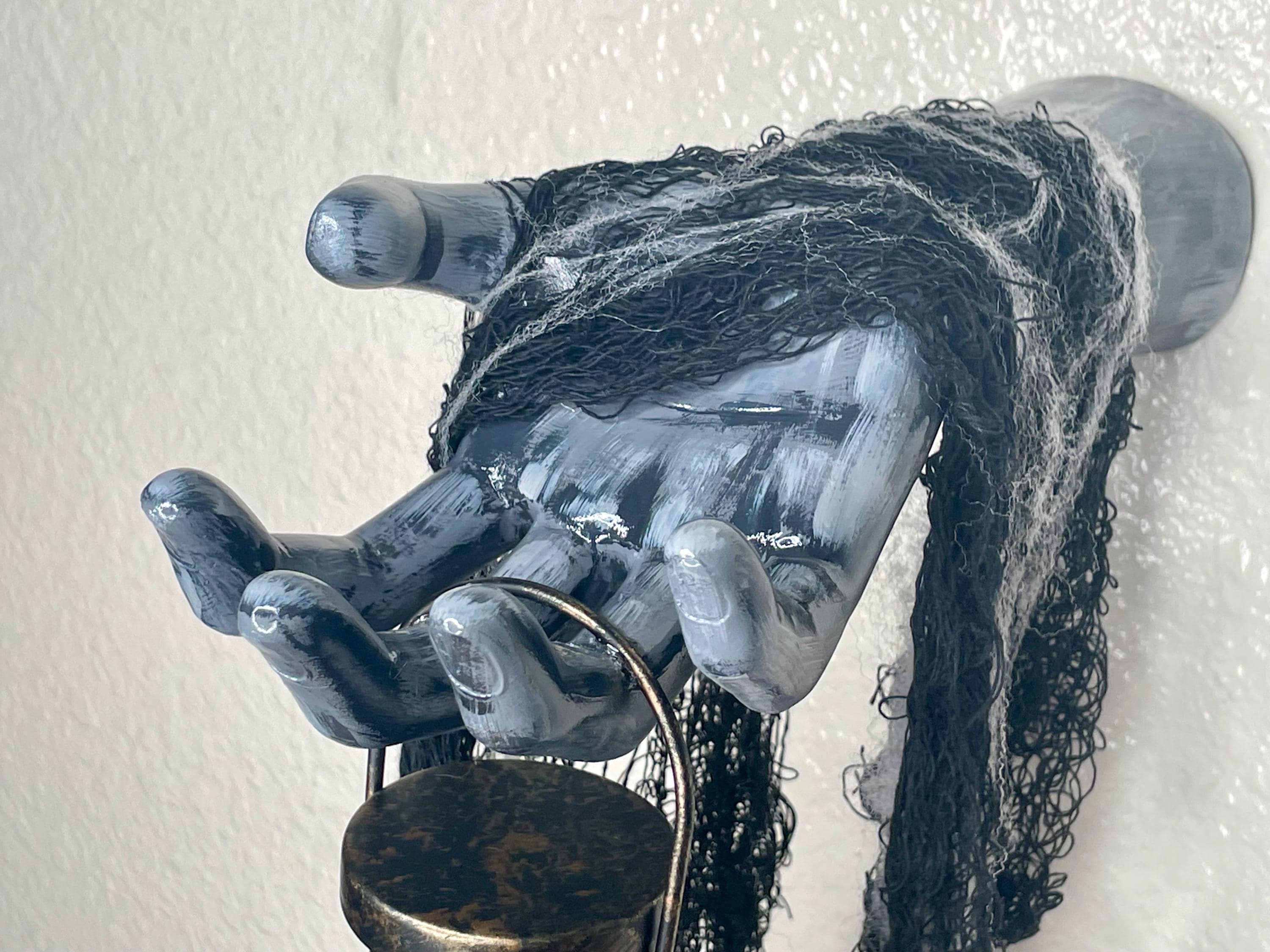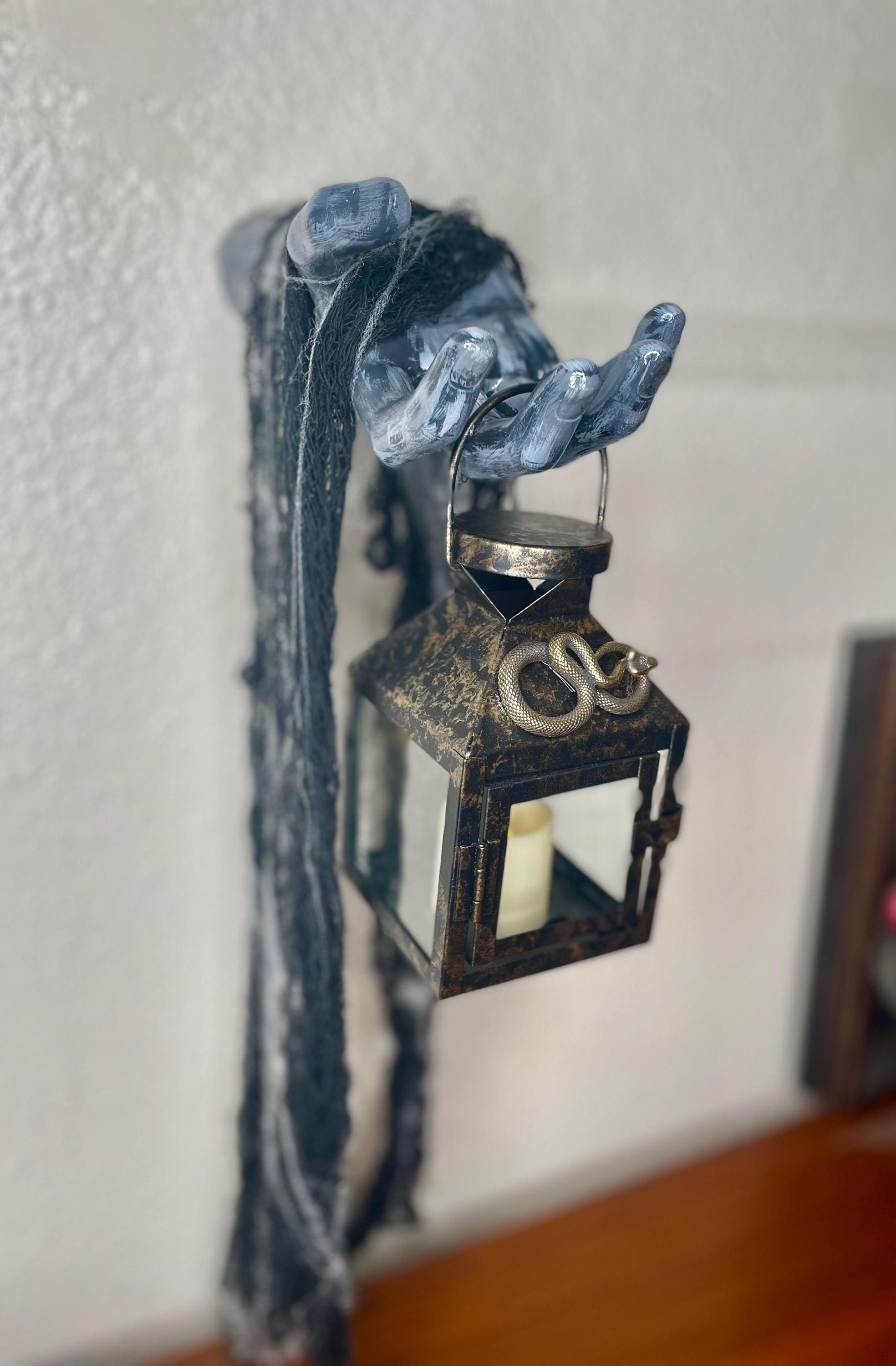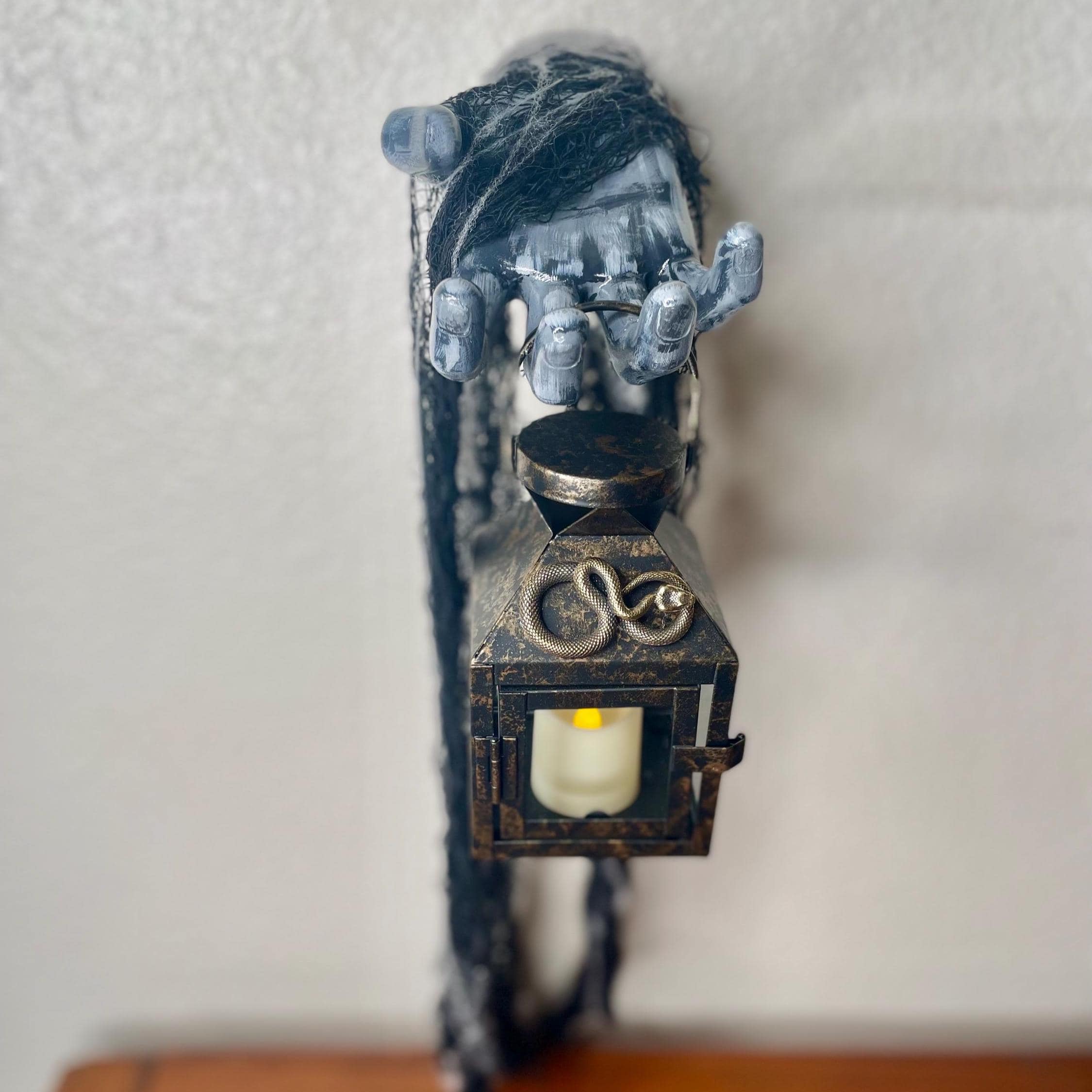 This hand painted ceramic zombie hand/arm is wall mounted with an affixed metallic snake LED candle lantern. Black fabric netting and faux spider web embellishments complete the look. Just the right amount of spooky for the zombie fan in your life!