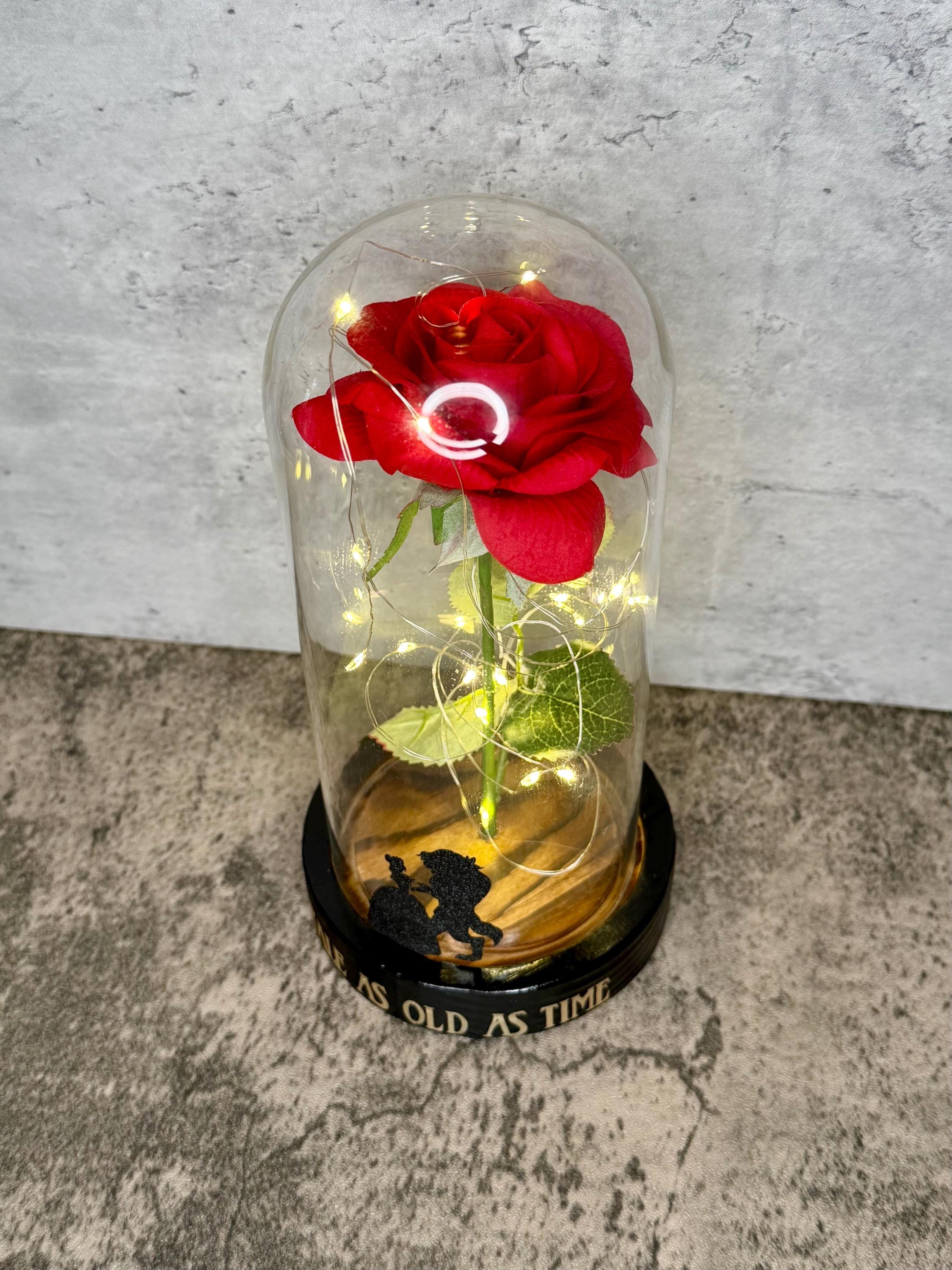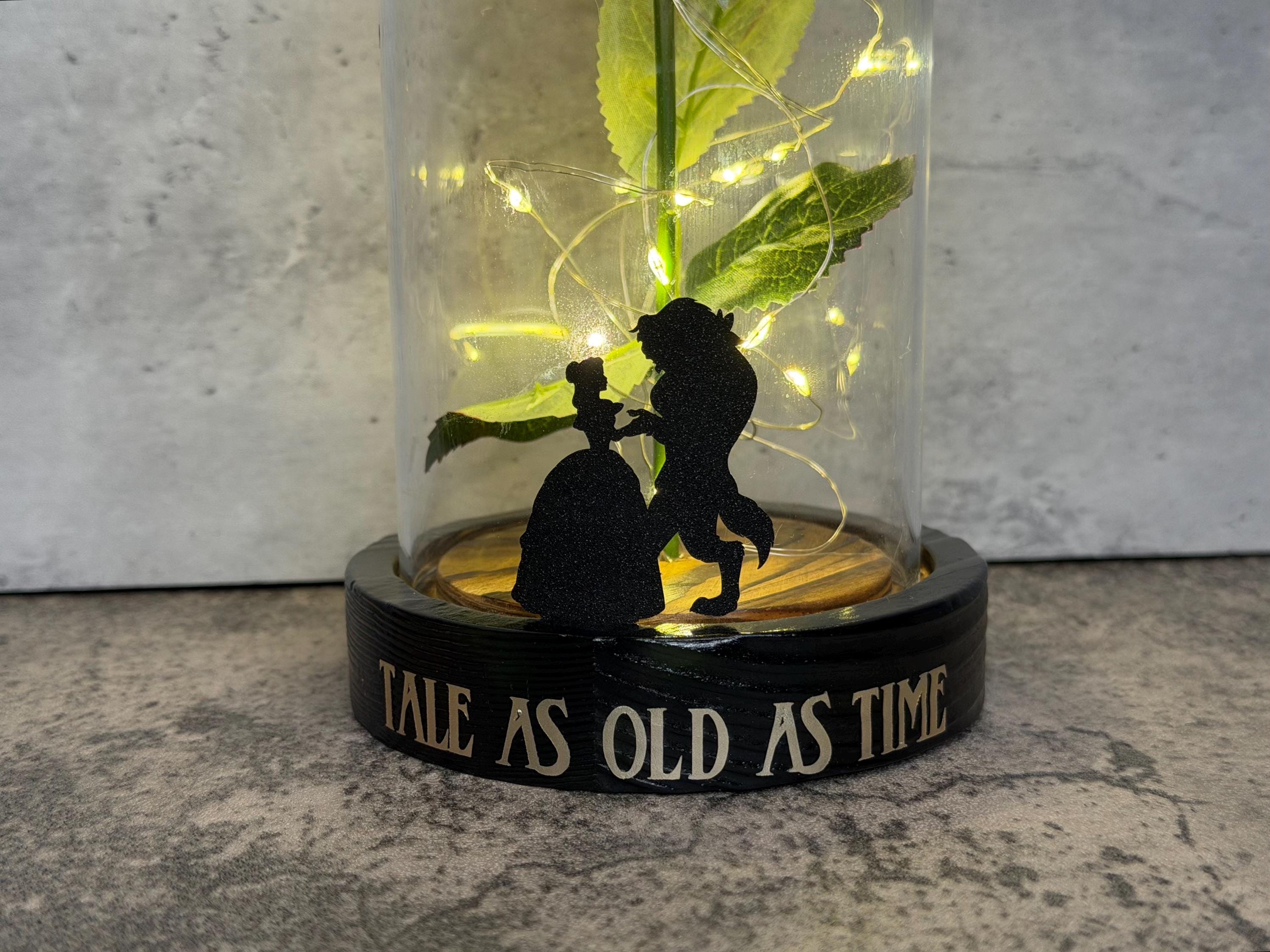 Beauty and the Beast Enchanted Rose fairy light accent with glass dome featuring an artificial light, rose and vinyl Beauty and the Beast. Wooden black base has gold vinyl lettering which reads, "Tale as Old as Time." Switch located underneath. The perfect addition to your fairytale collection!