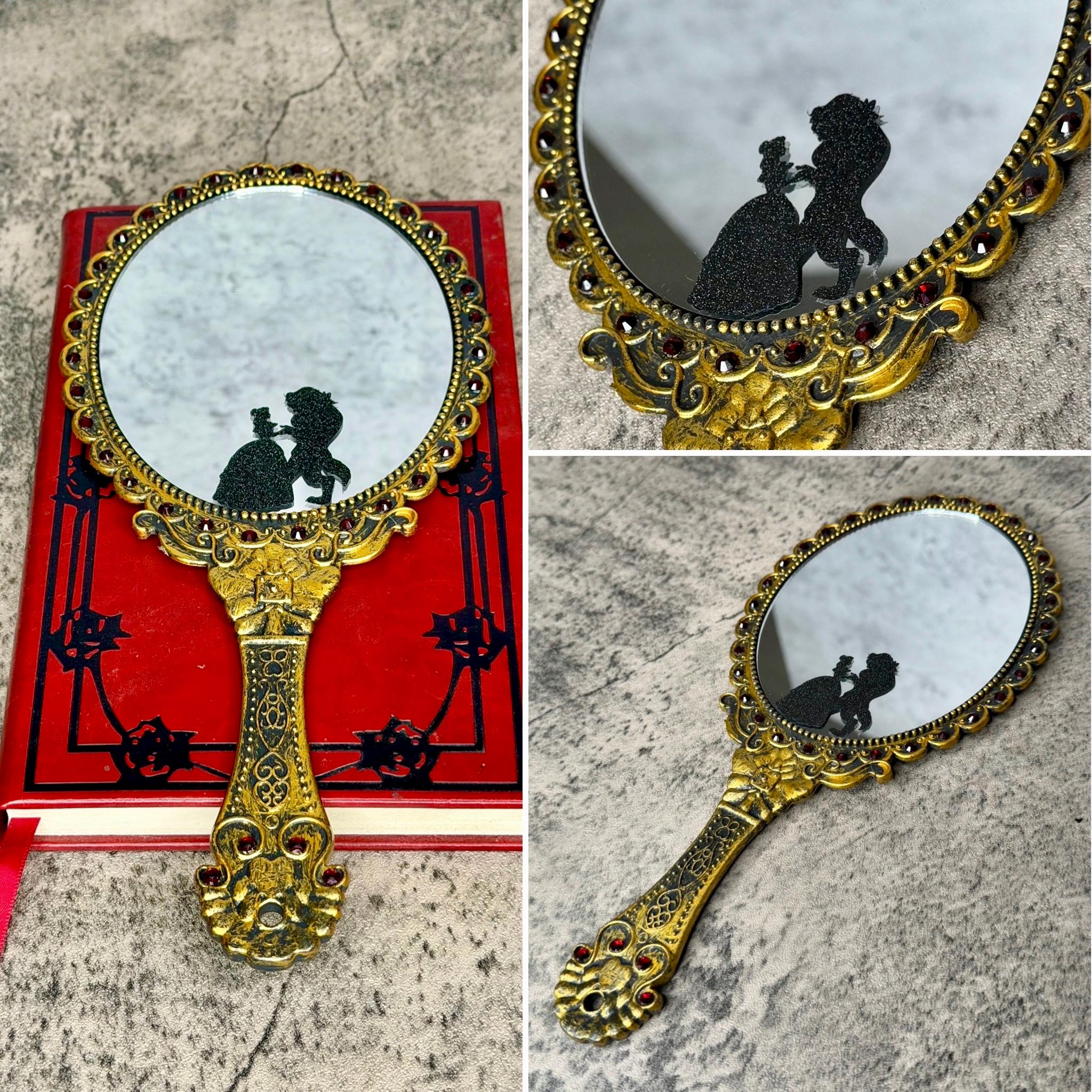 Enchanted bronze hand mirror used by Belle is made from plastic with red rhinestones and black vinyl Beauty and the Beast embellishment. The perfect addition to your Beauty and the Beast collection!