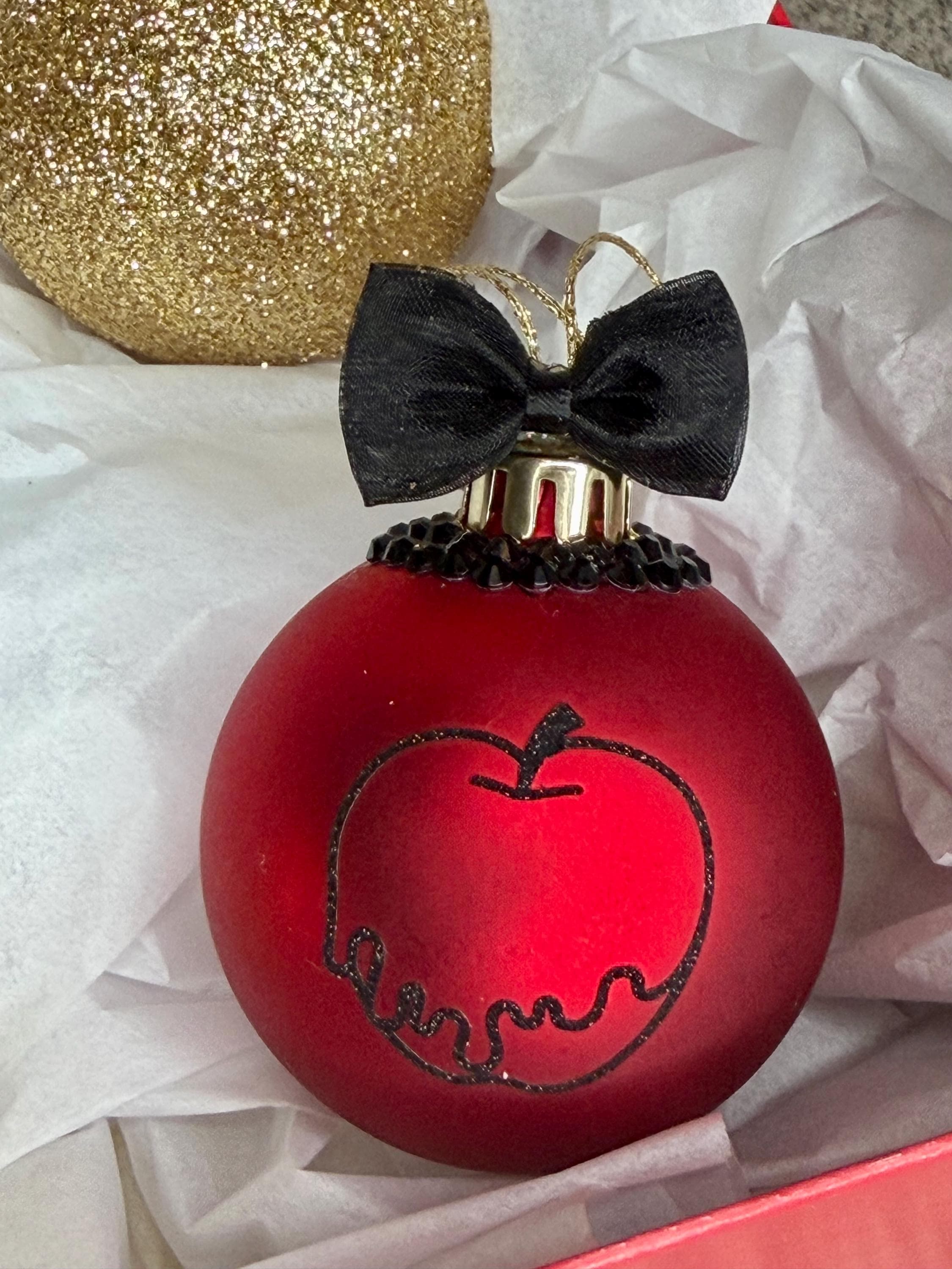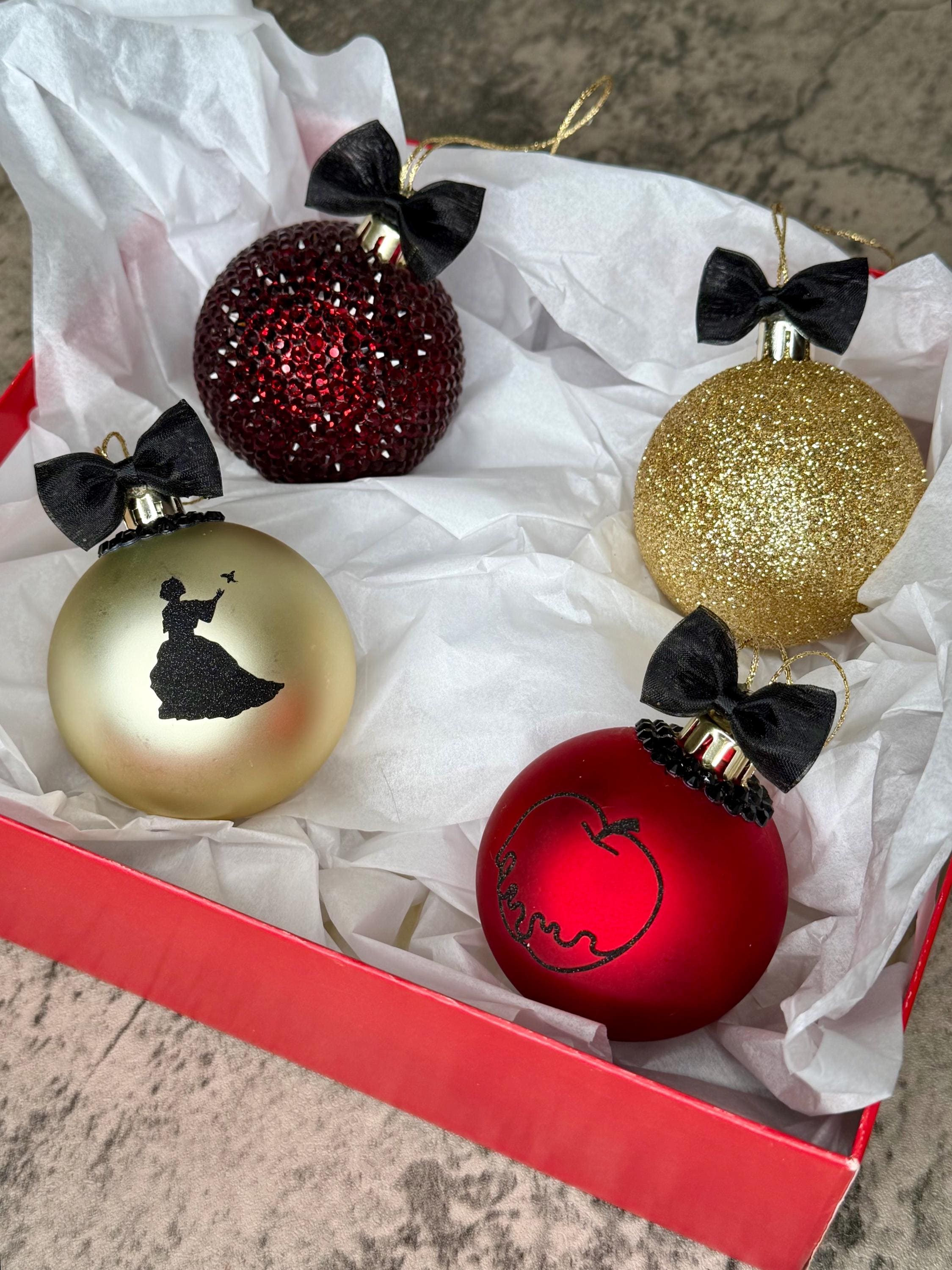 Snow white themed ornaments (Set of 4) are red and gold with black ribbon bows and gold cord. Embellishments include Snow White and poisoned apple in black lettering, red and black rhinestones, and gold glitter. Liven up your Christmas tree with these unique fairytale decorations!