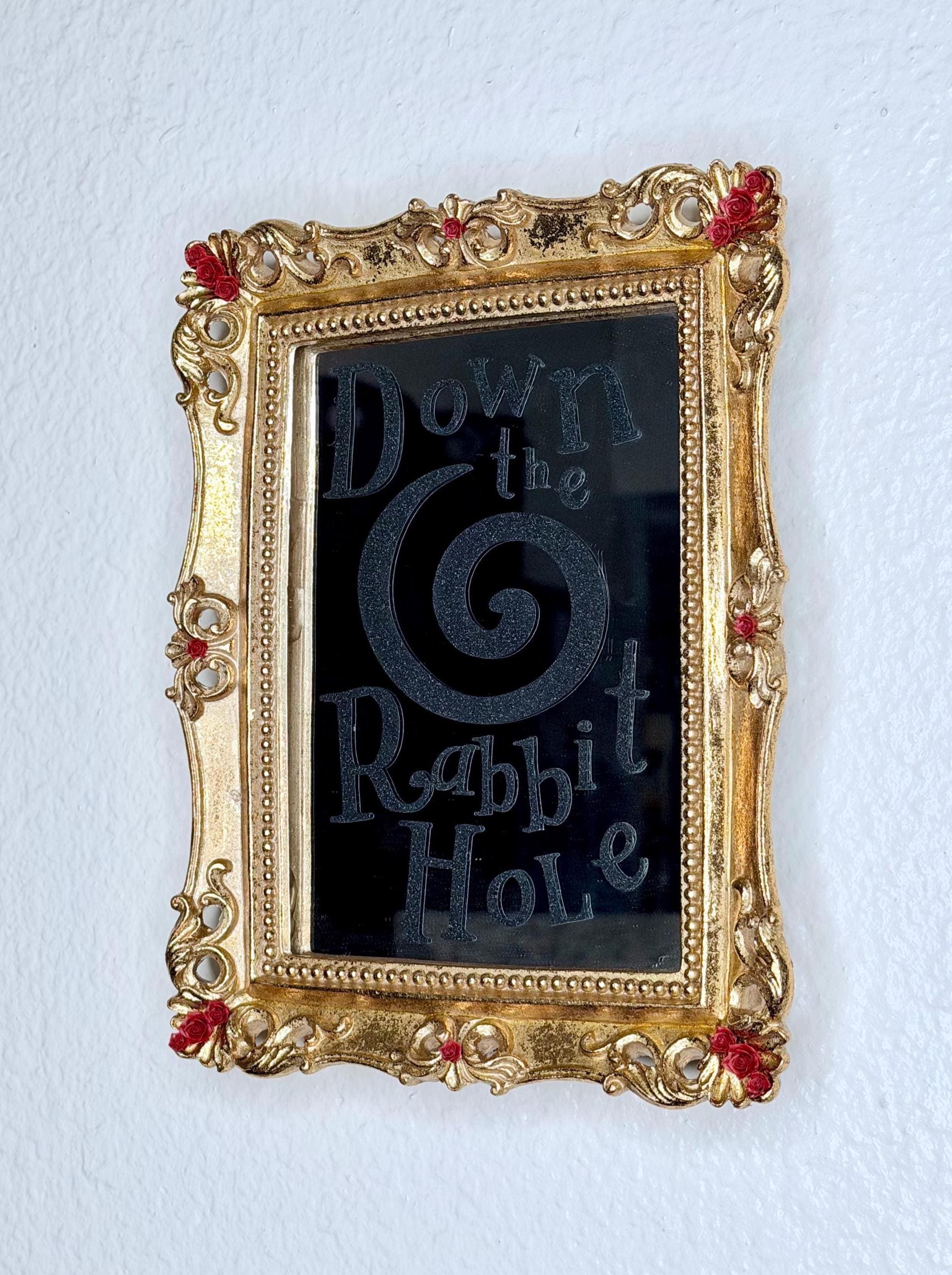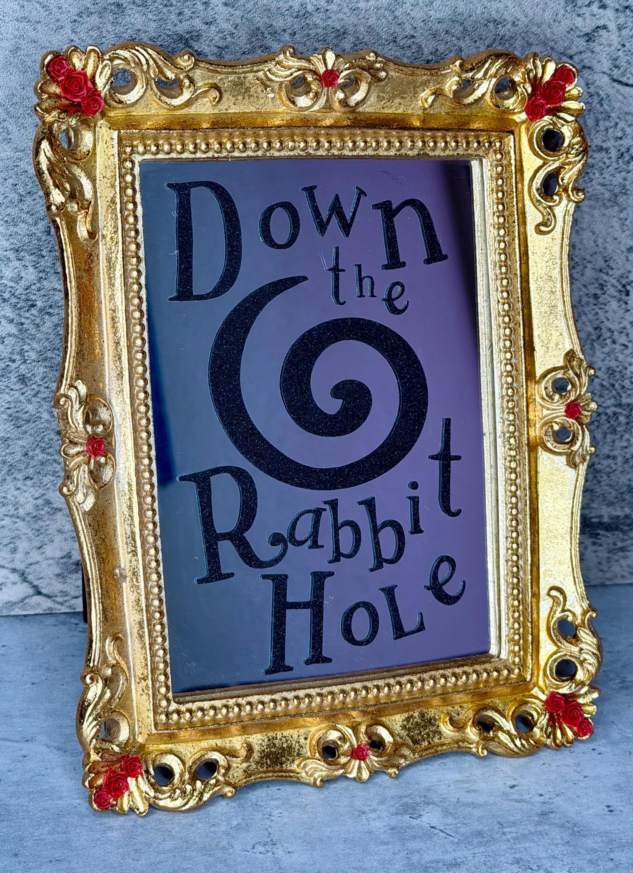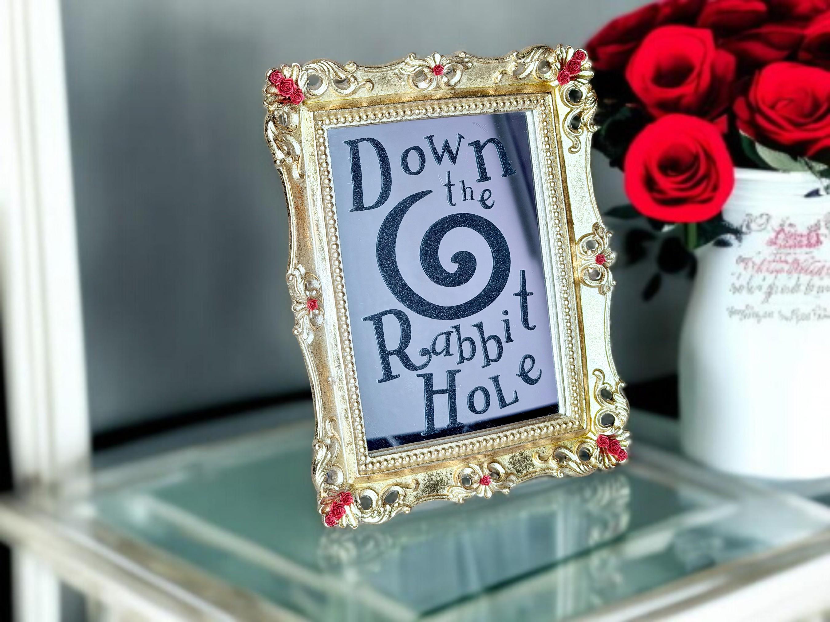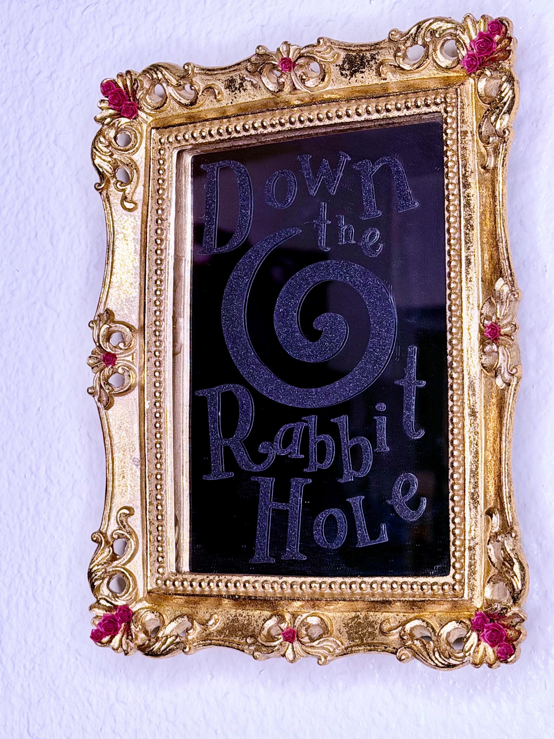 Alice in Wonderland mirror is made of resin with gold foil and red rose resin accents. Vinyl lettering on mirror reads, “Down the Rabbit Hole,” with large swirl in black glitter vinyl. Transport yourself to another world through this beautiful fairytale decoration!