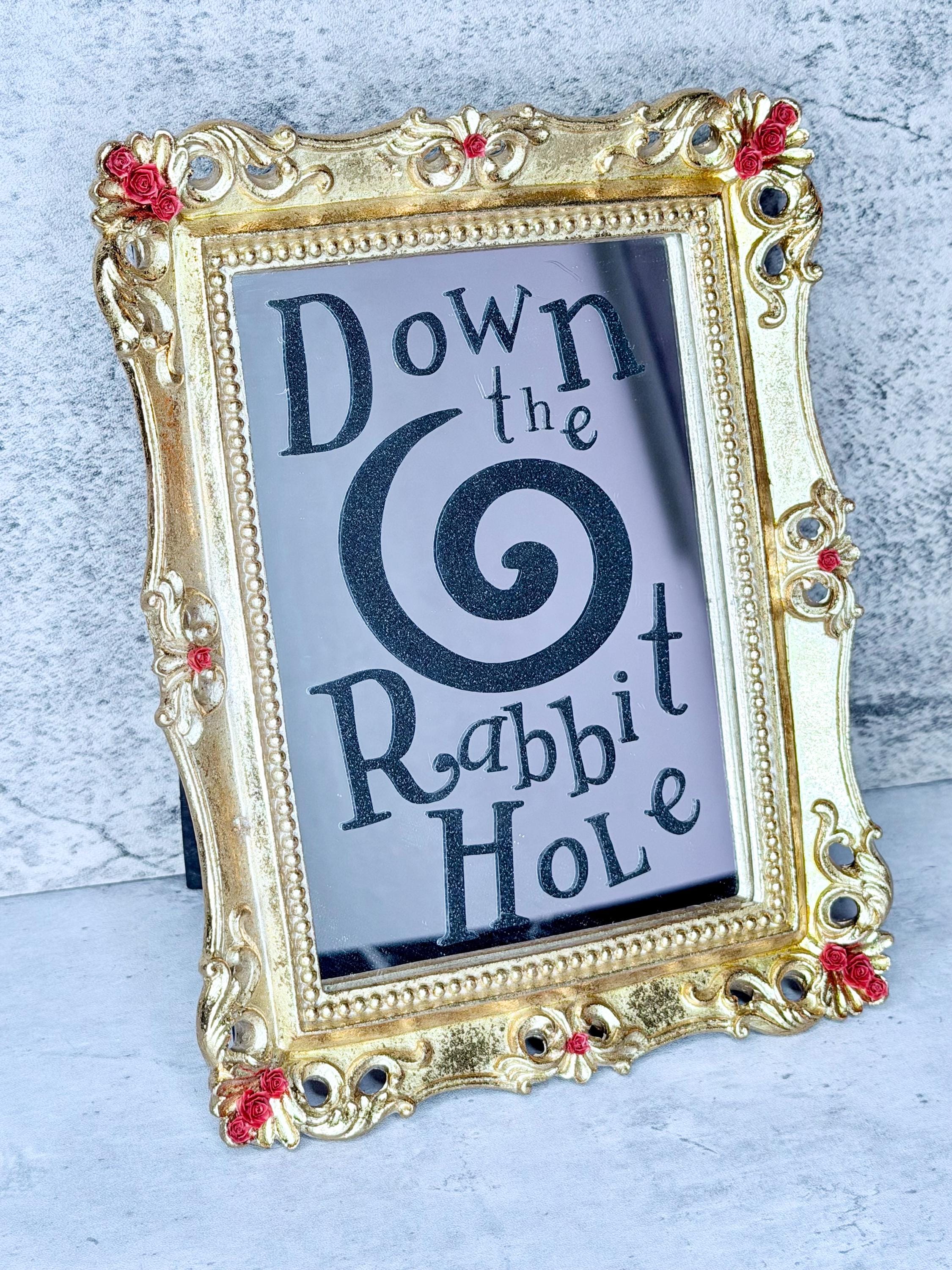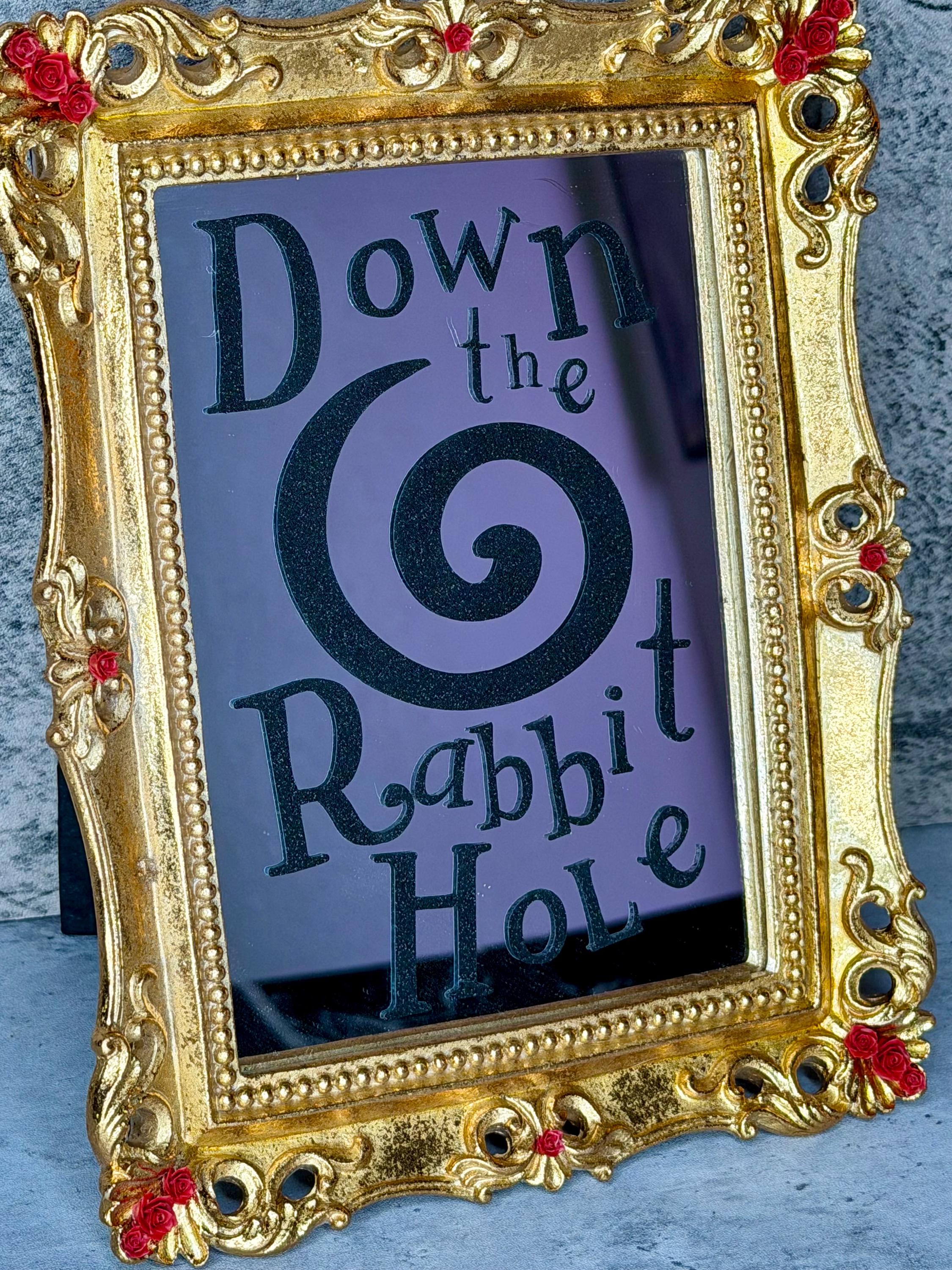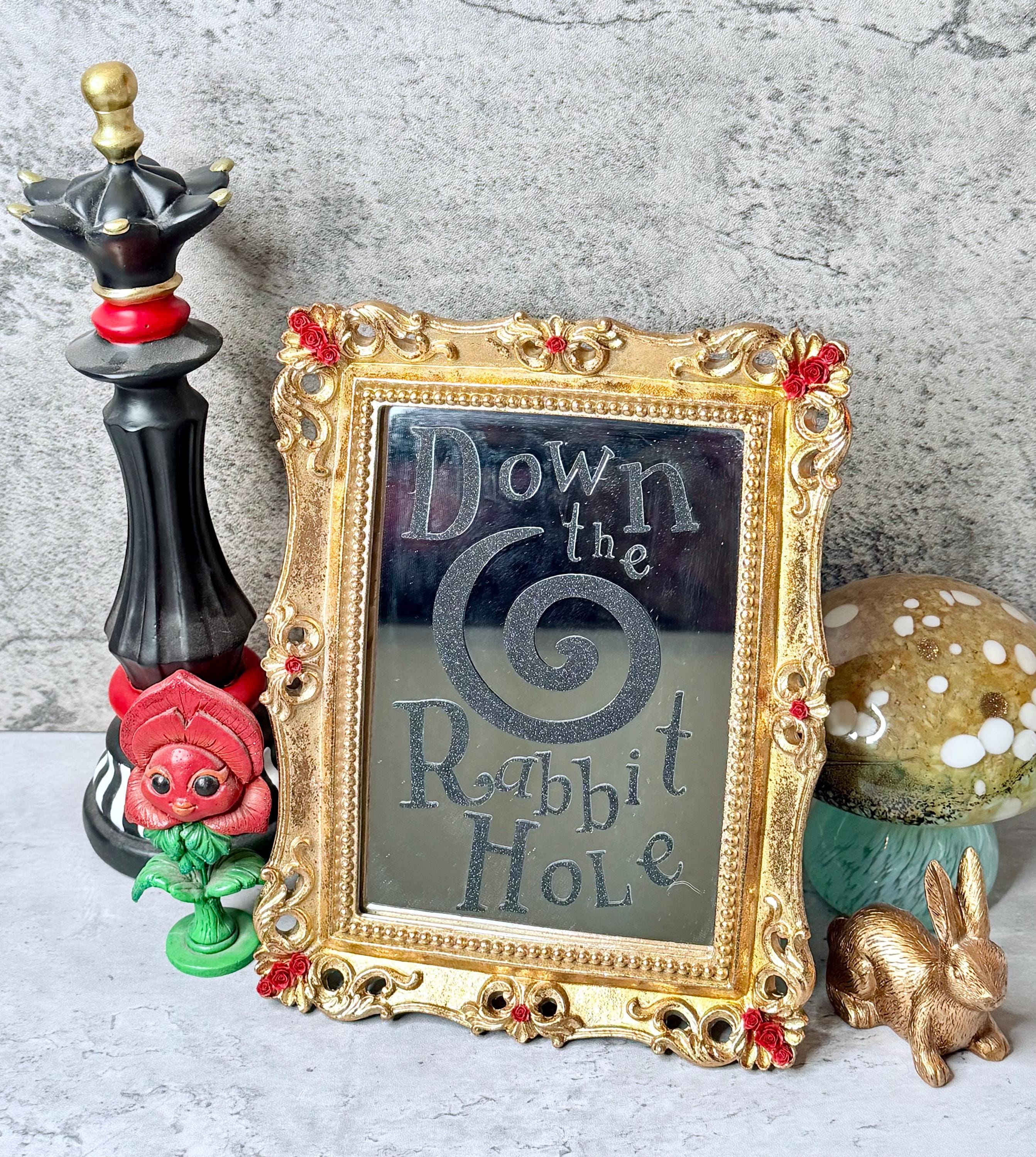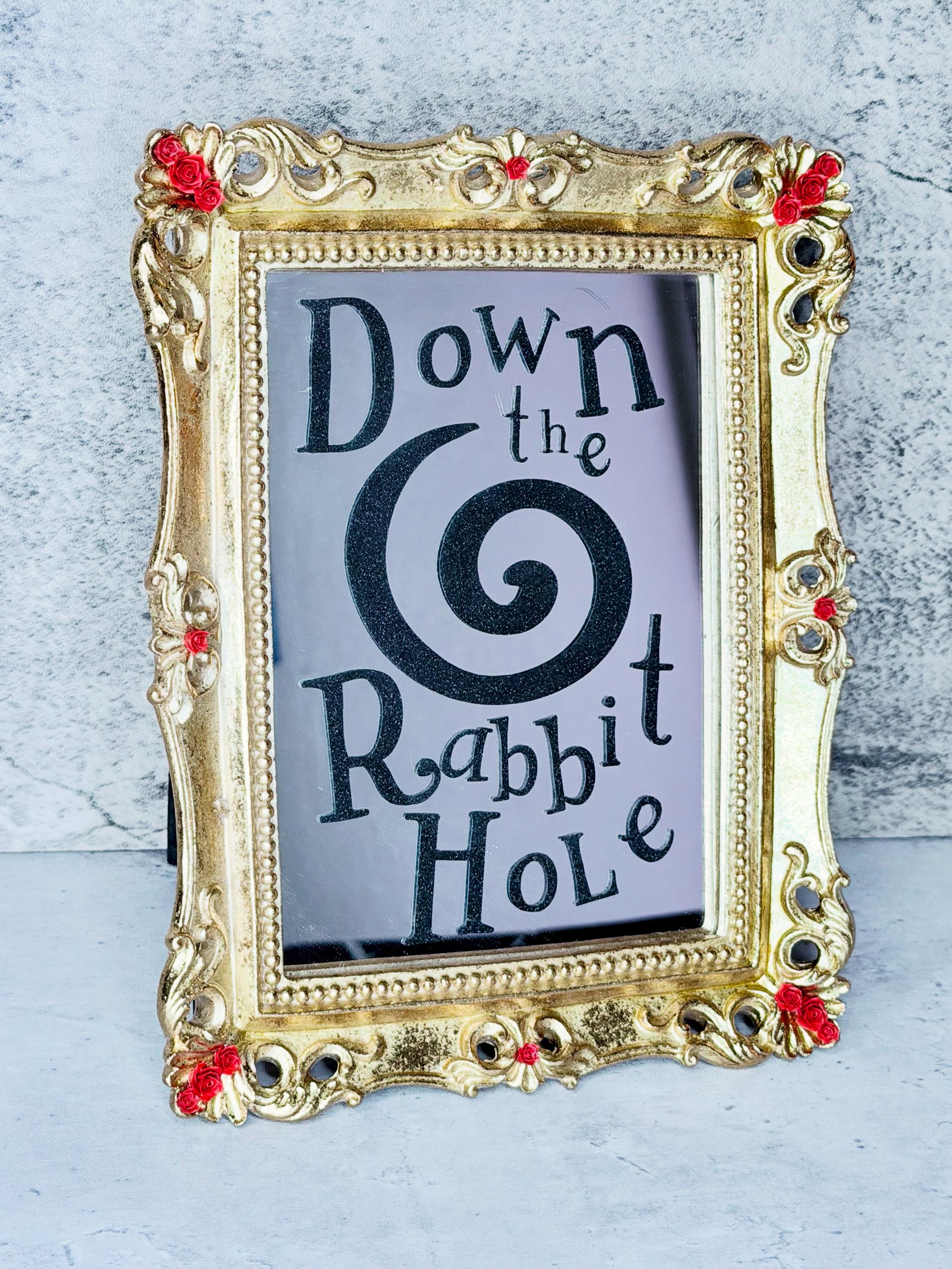 Alice in Wonderland mirror is made of resin with gold foil and red rose resin accents. Vinyl lettering on mirror reads, “Down the Rabbit Hole,” with large swirl in black glitter vinyl. Transport yourself to another world through this beautiful fairytale decoration!