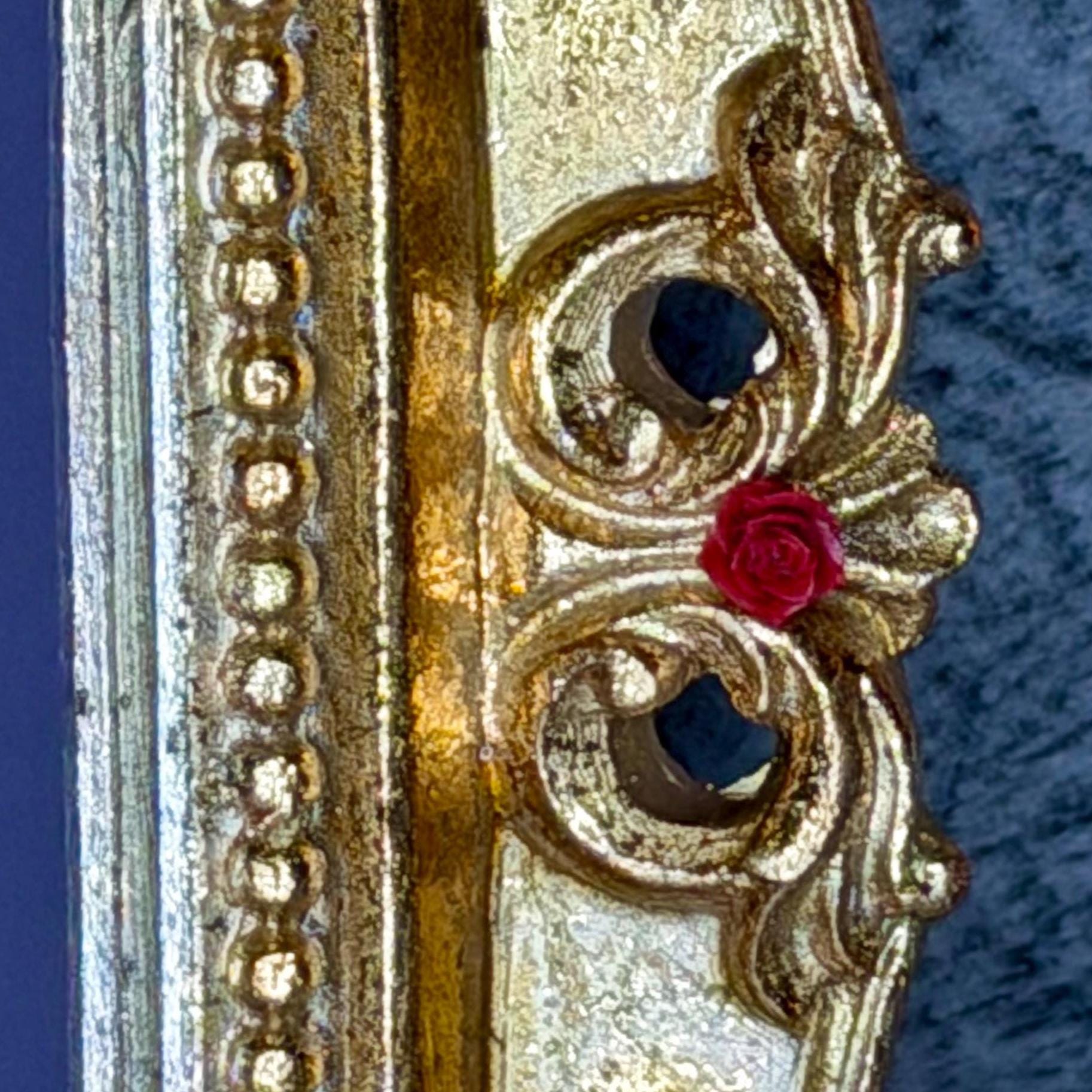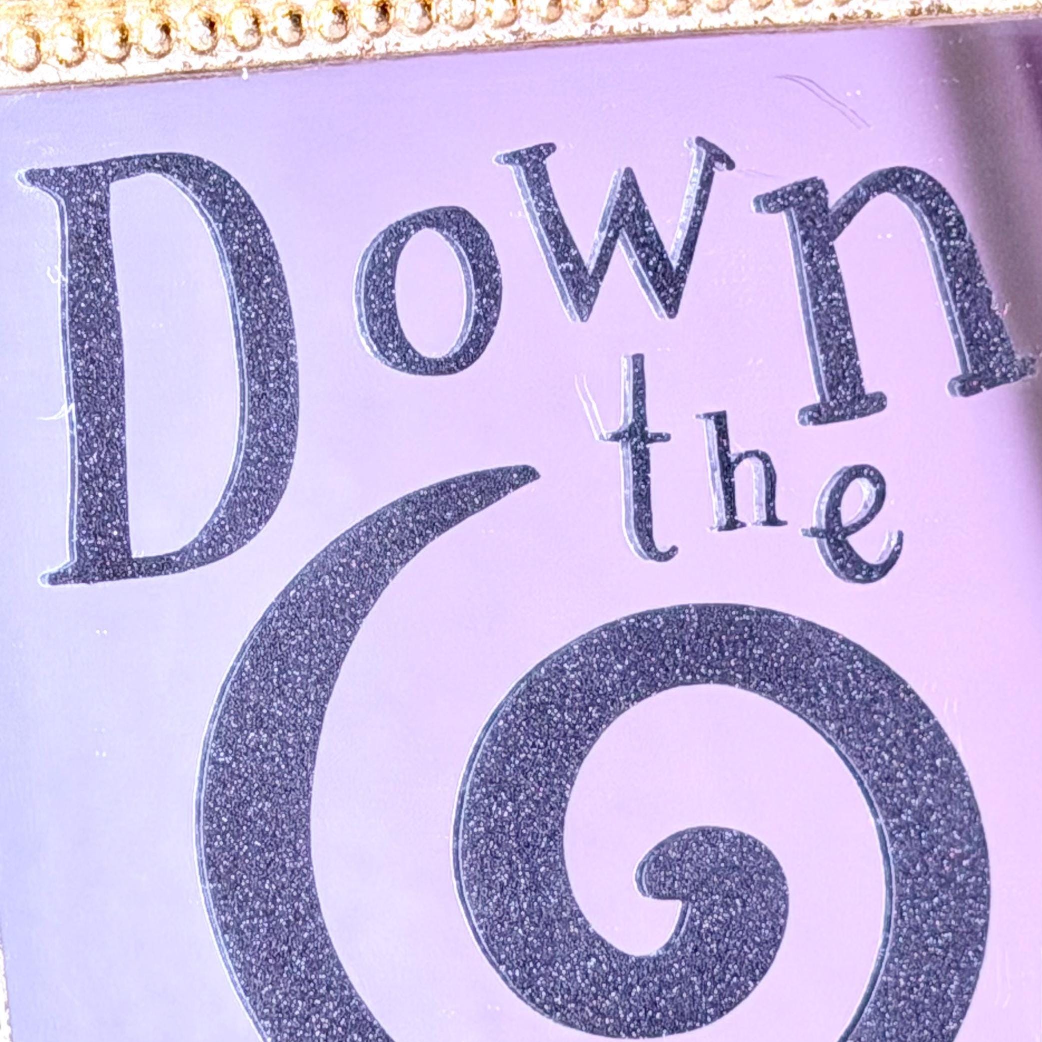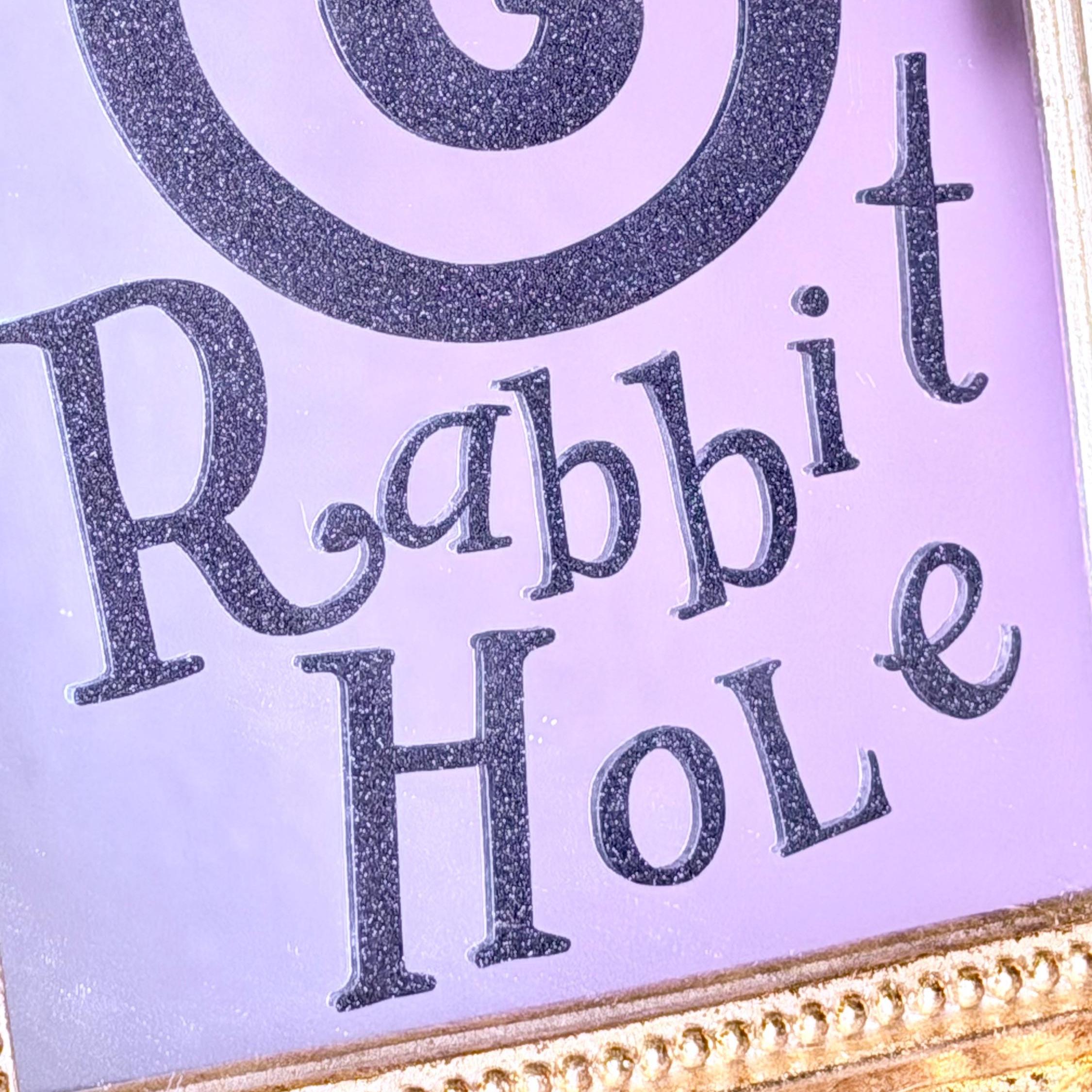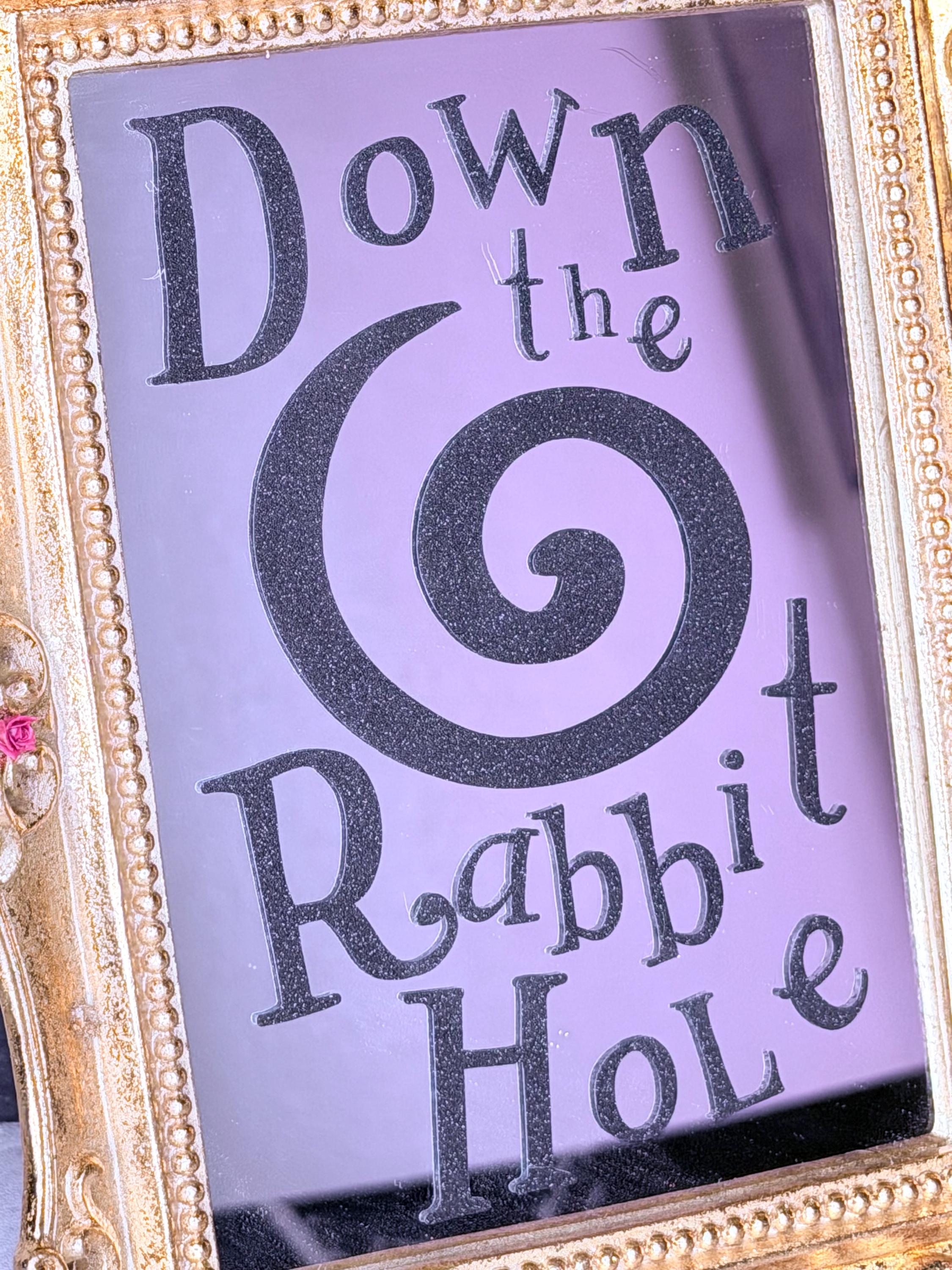 Alice in Wonderland mirror is made of resin with gold foil and red rose resin accents. Vinyl lettering on mirror reads, “Down the Rabbit Hole,” with large swirl in black glitter vinyl. Transport yourself to another world through this beautiful fairytale decoration!