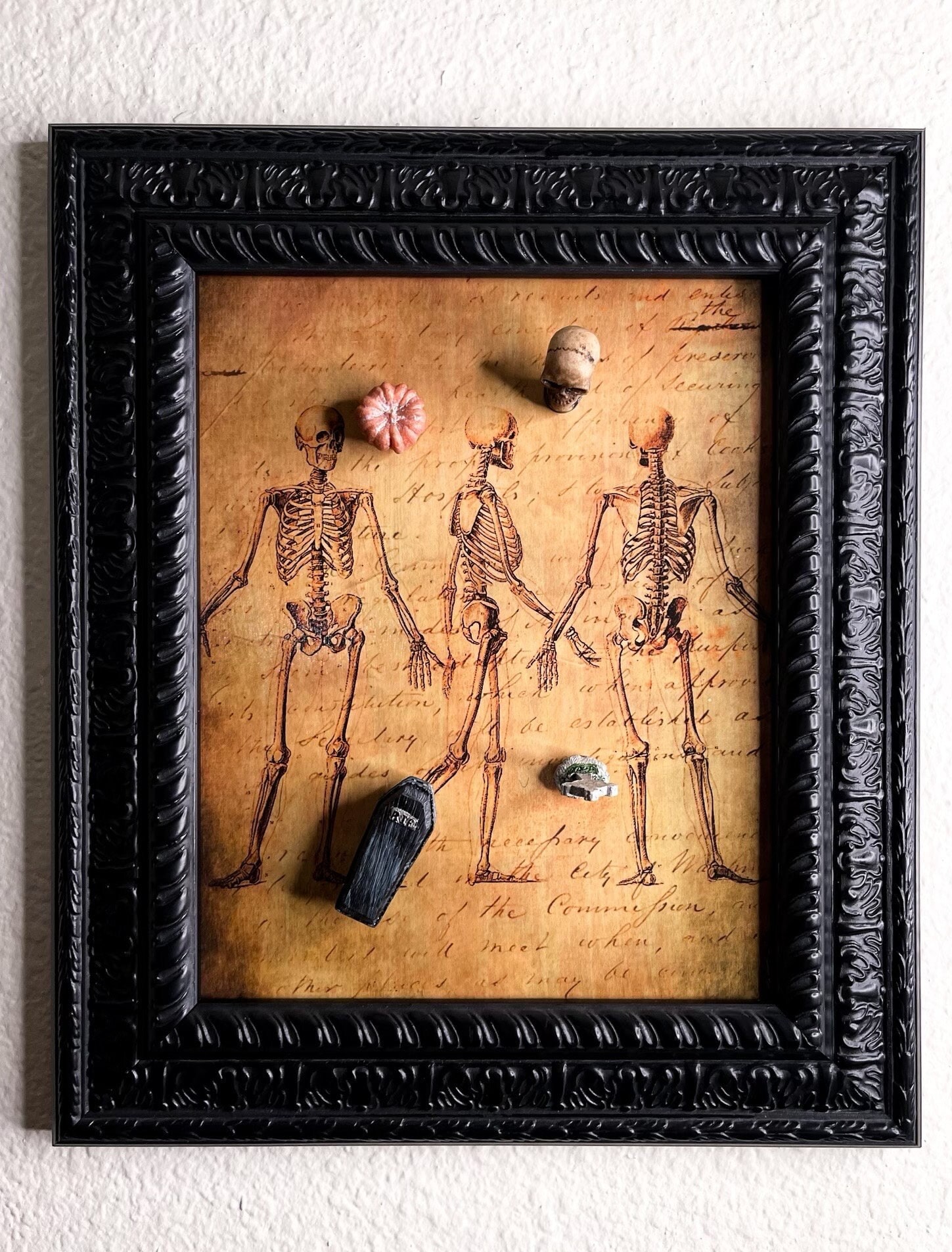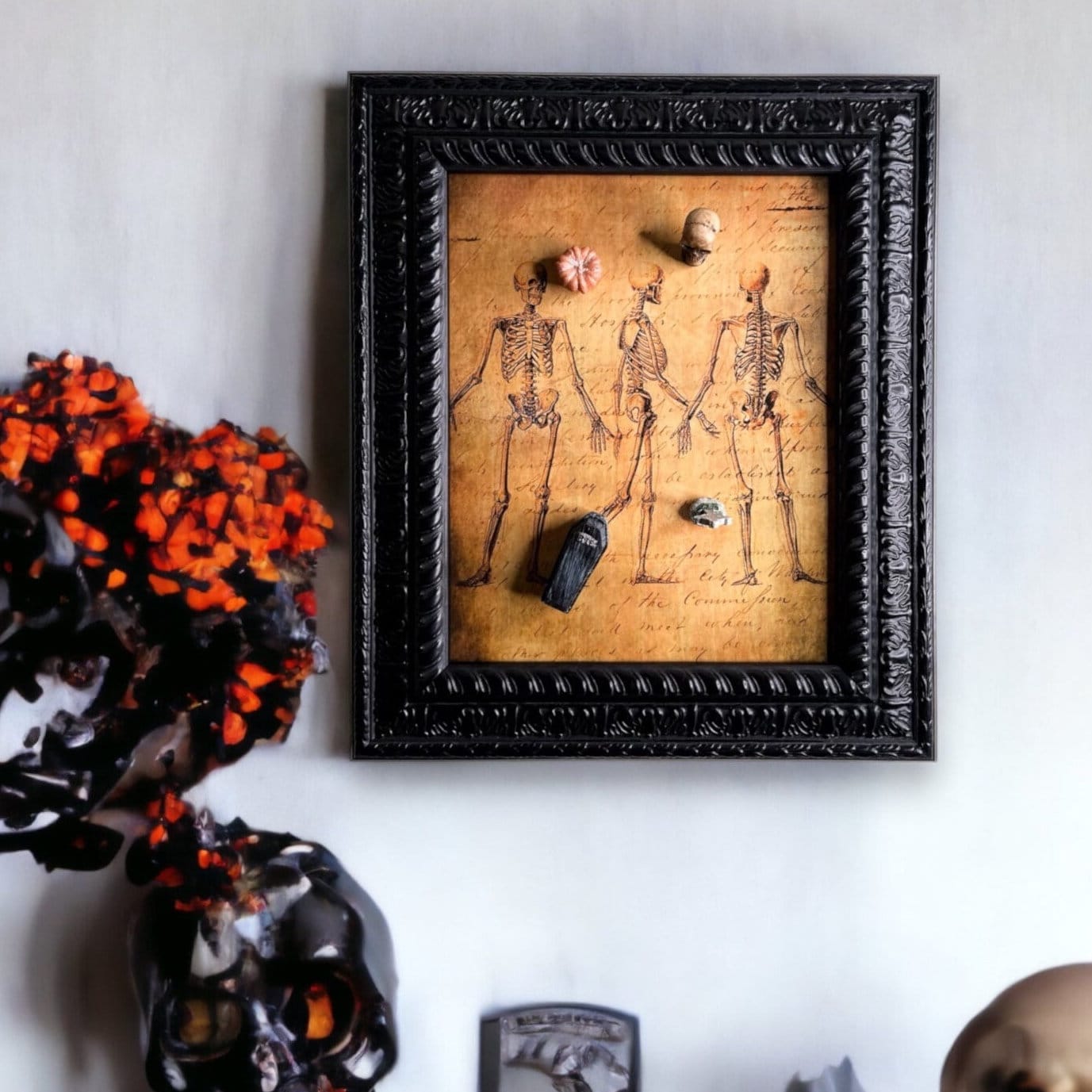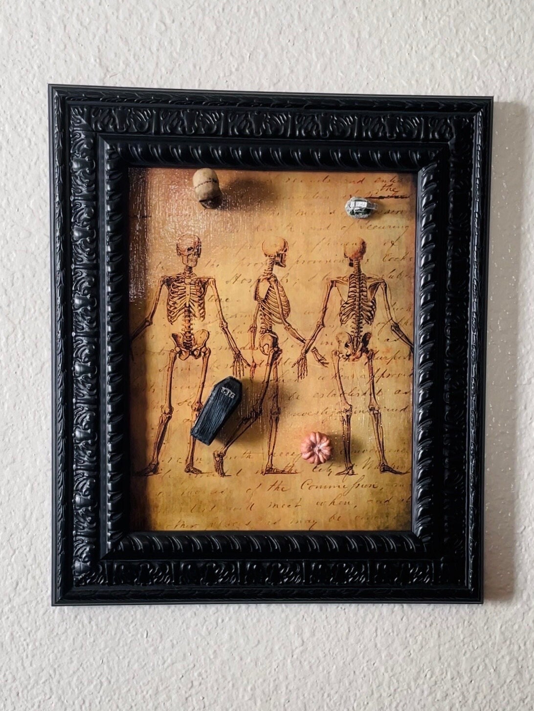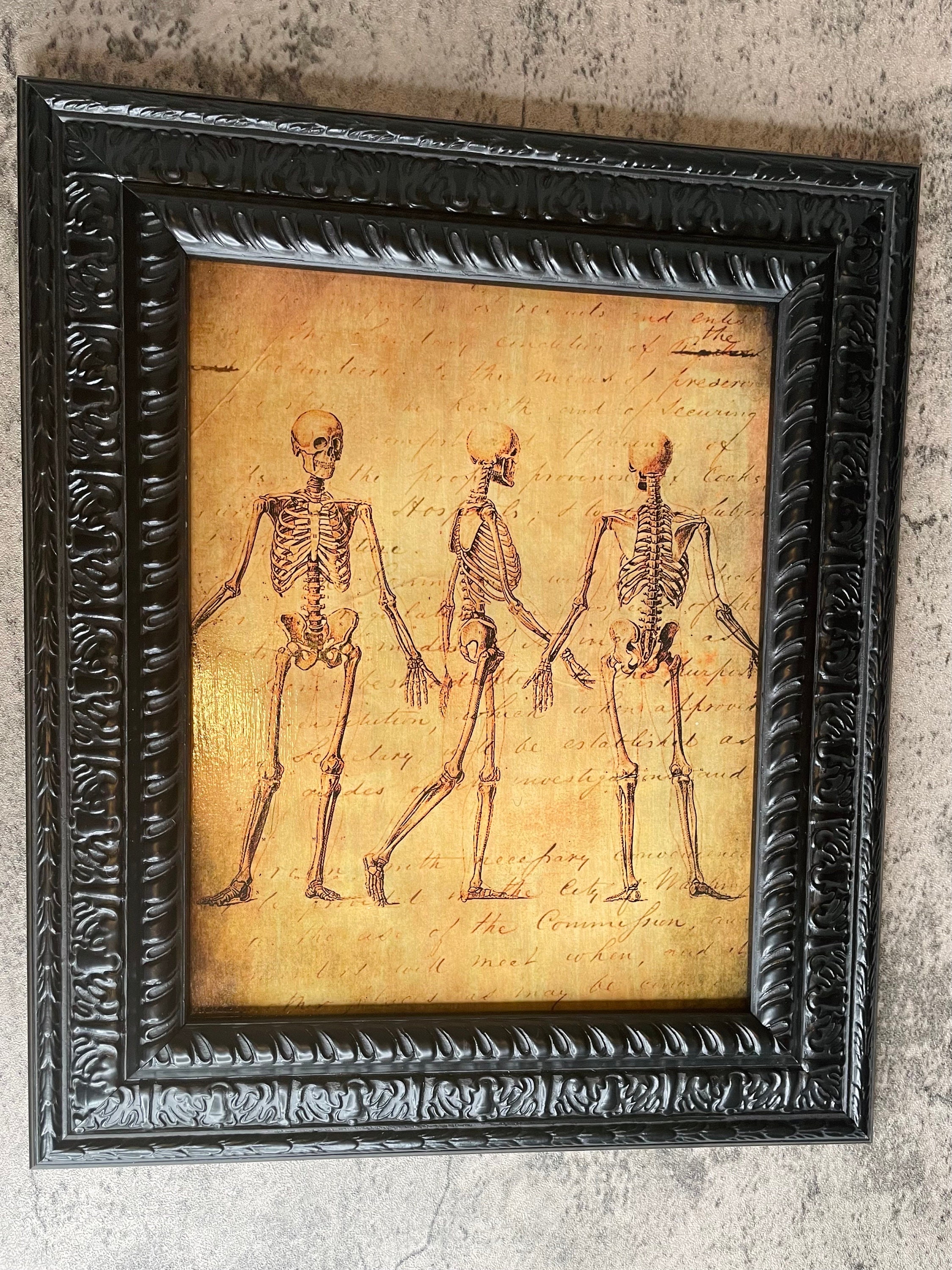 Gothic magnet board (8” x 10”) depicts a decoupaged skeletal theme and black scroll wooden wall frame. Four resin magnets including a coffin, skull, pumpkin, and tombstone are also provided. Experience Halloween everyday with this fun interactive decoration!