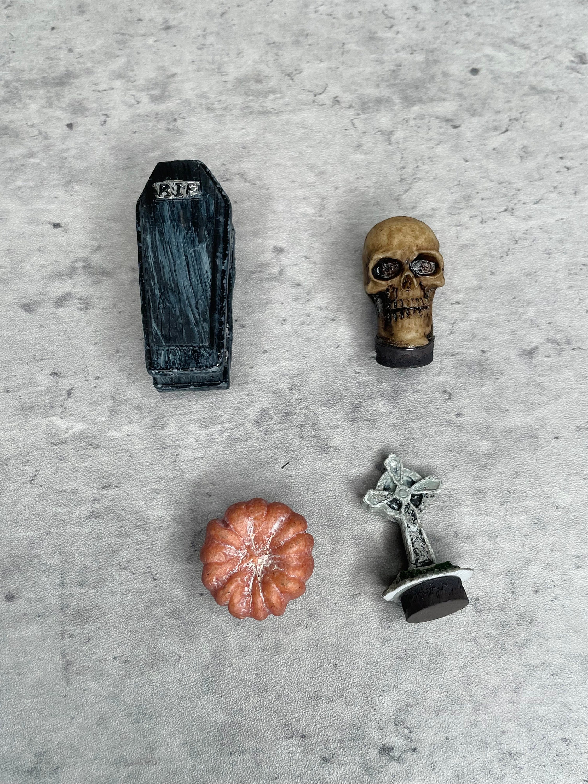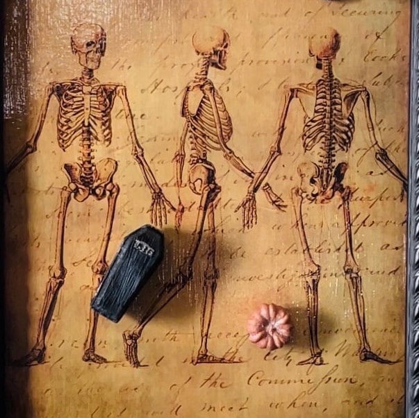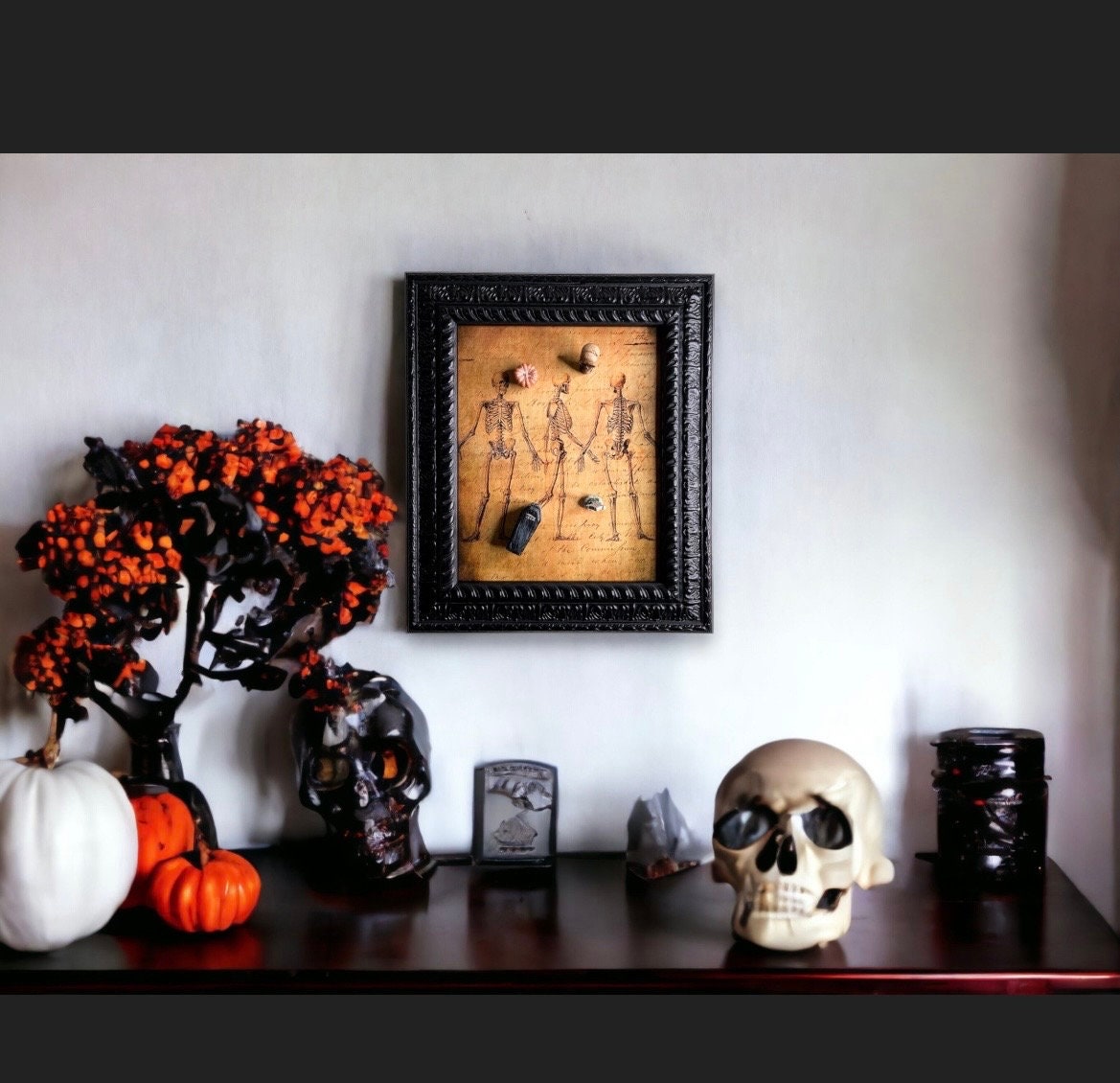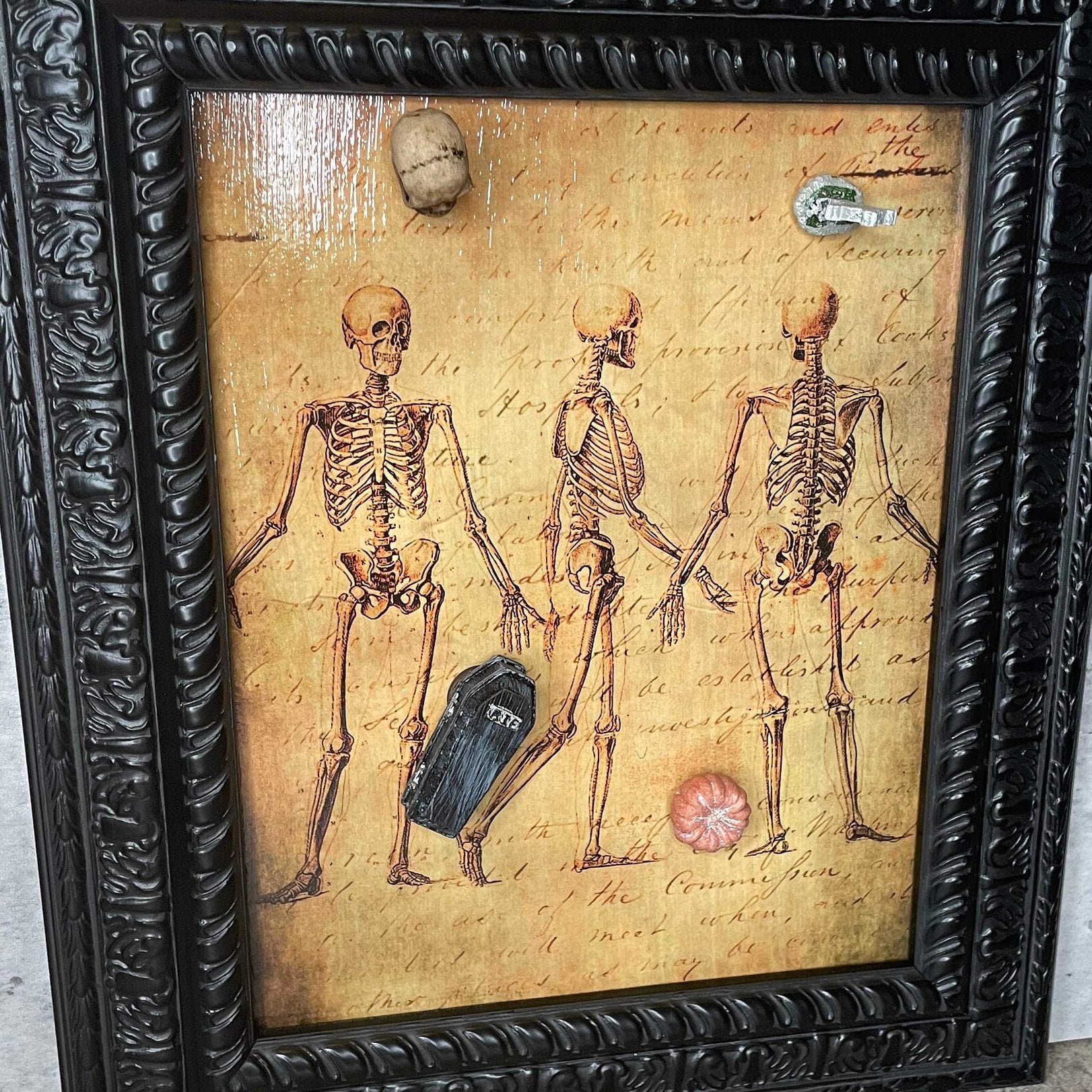 Gothic magnet board (8” x 10”) depicts a decoupaged skeletal theme and black scroll wooden wall frame. Four resin magnets including a coffin, skull, pumpkin, and tombstone are also provided. Experience Halloween everyday with this fun interactive decoration!